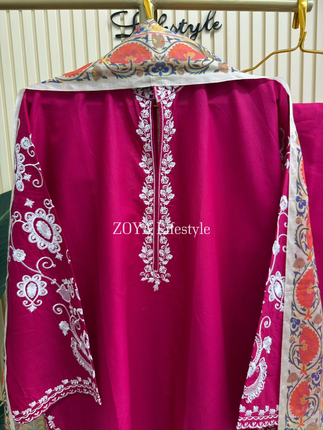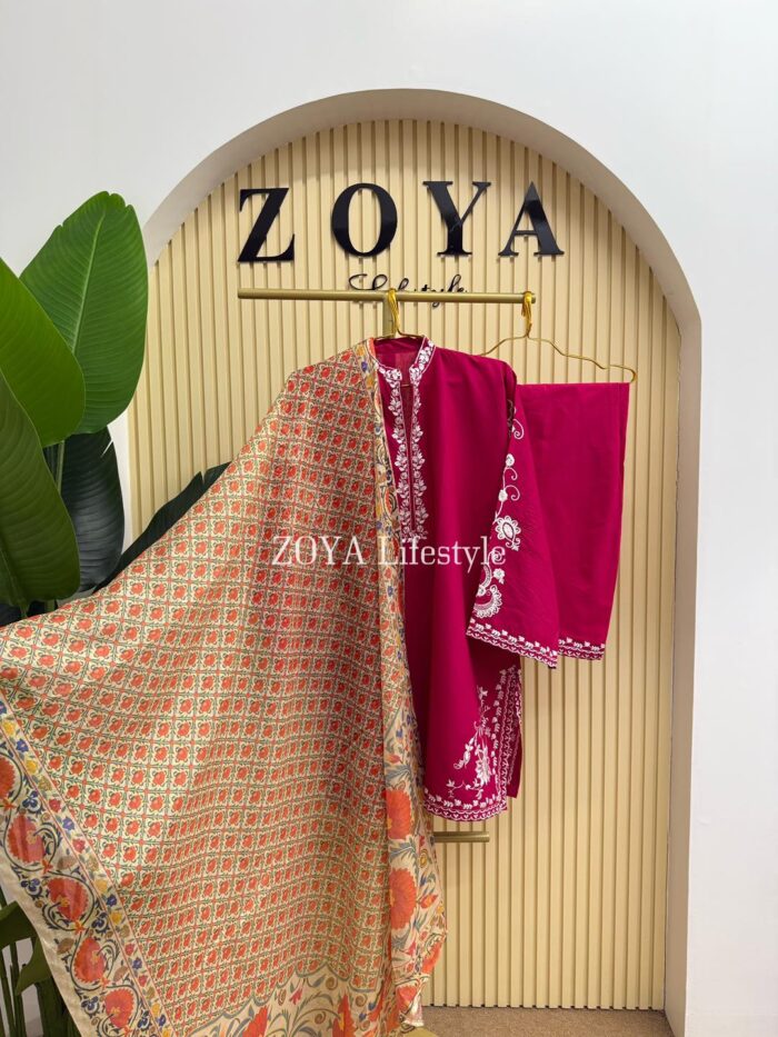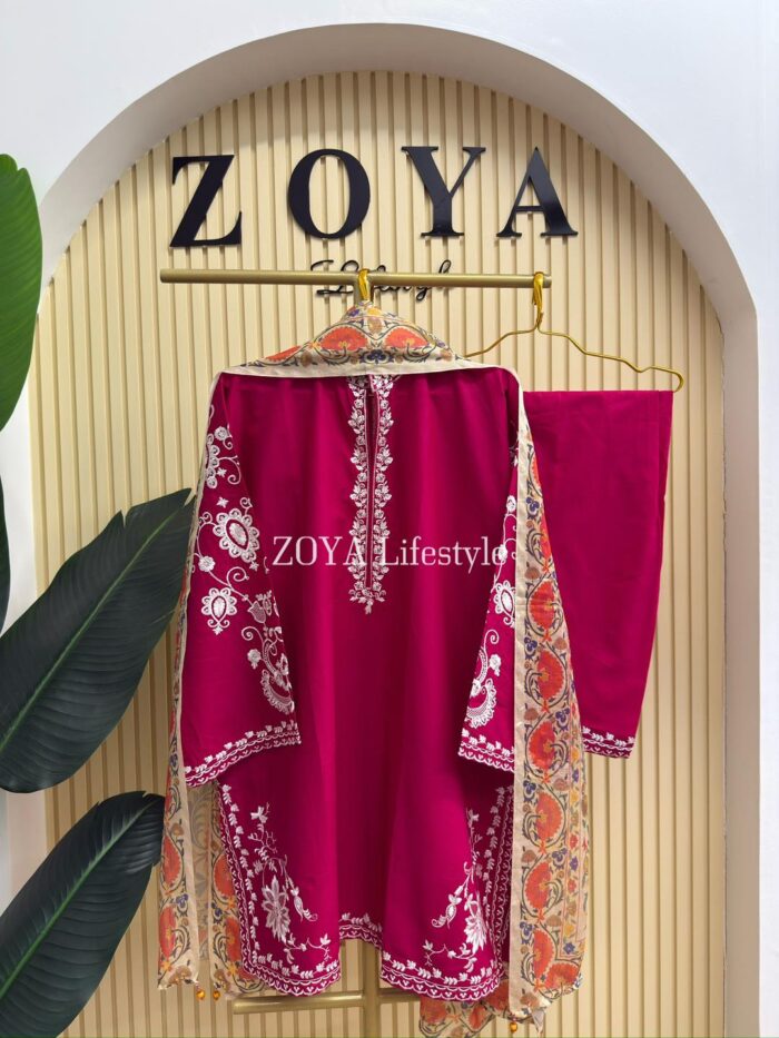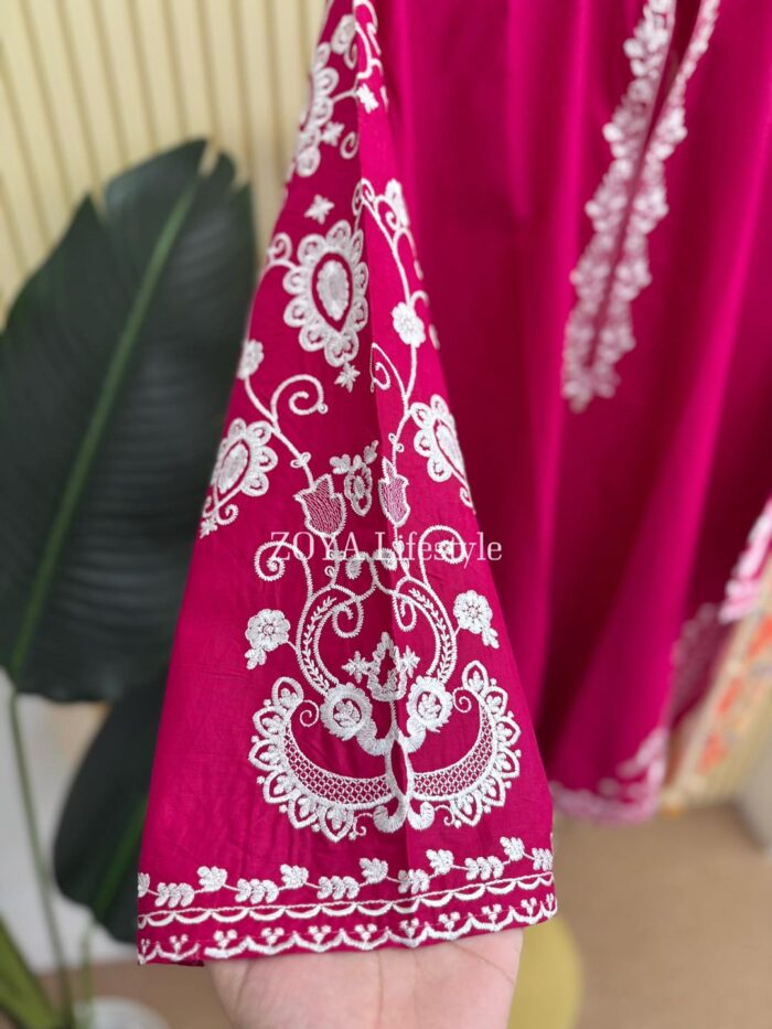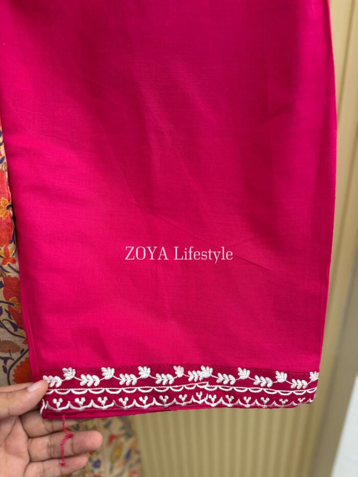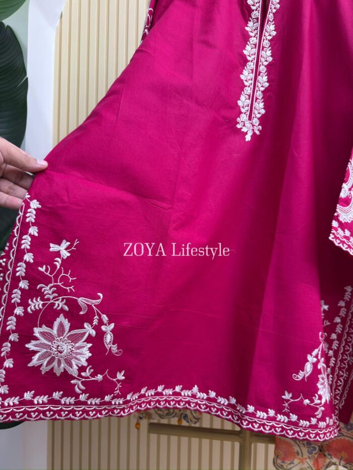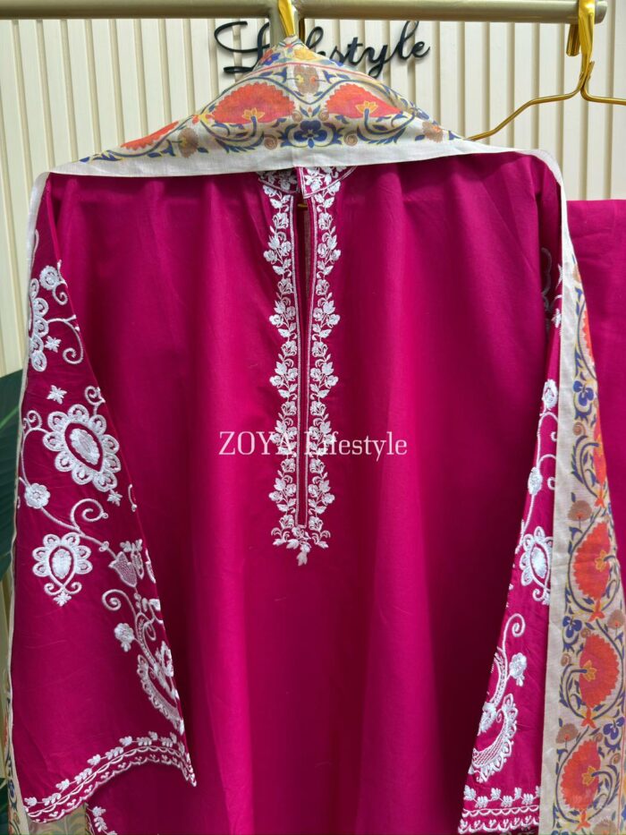 Material: Cotton kamiz with embroidery work on full body front and back. Farshi Pant Cotton with embroidery work. Maisuri silk cotton printed dupatta.
