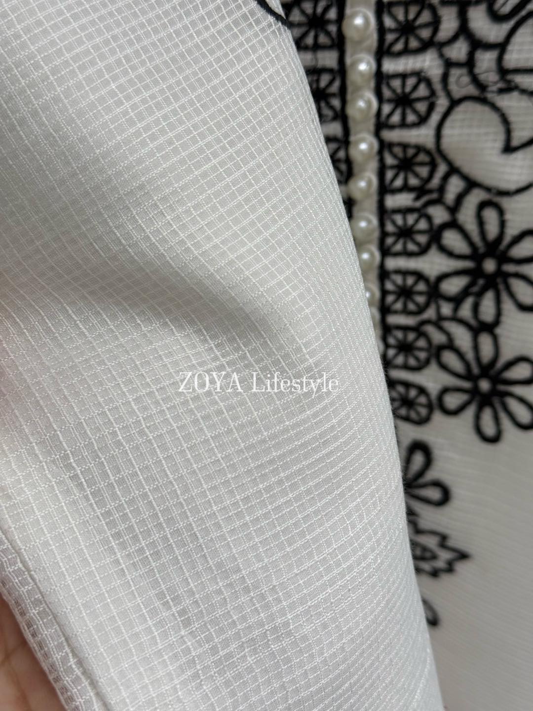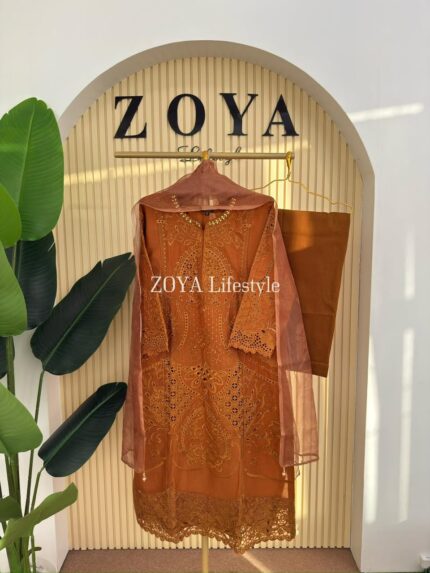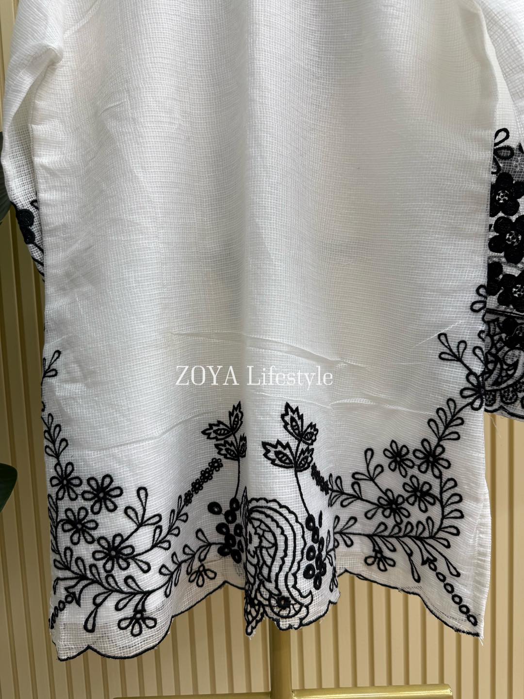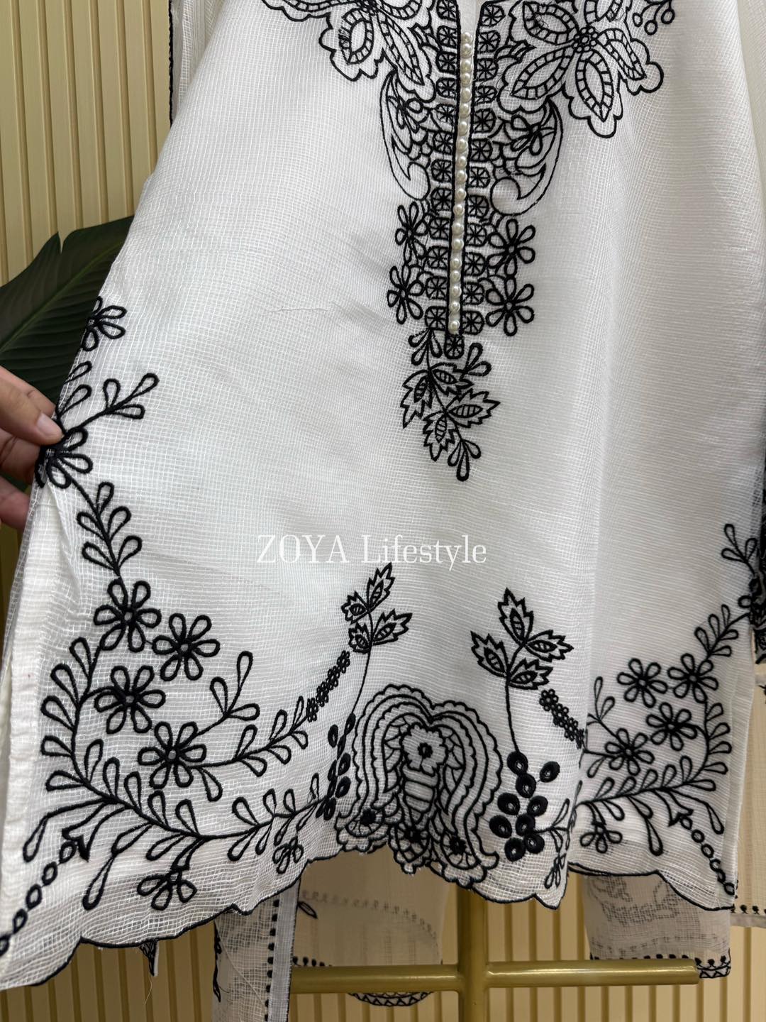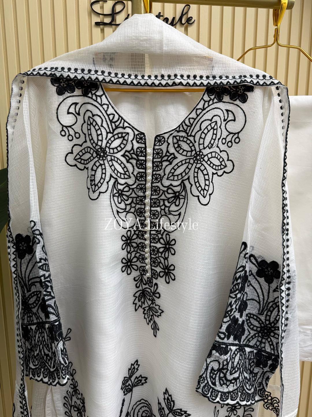 Material: Net kota Cotton kamiz with embroidery work on full body front and back. Full body inner attached. Farshi Pant Cotton. Net kota embroidered dupatta.