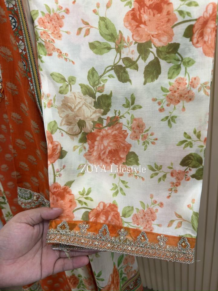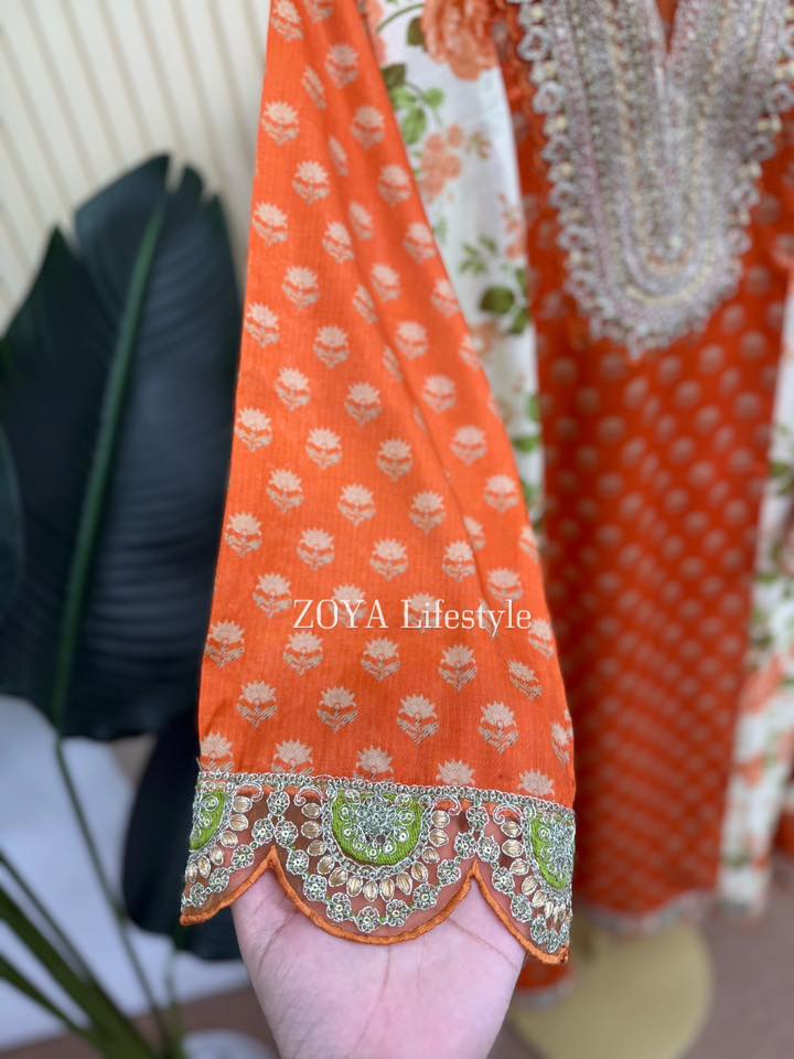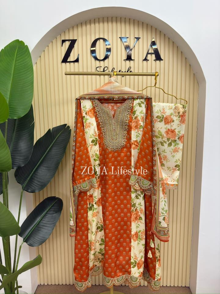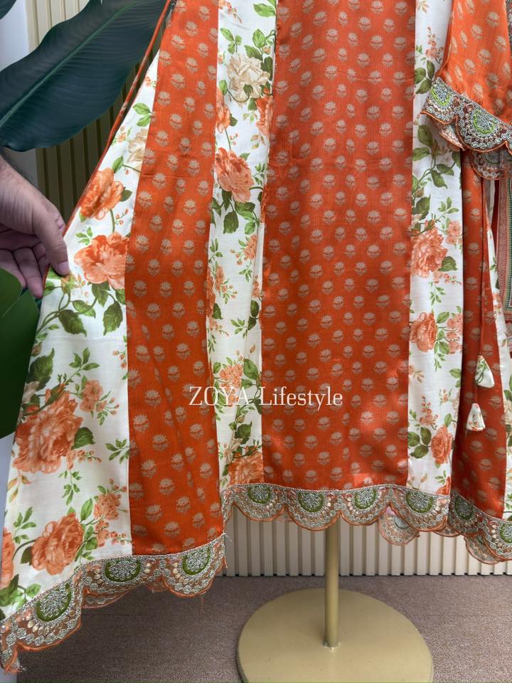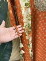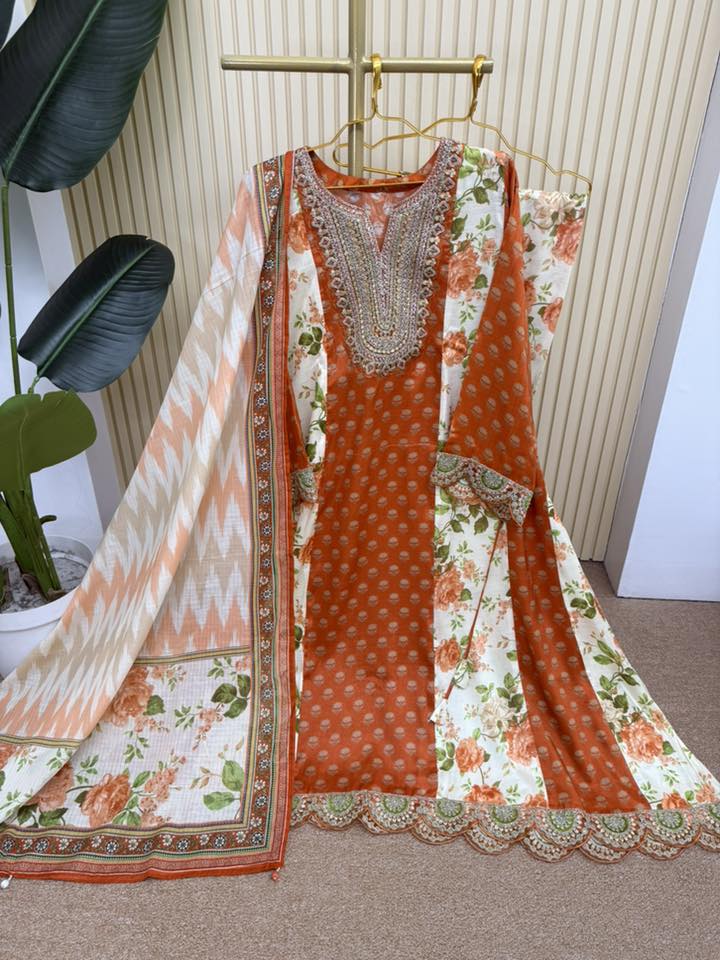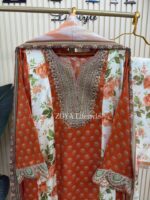 Material: shiny Rayon cotton with embroidery work on neck , sleeve and both side damaan.Side belt on waist for adjustment. Pant shiny rayon cotton with embroidered lace .