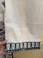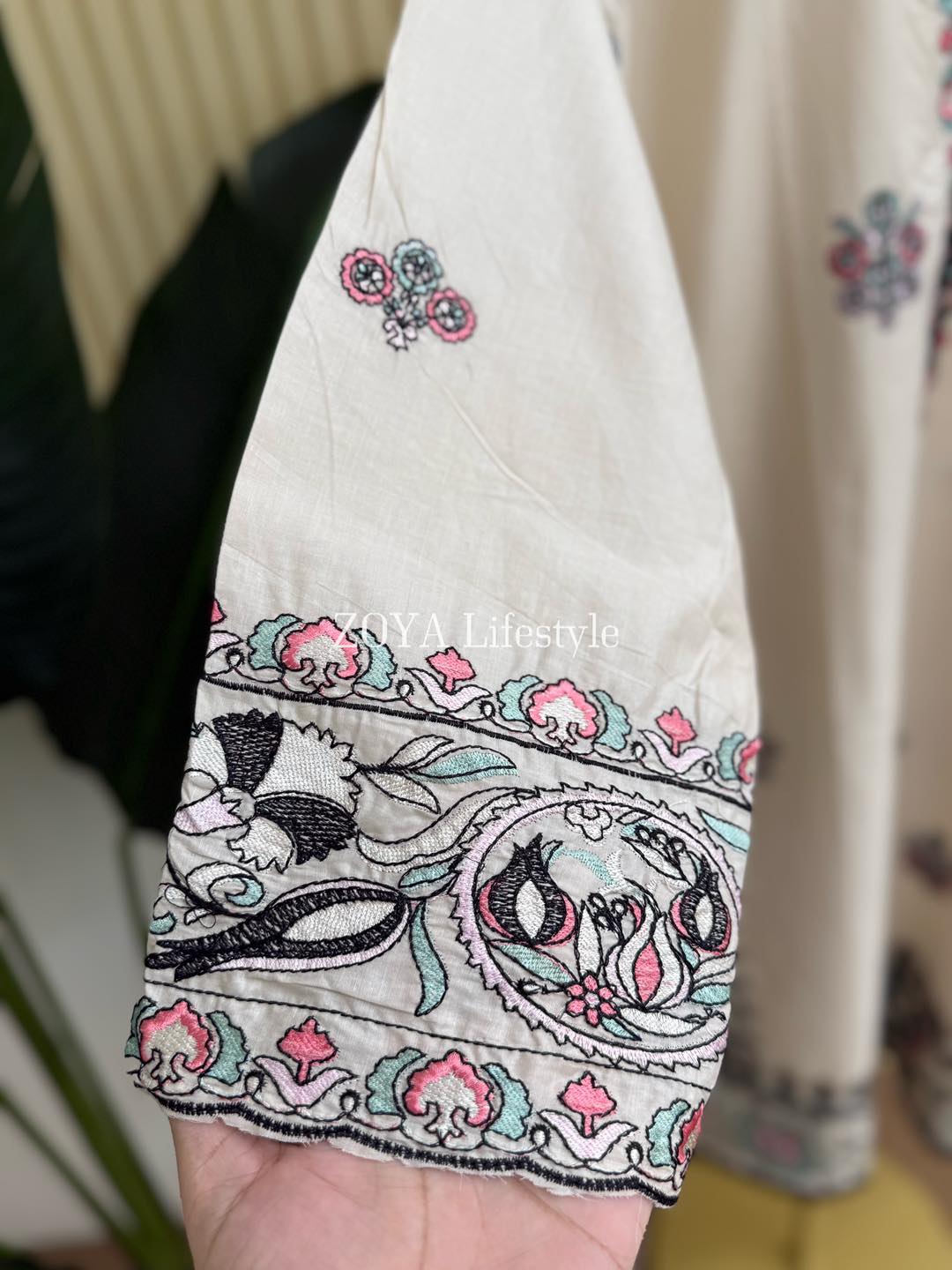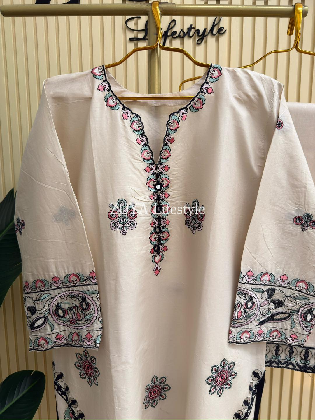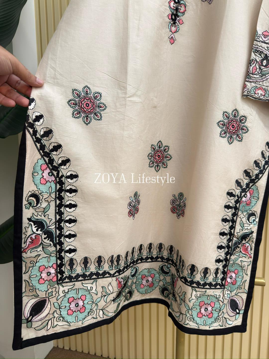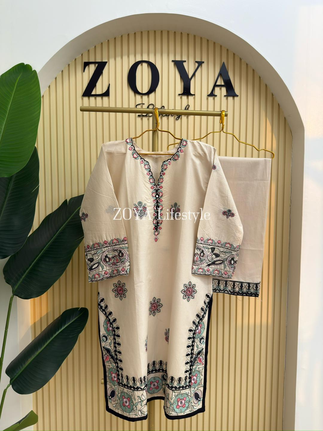 Material: Cotton with embroidery work on neck, sleeves, side border and Damaan. You need to wear inner. Pant cotton embroidered.