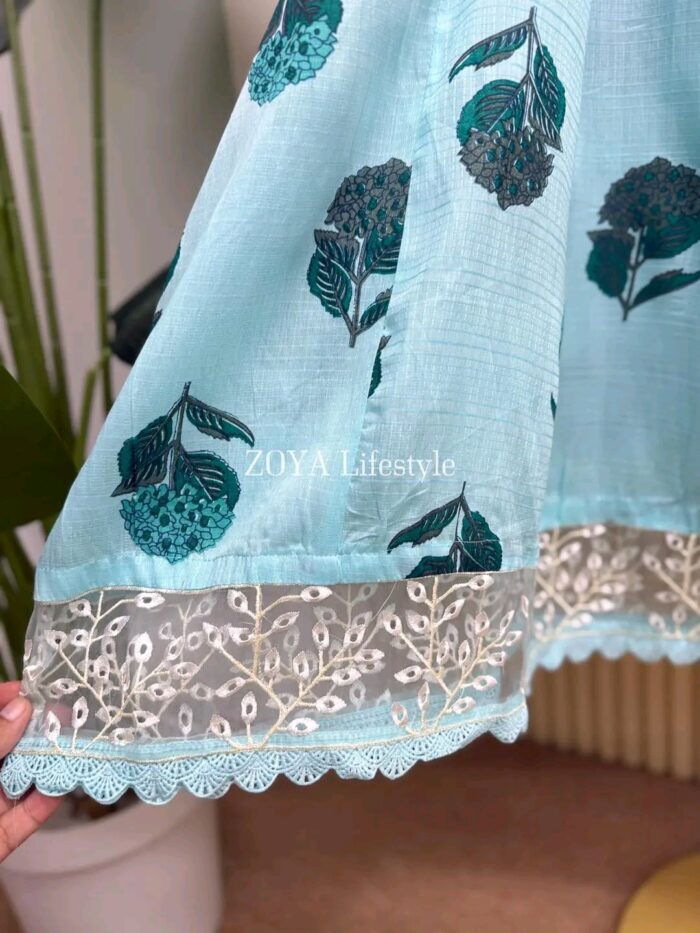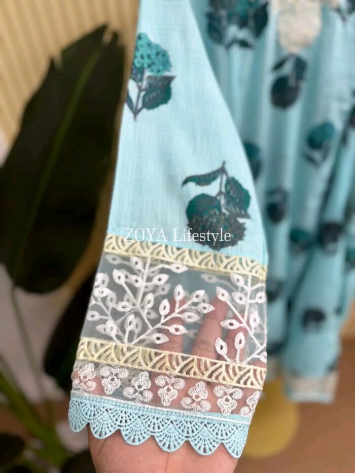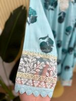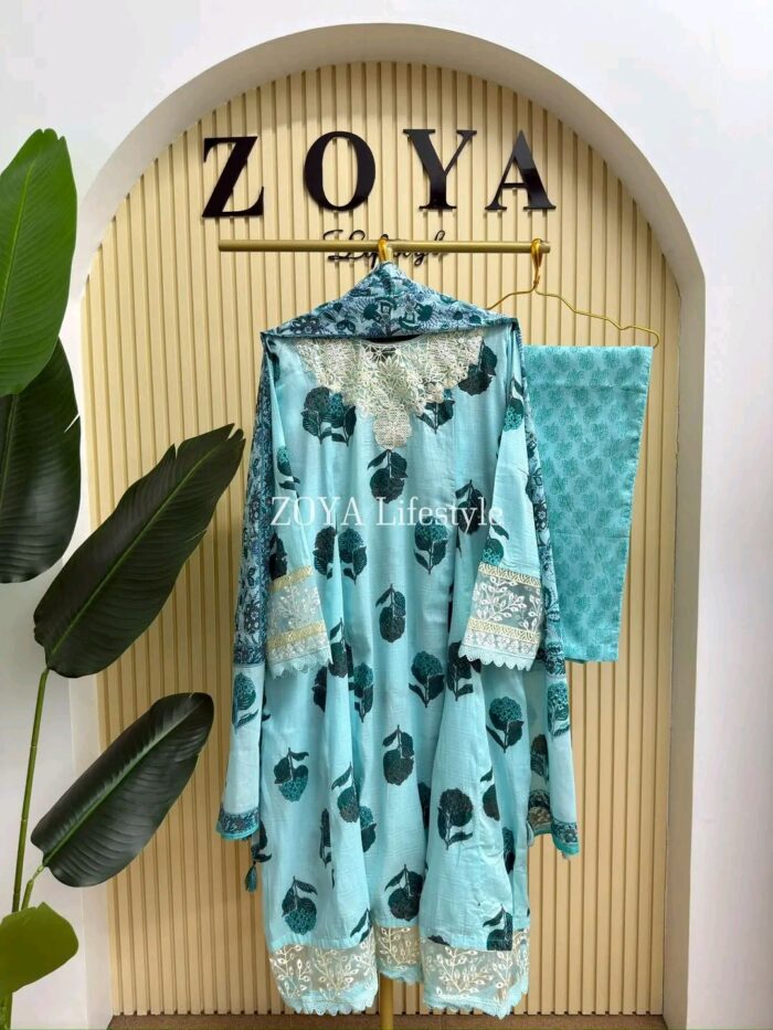 Material: cotton with embroidery work on neck, sleeves and damaan. Cotton printed dupatta and cotton pant.