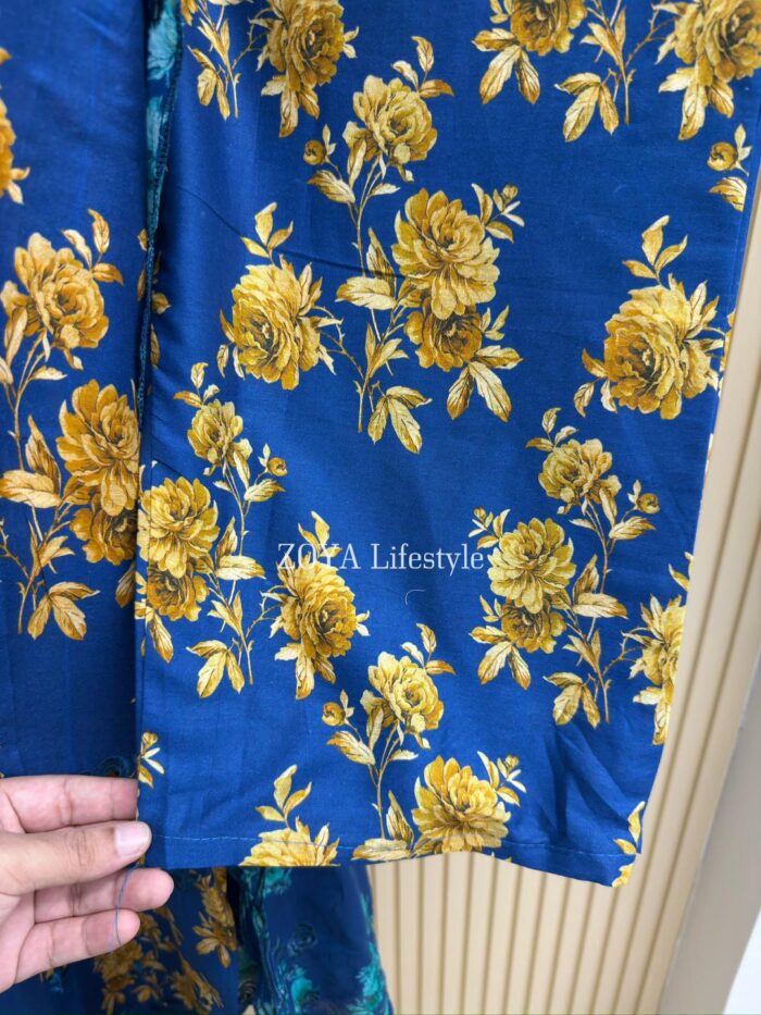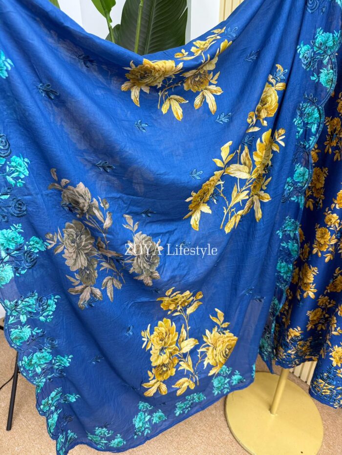 Material: Cotton with embroidery work on full body, chikankari embroidered on sleeves and damaan. Lace border on neck. Cotton printed orna with embroidery work. Pant printed cotton.