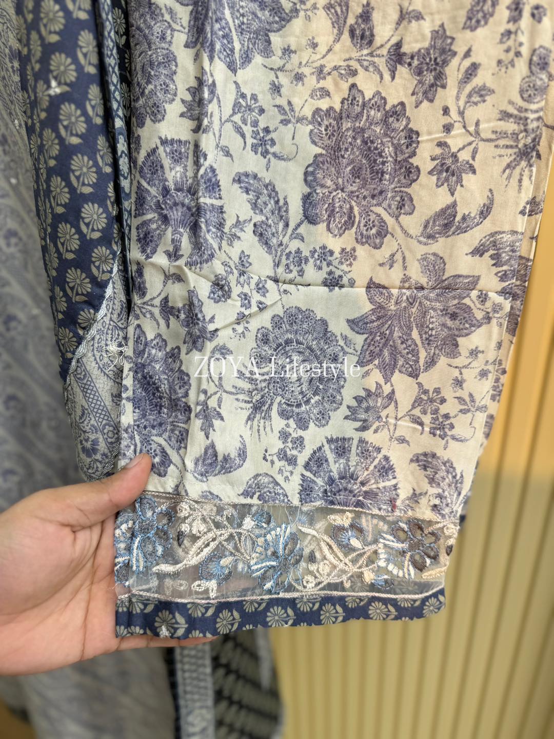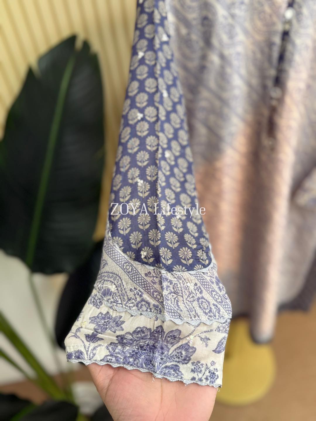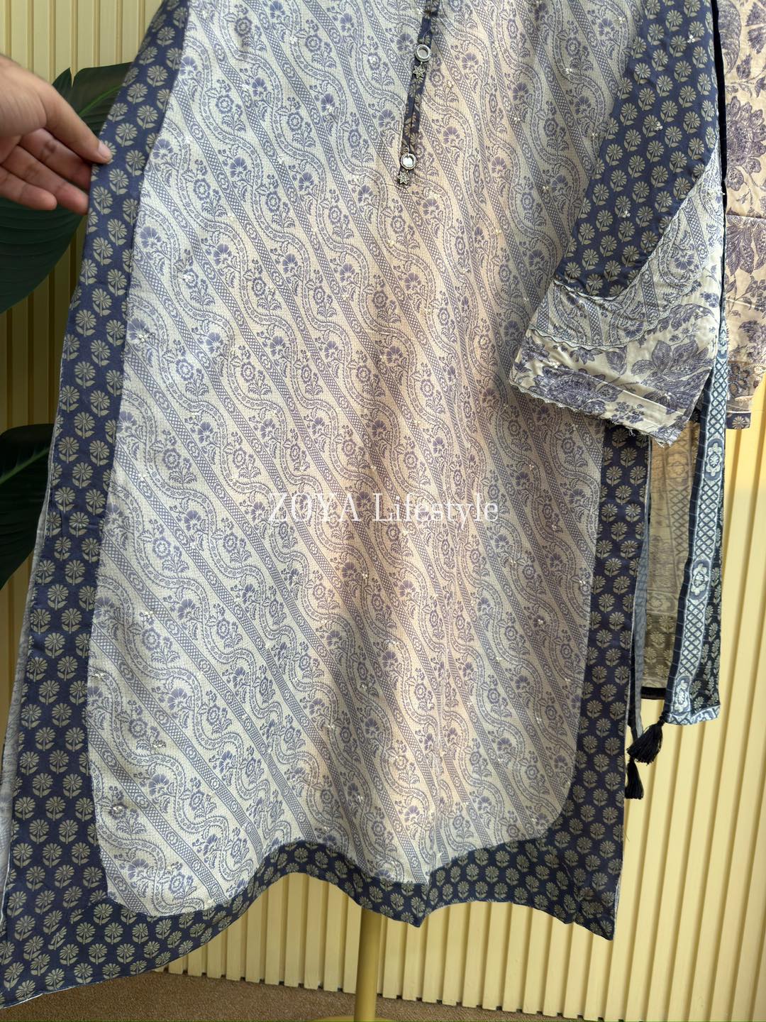 Material: Silky Cotton with sequins work on all over body. Cotton printed orna. Pant printed silky cotton with embroidered border.