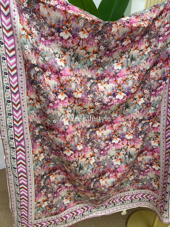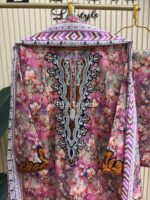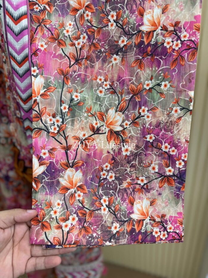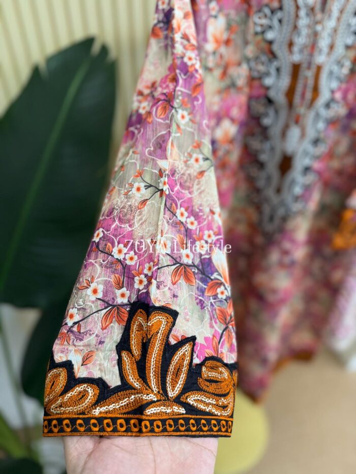 Material: Cotton with embroidery work on neck, sleeves & damaan. Cotton printed orna. Pant printed cotton.