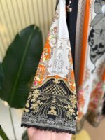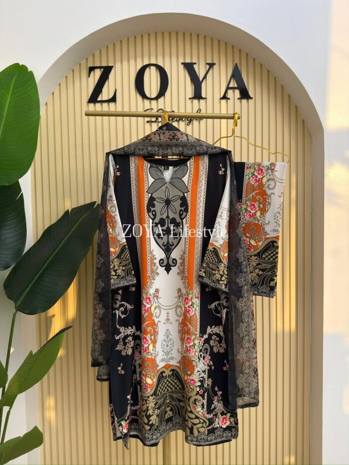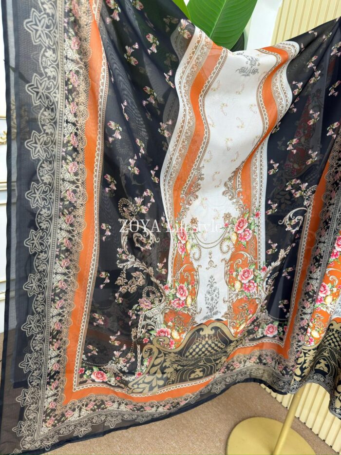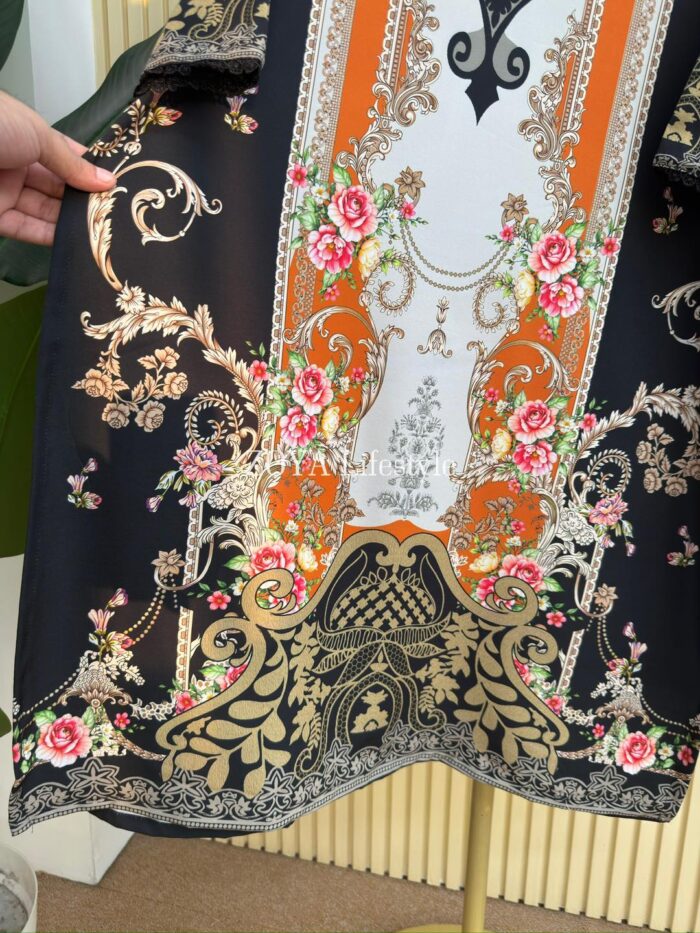 Material: Premium Dubai cherry Silk kamiz with all over digital prints. Lace border on neck, sleeves & damaan. Dubai silk printed pant. Georgette Dupatta printed.