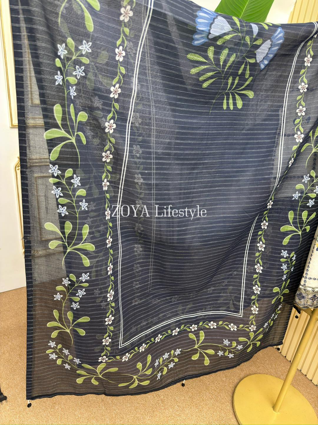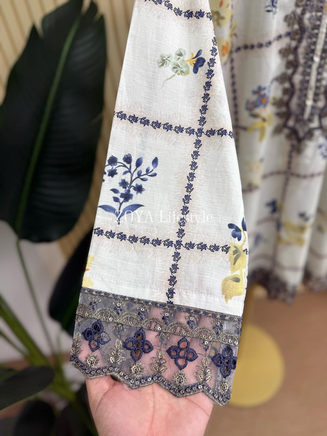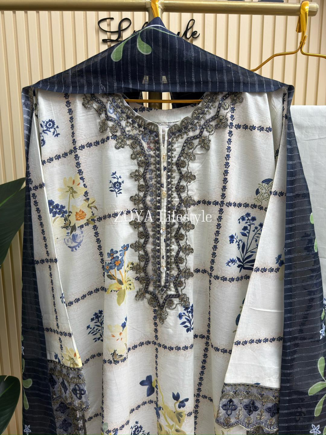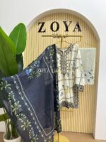 Material: Cotton with maslin embroidery work pannel on neck, sleeves, side border and damaan. Kota cotton orna. Loose Pant cotton.