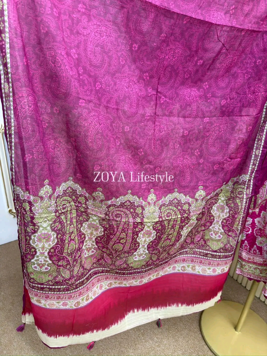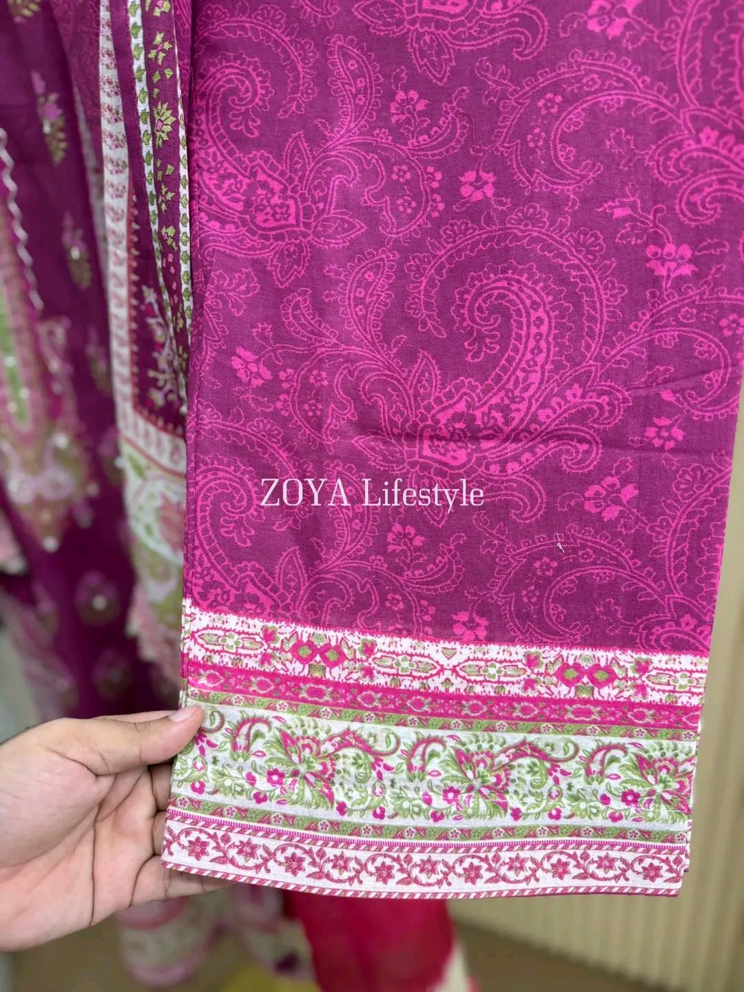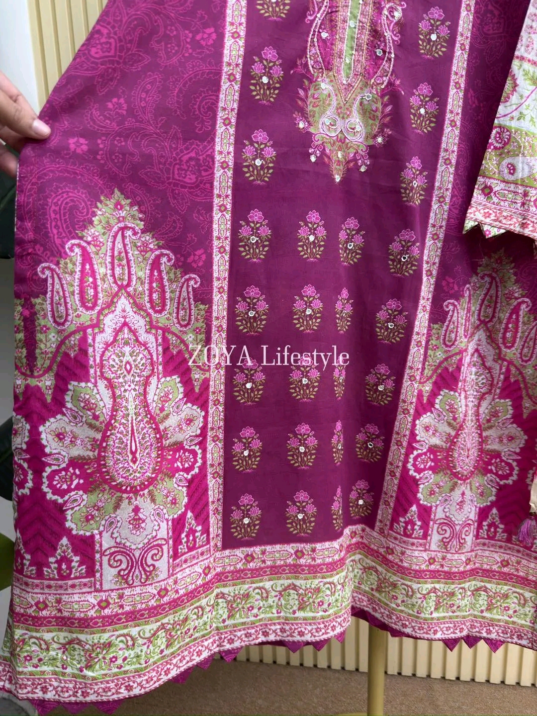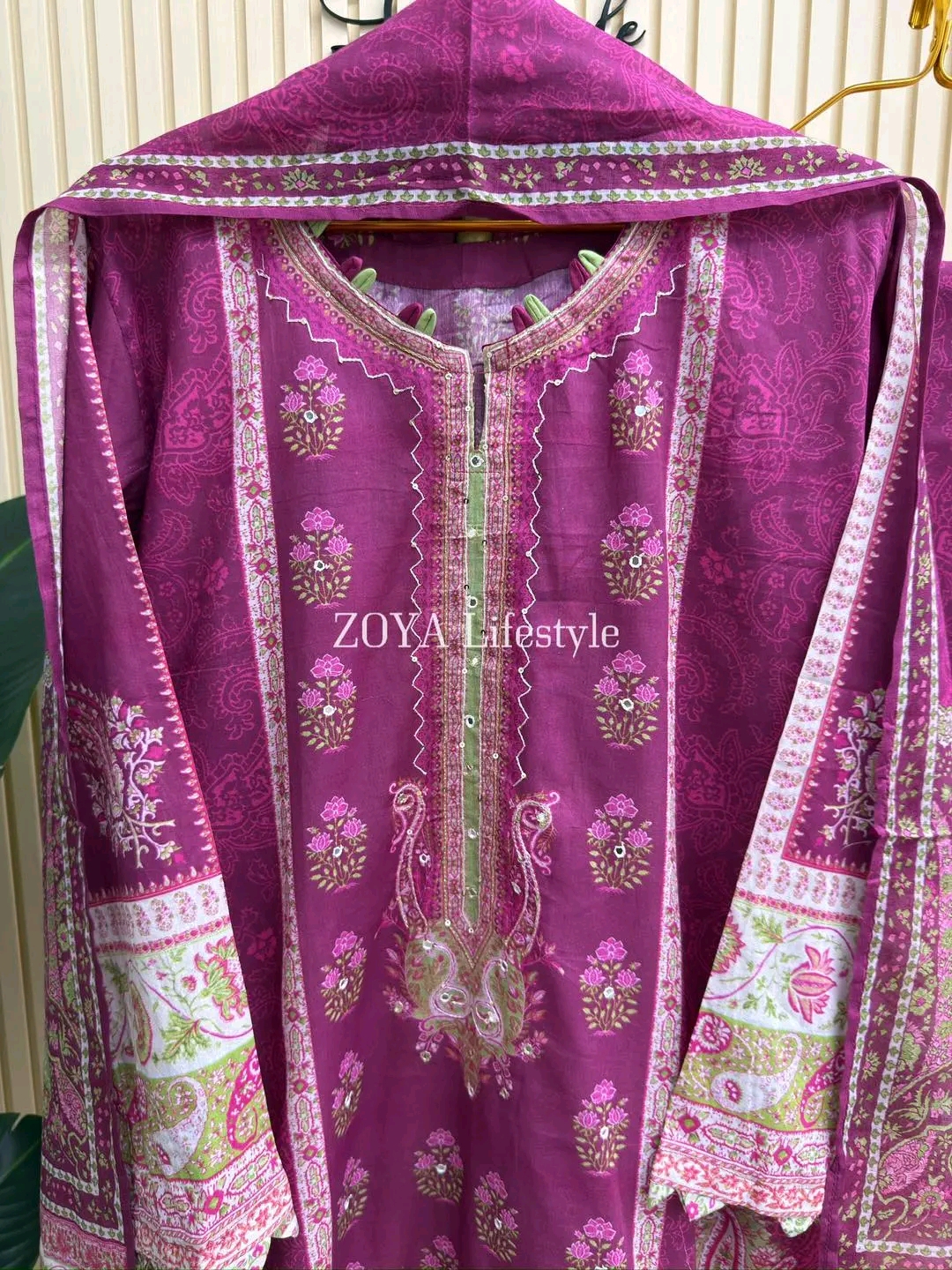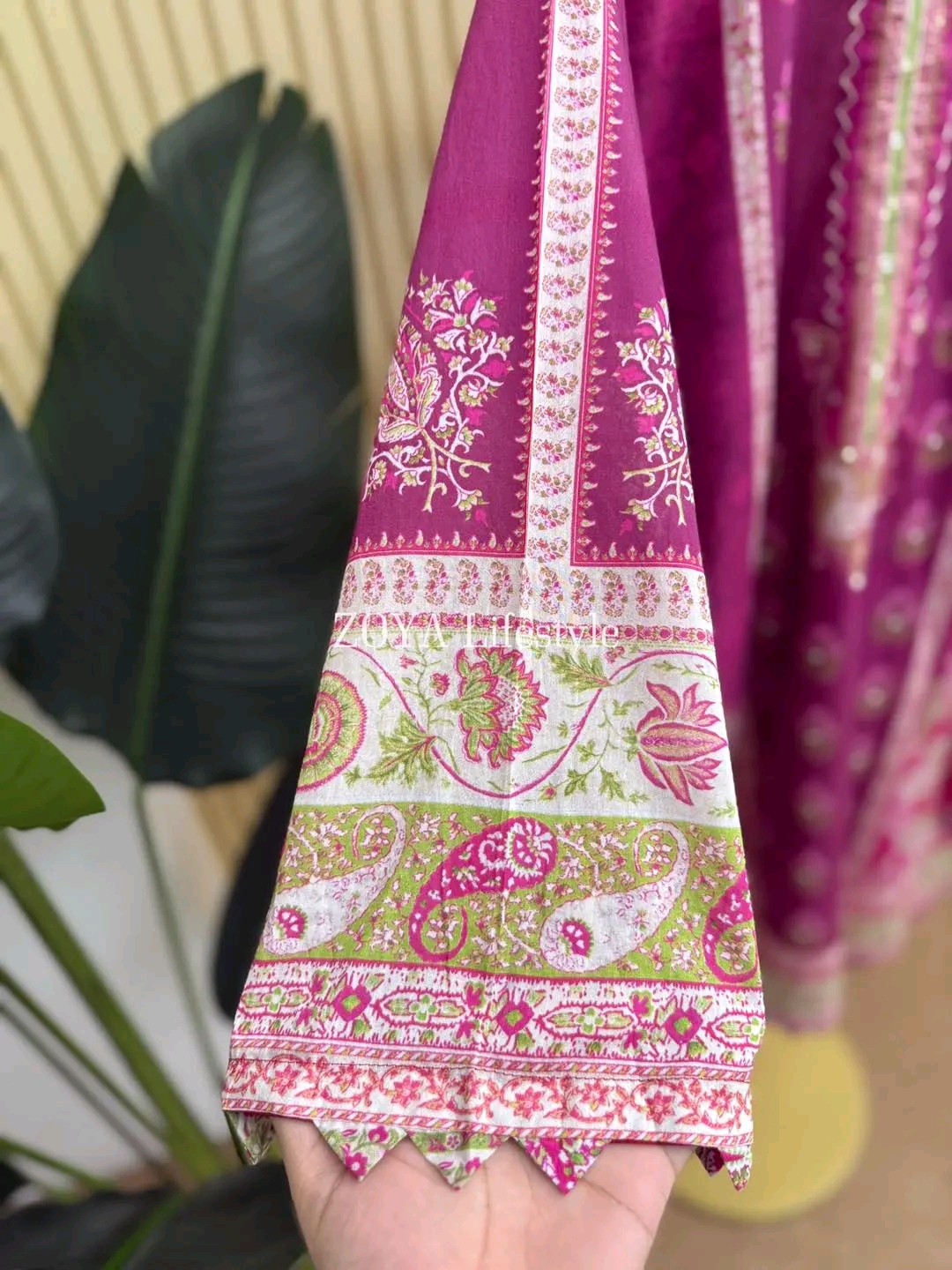 Material: Cotton with mirror work on neck to bottom. Triangle shapes on sleeves & Damaan. Kota Cotton printed orna. Pant Printed cotton.