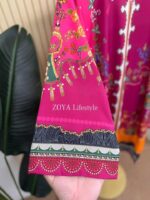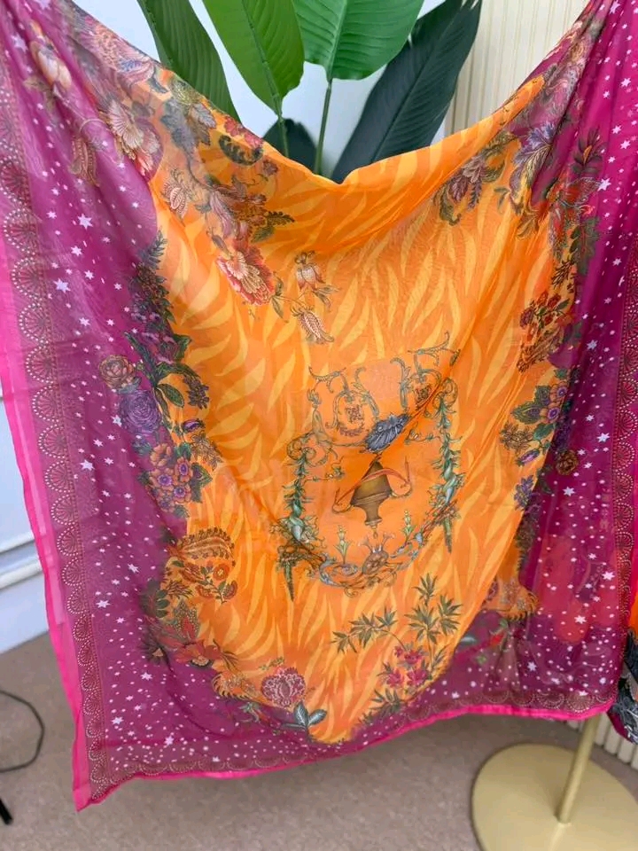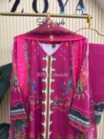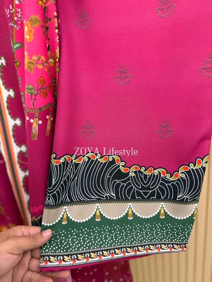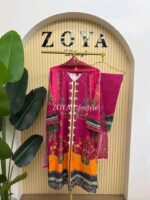 Material: Premium Dubai cherry Silk kamiz with all over digital prints. Lace border on neck, sleeves & damaan. Dubai silk printed pant. Georgette Printed Dupatta.