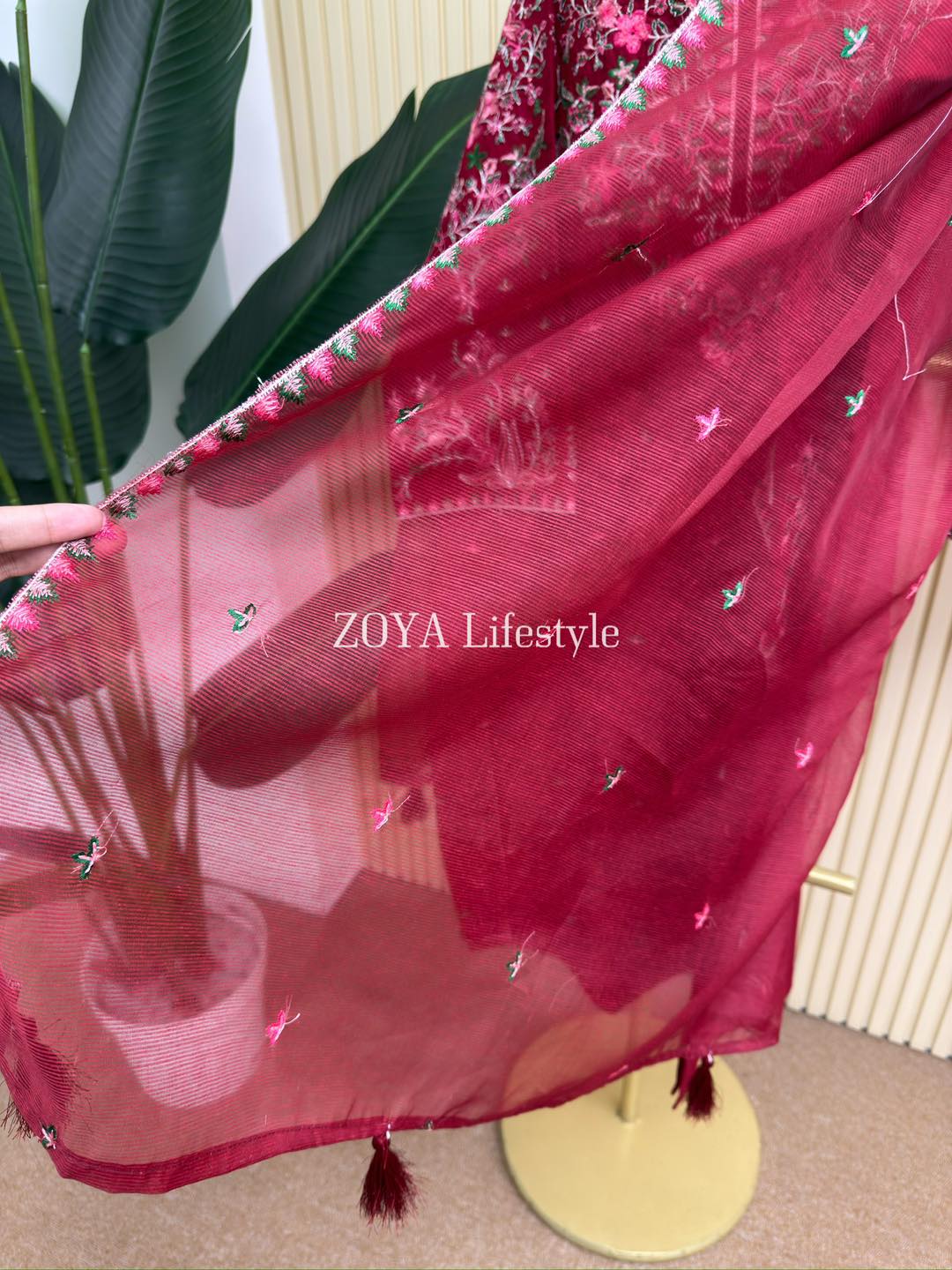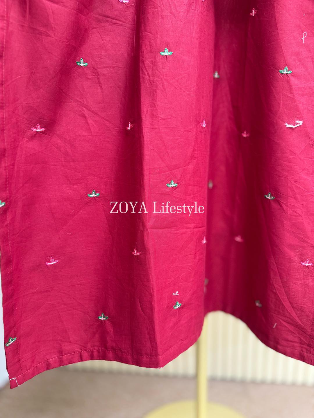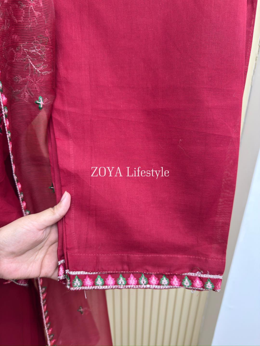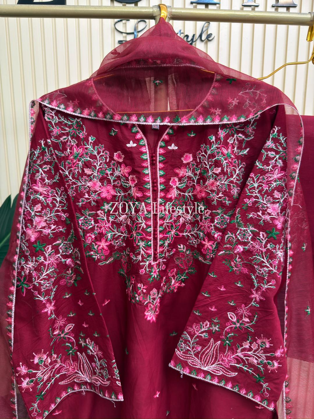 Material: cotton with embroidery work on all over body front. cotton pant with embroidery border. Kota embroidered dupatta.