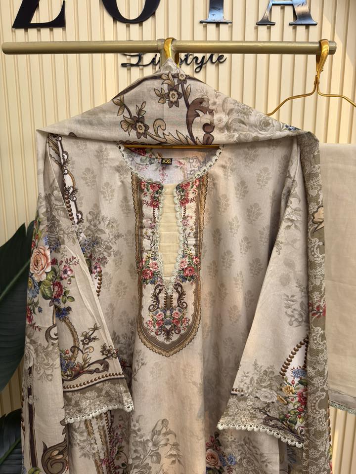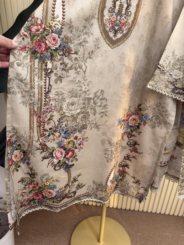 Material: soft Cotton printed all over body. Lace border on neck, sleeves and damaan. Cotton printed orna and cotton Pant with lace.