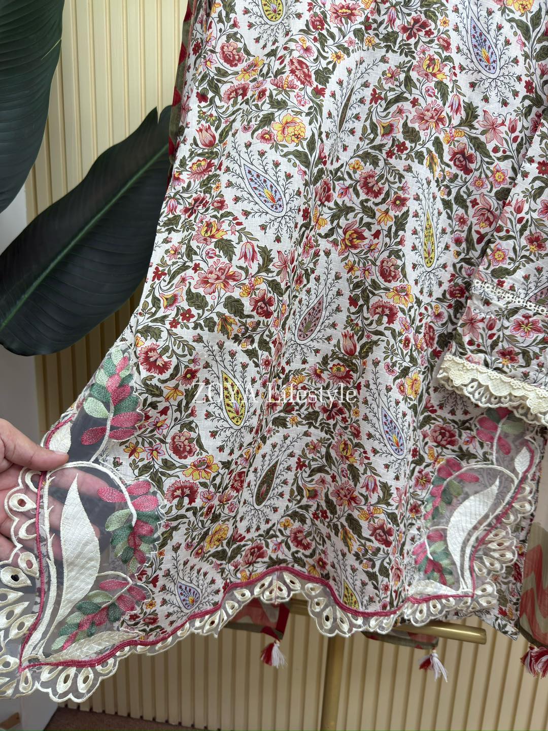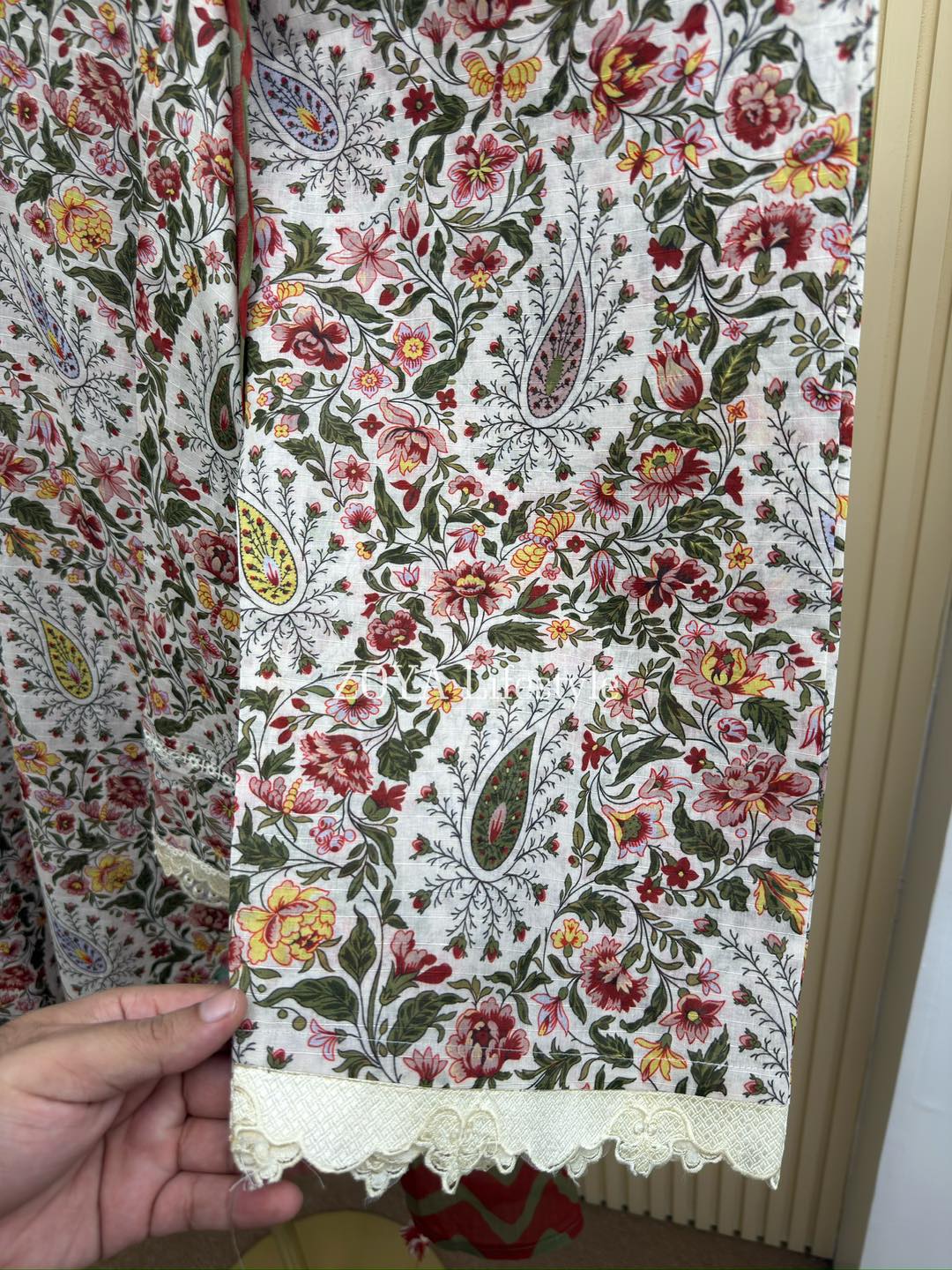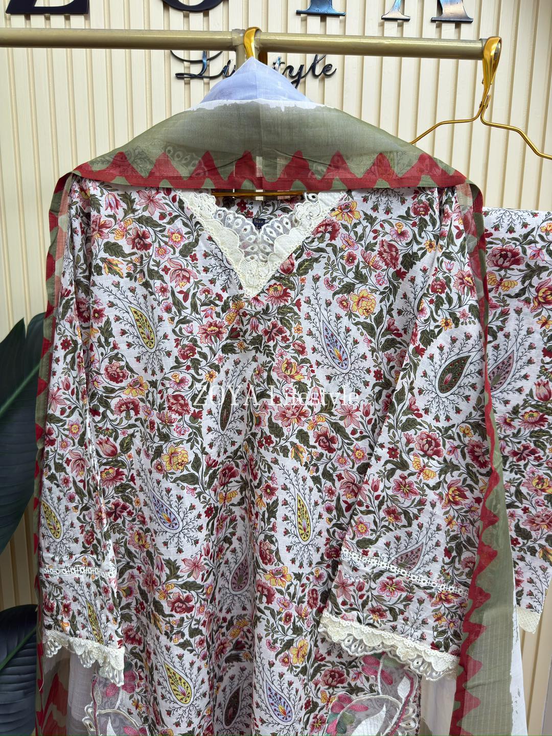Material: Cotton kamiz with embroidery work on neck, sleeves and damaan. Pant Cotton with embroidery work. Kota cotton dupatta printed.