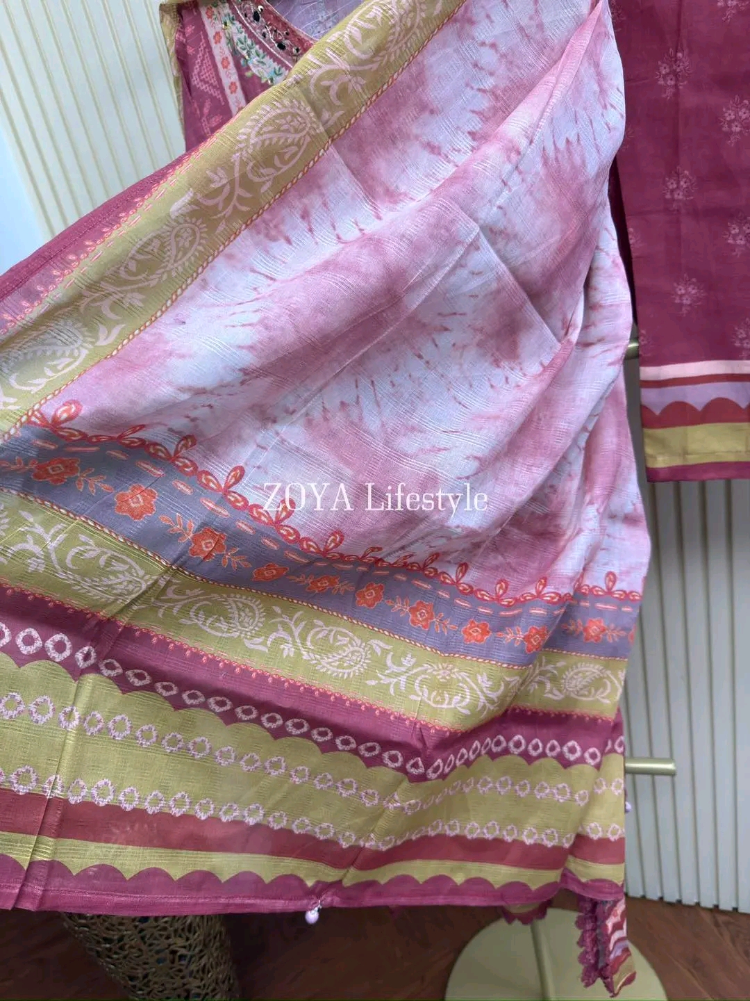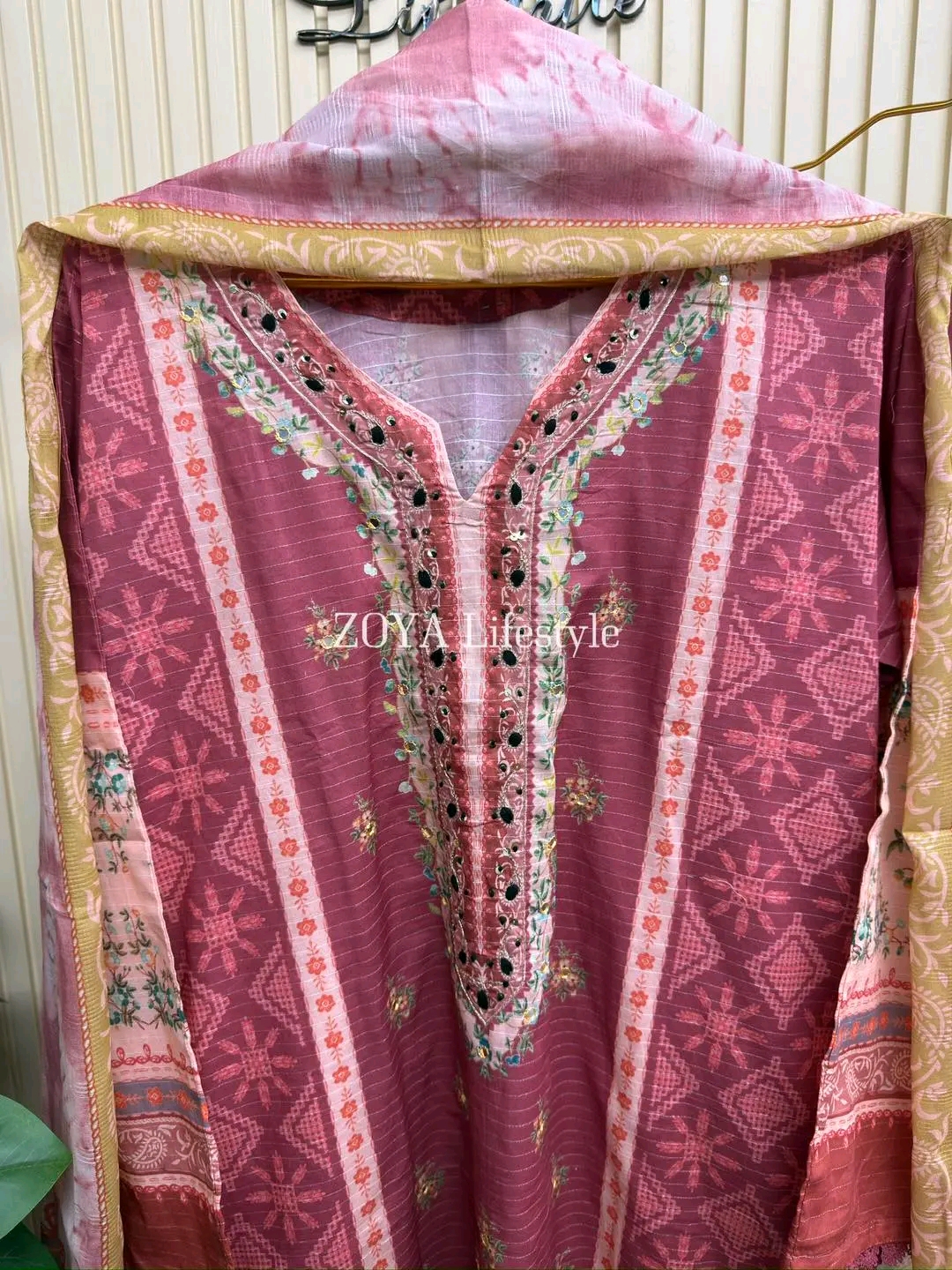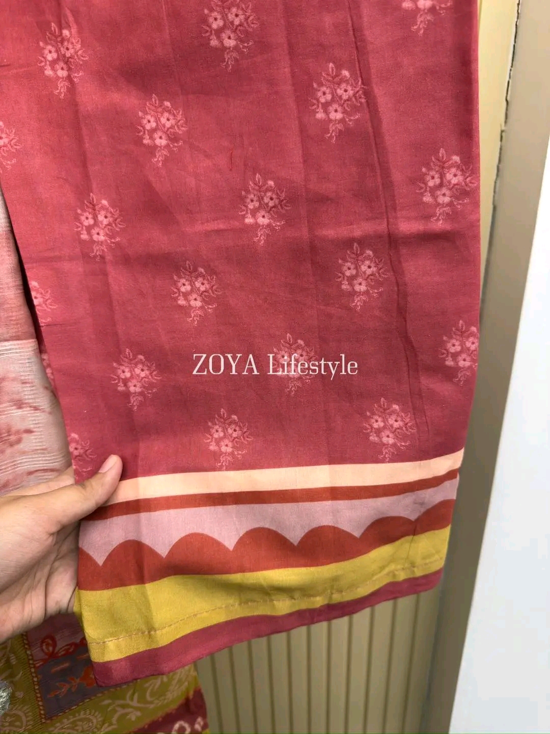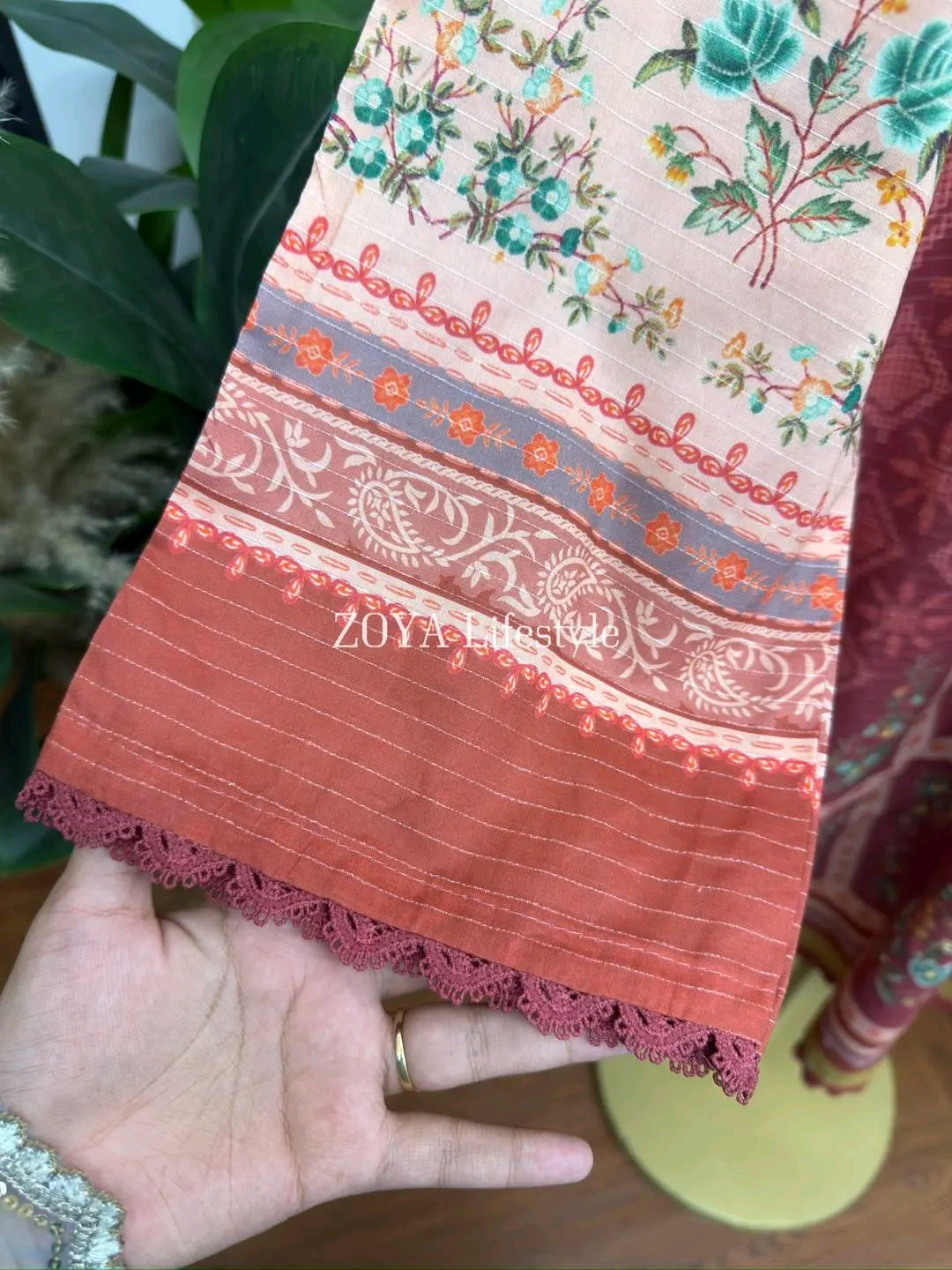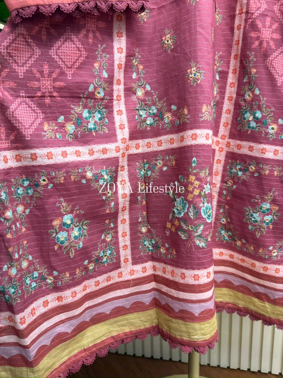 Material: Stripe Kota cotton with karchupi hand work on full body. Lace border on sleeves, side border and damaan. Cotton pant. Kota cotton Orna.