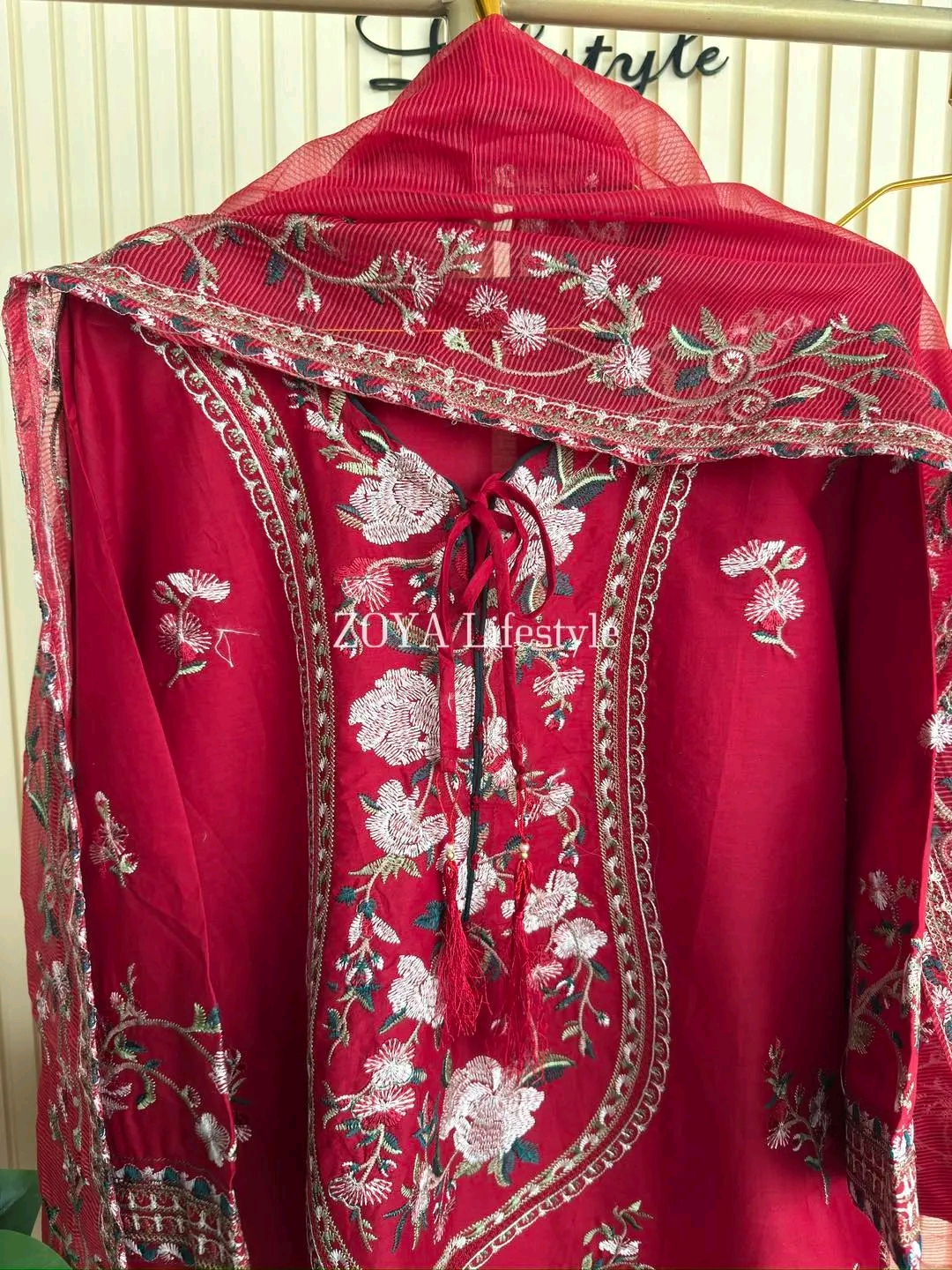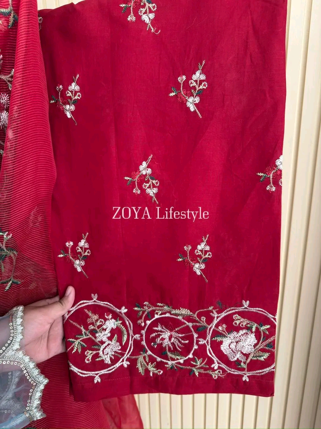 Material: Cotton with embroidery work on full dress. Cotton loose Pant with and embroidery work. Kota cotton embroidered dupatta.