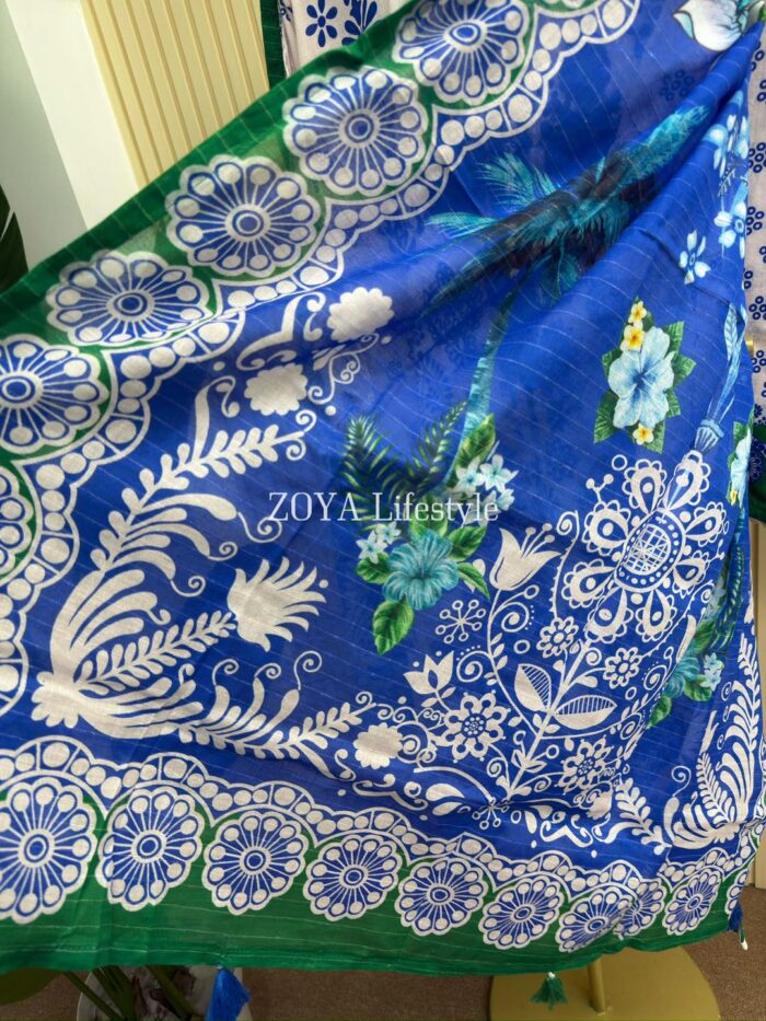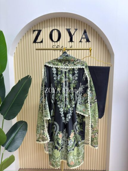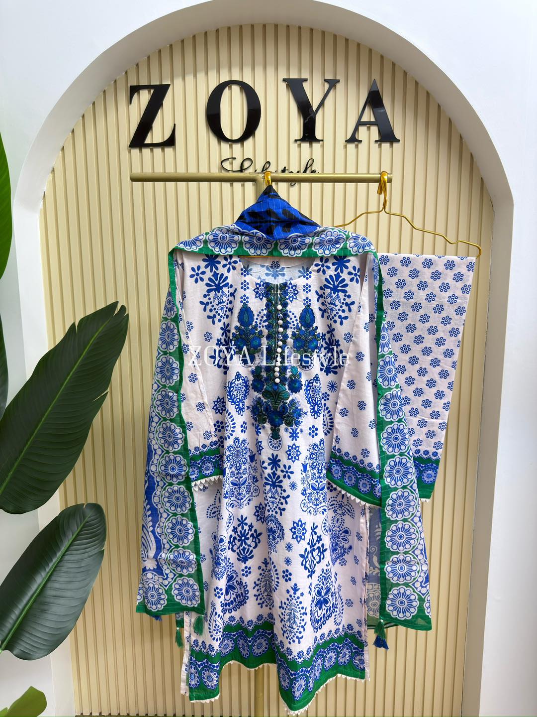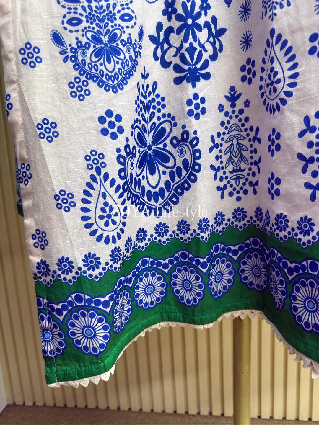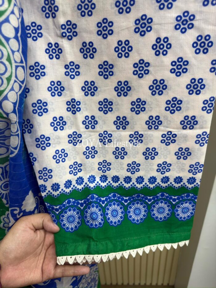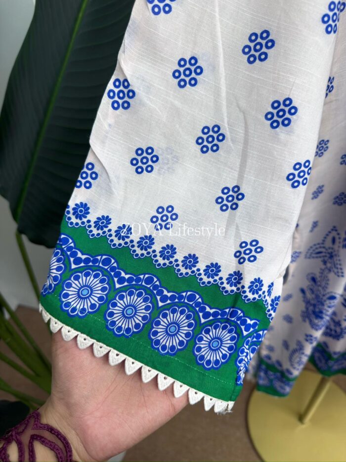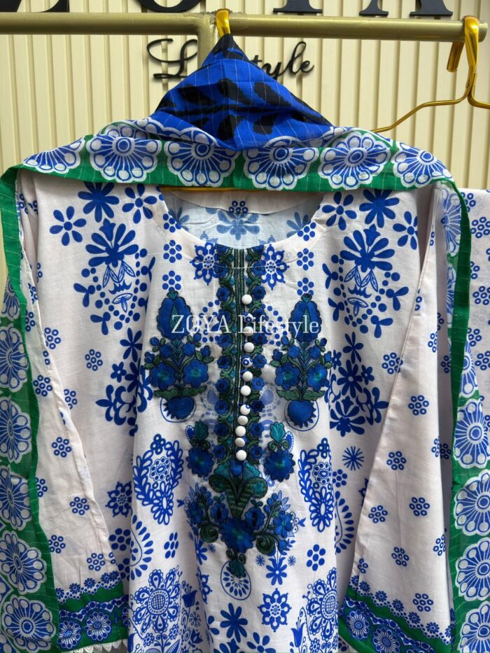 Material: Cotton with embroidery work on neck. Lace work on sleeves, side border and damaan. Kota cotton printed orna. Pant cotton with print.