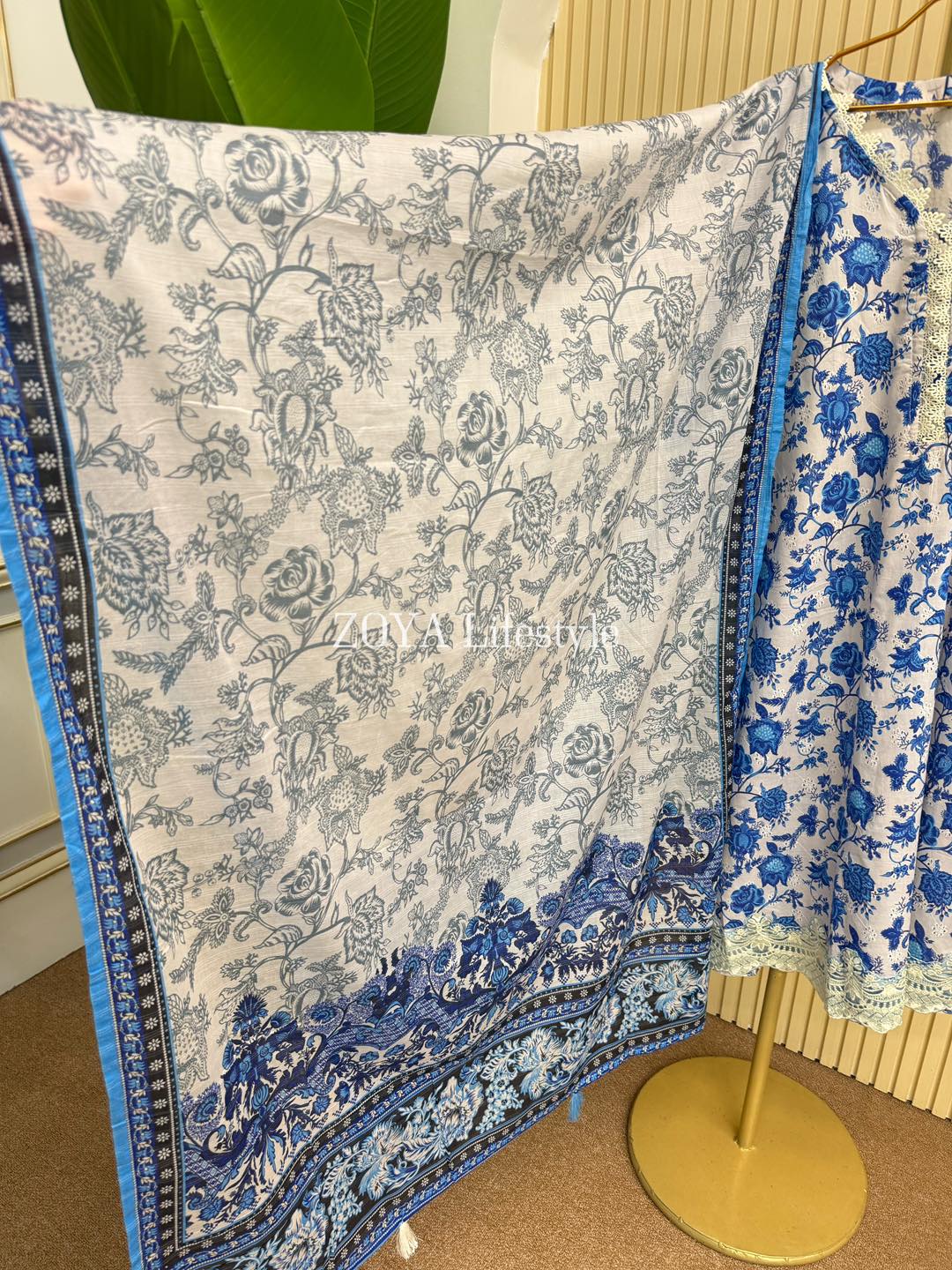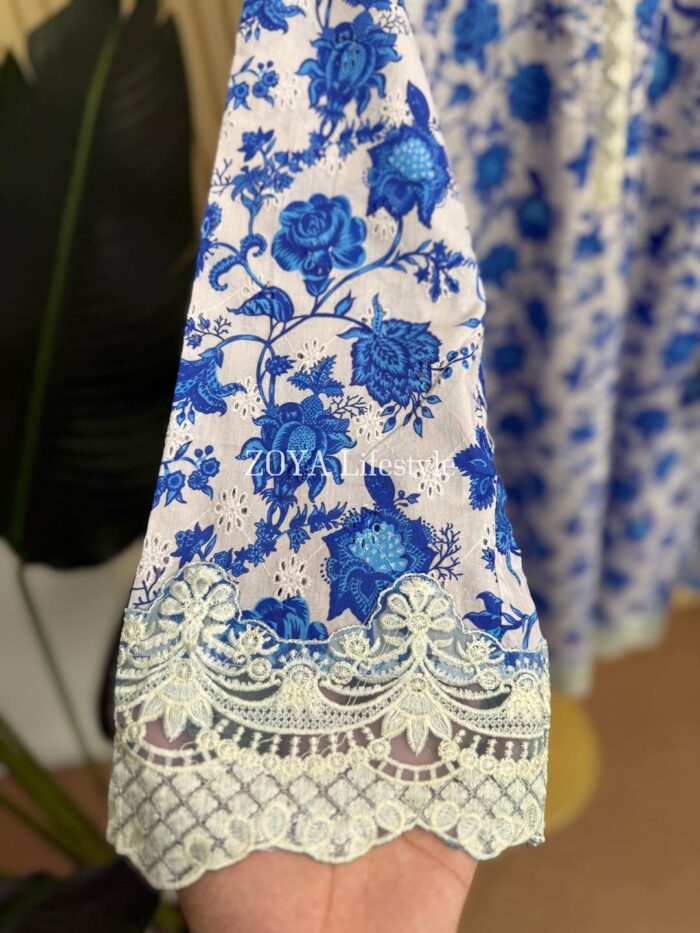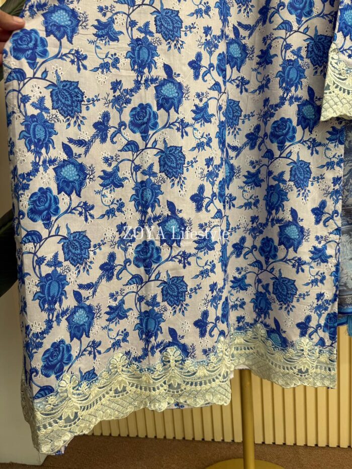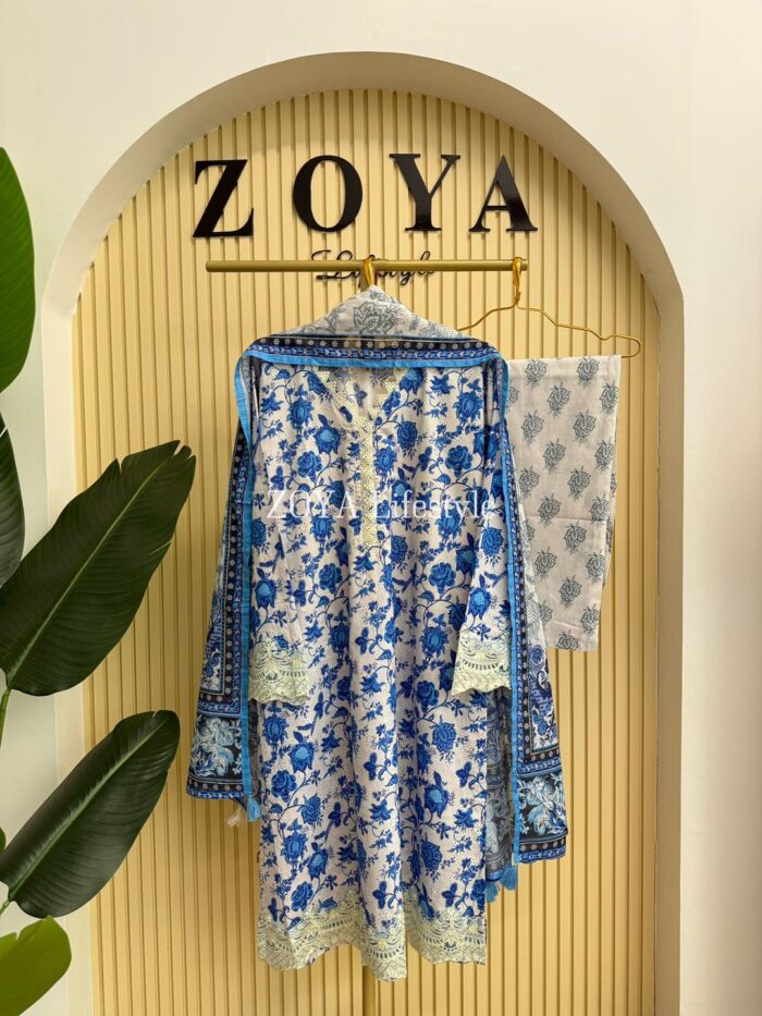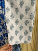 Material: chikankari Cotton with lace design on neck. Embroidery design work on sleeves & damaan. Half body inner attatched on front side. kota Cotton orna. Pant cotton.