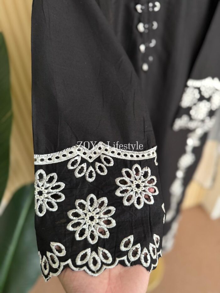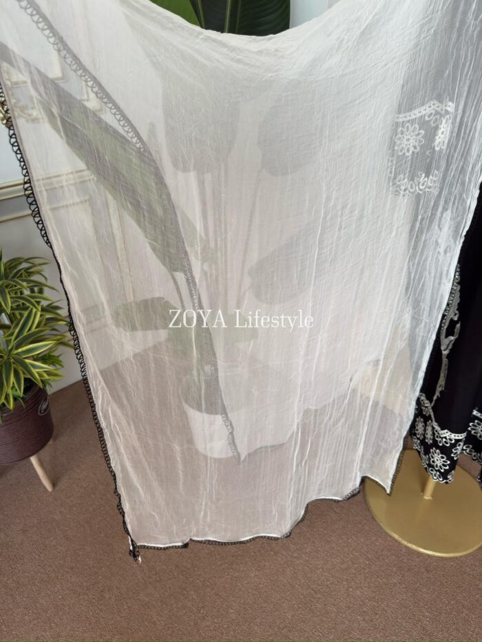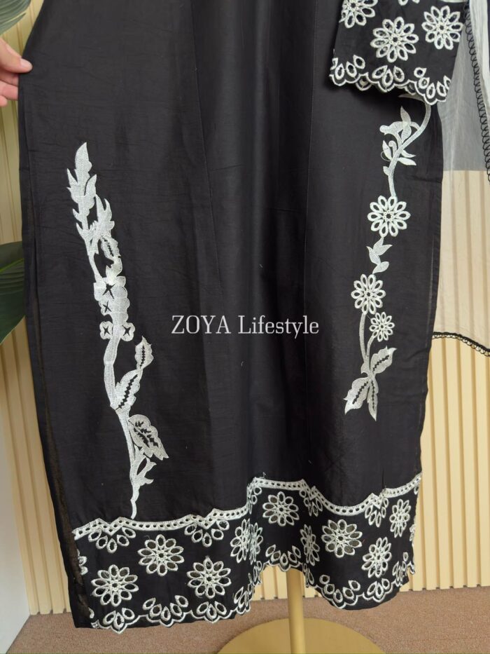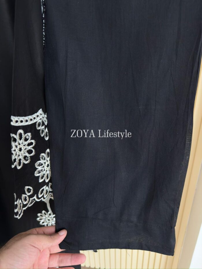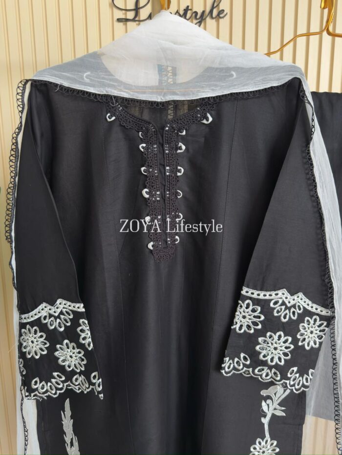 Material: Cotton kamiz with Embroidery work on neck, sleeves & Damaan. Cotton pant. Chiffon Dupatta with lace border.