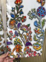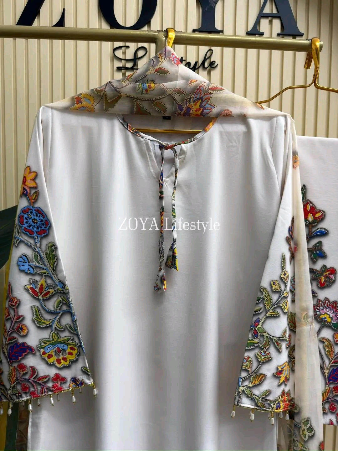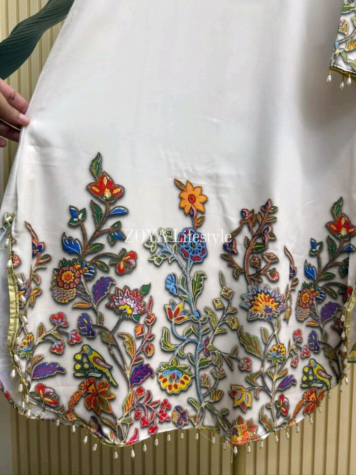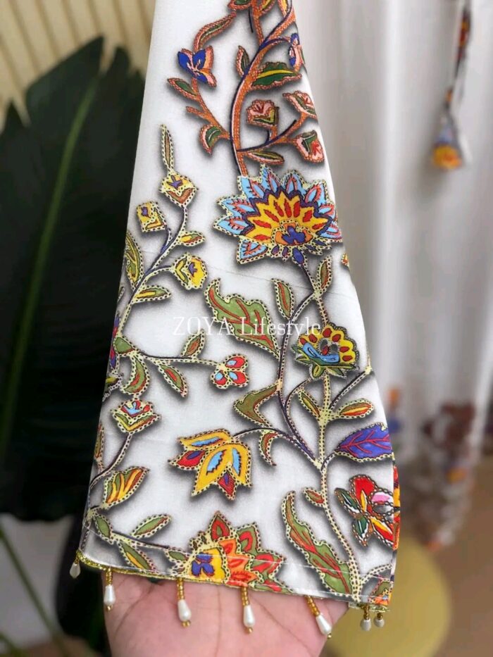 Material: Premium Dubai cherry Silk kamiz with all over digital prints. Pearl lace borders on sleeves and damaan. Dubai silk pant. Georgette Dupatta printed.