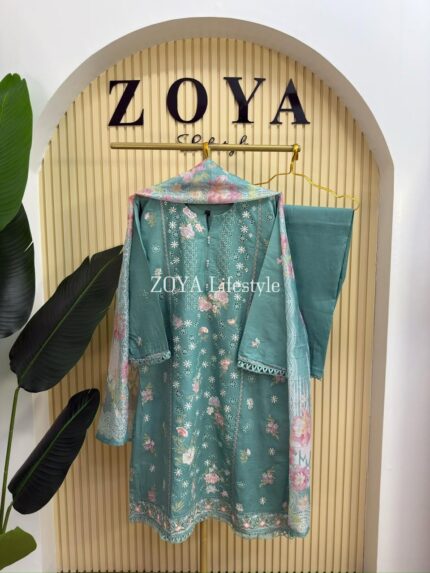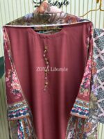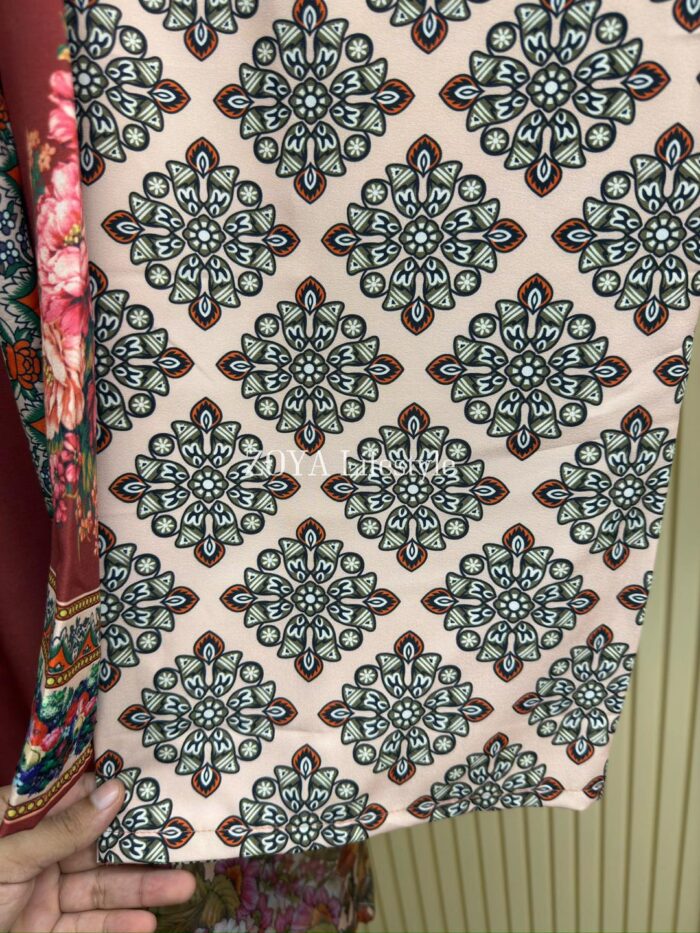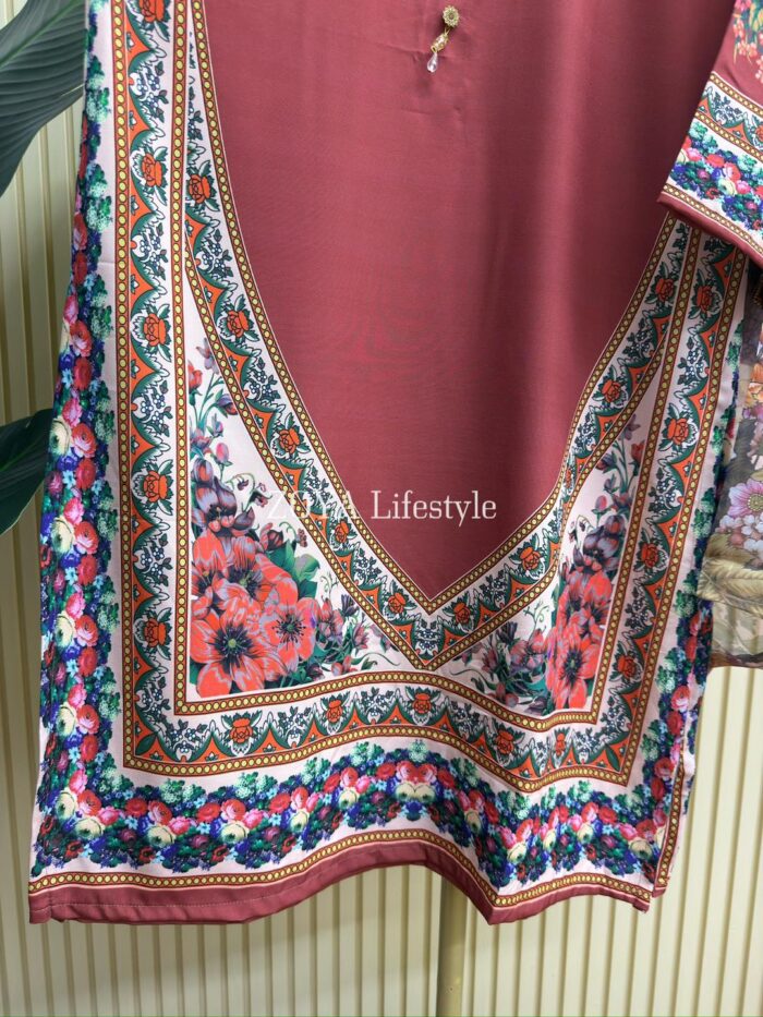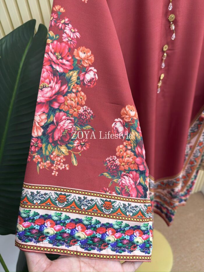 Material: Premium Dubai cherry Silk kamiz with all over digital prints. Beads work on neck. Dubai silk pant. Georgette Dupatta printed.