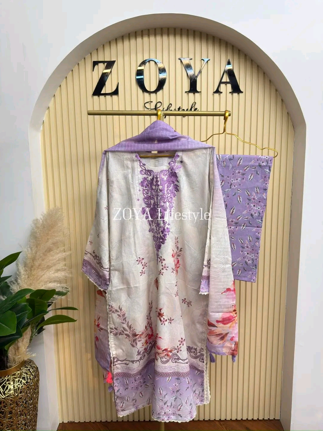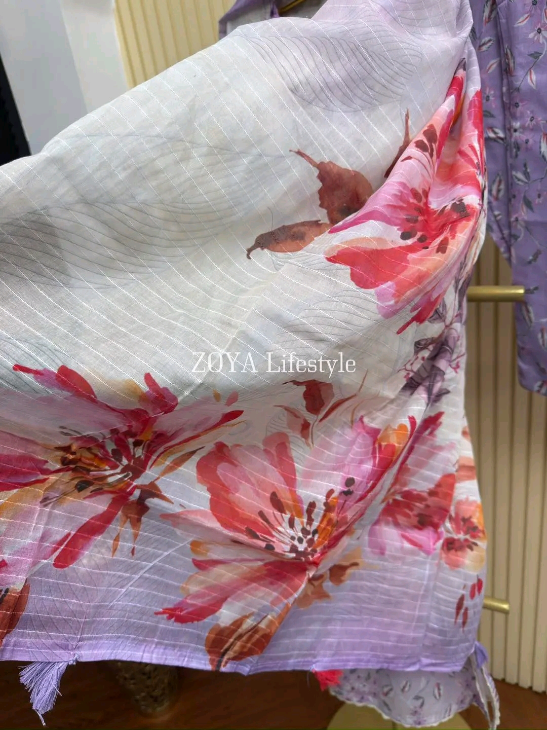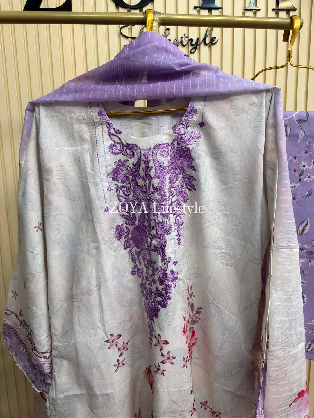 Material: Stripe Cotton with embroidery work on neck. Lace work on sleeves and side border to damaan. Cotton pant with print. Kota cotton orna.