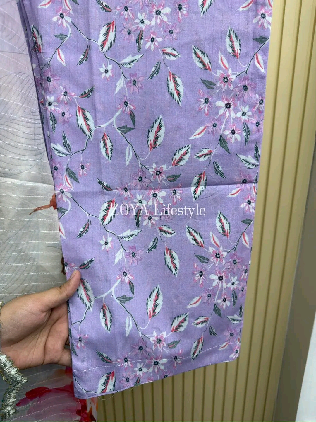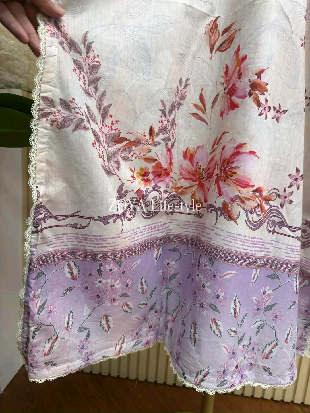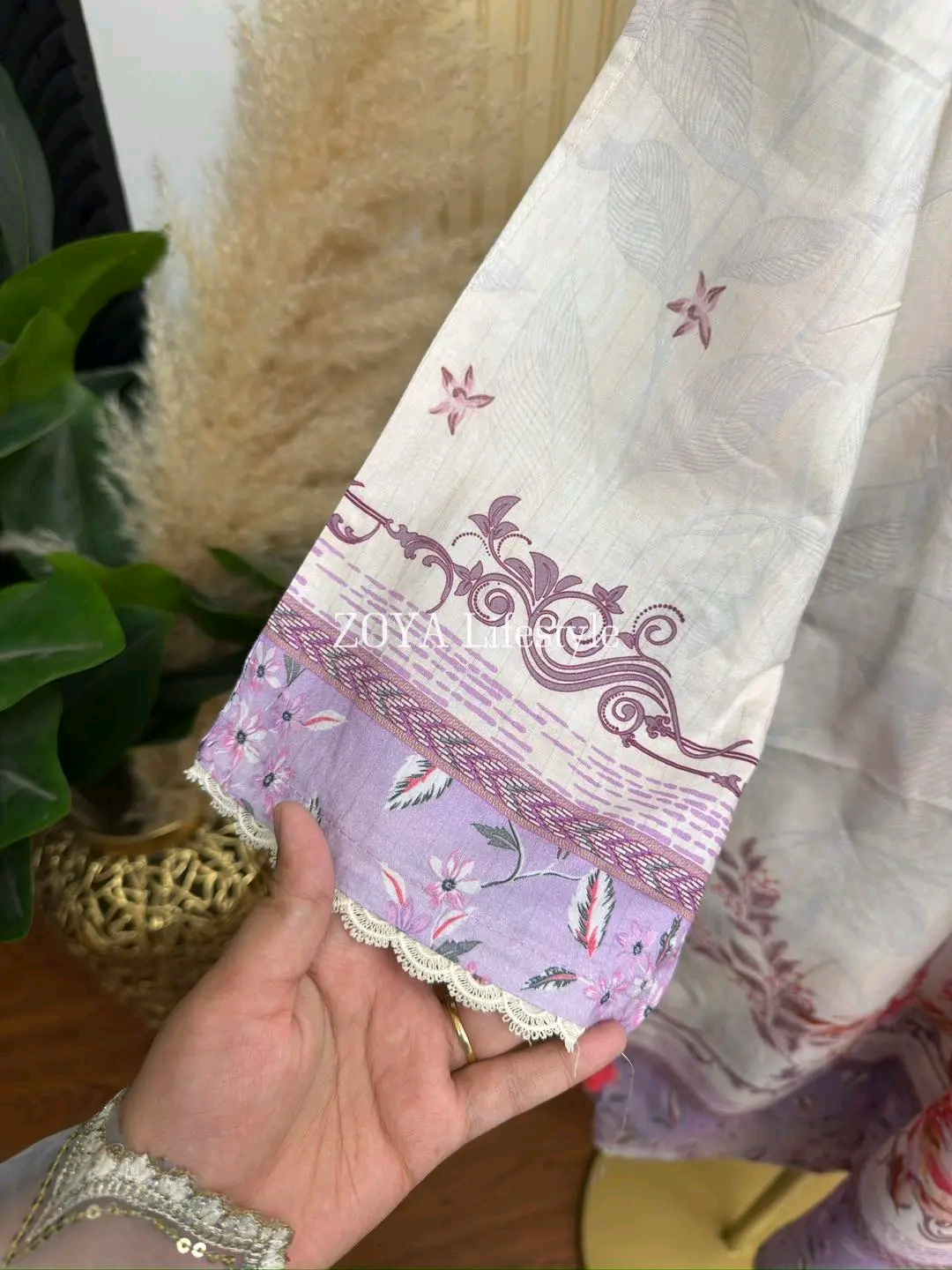 Material: Stripe Cotton with embroidery work on neck. Lace work on sleeves and side border to damaan. Cotton pant with print. Kota cotton orna.