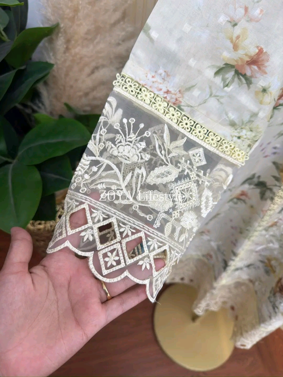 Material: Jaquard Cotton with embroidery work on neck, sleeves and damaan. Cotton Pant with embroidery border.