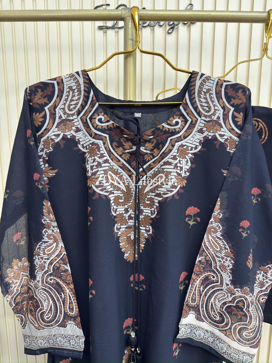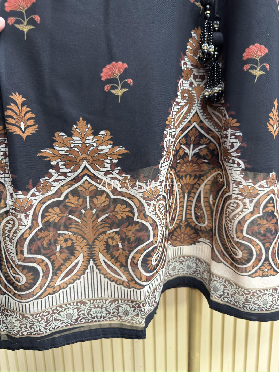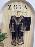 Material: Georgette with all over print. Tassel work on neck. Rayon Cotton plazzo Pant with sequins embroidery work.