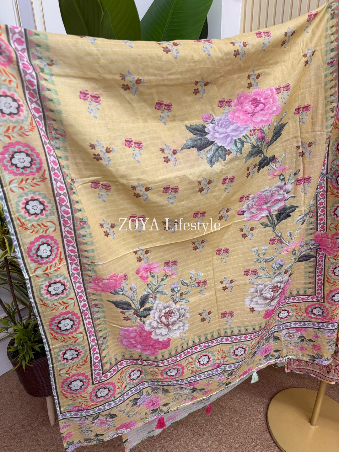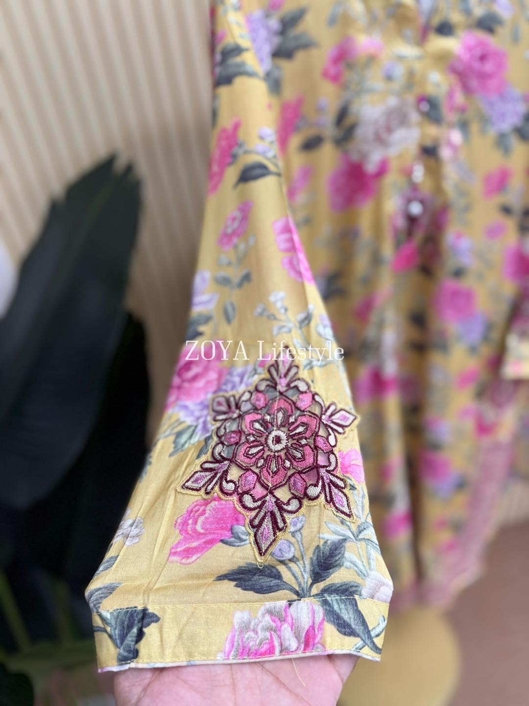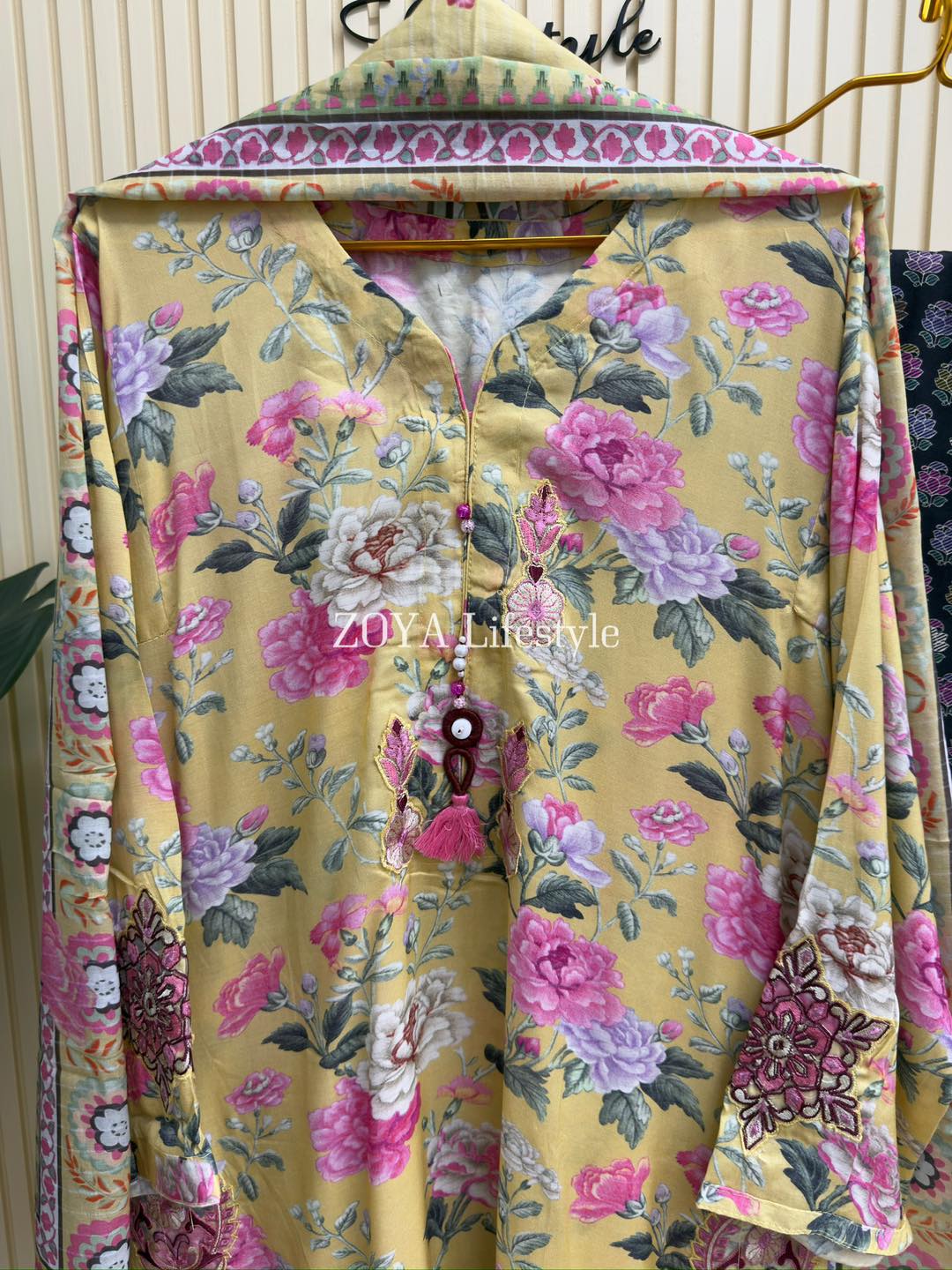Material: Rayon silk Cotton fabric with embroidered work on sleeves and side border & daamaan. Kota cotton dupatta. Rayon silk Cotton pant.
