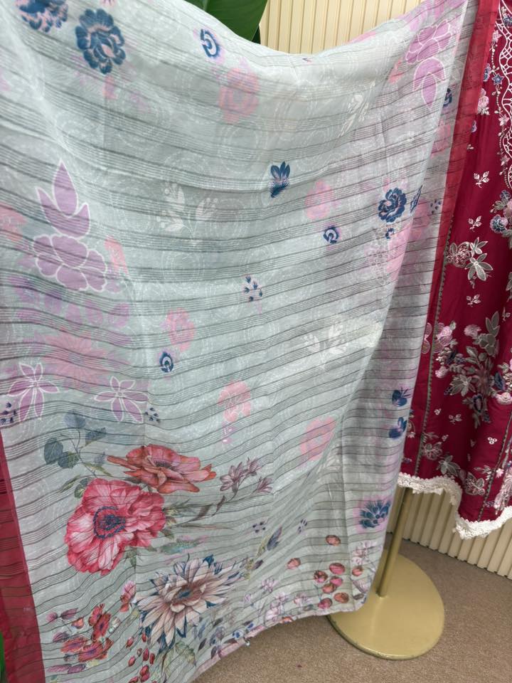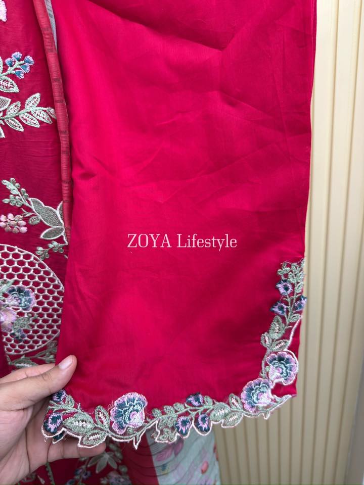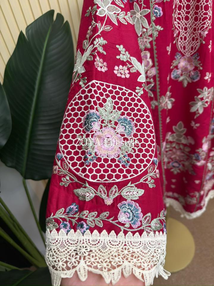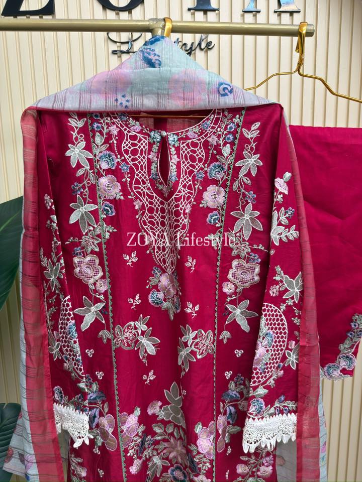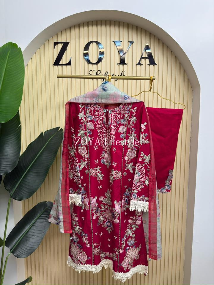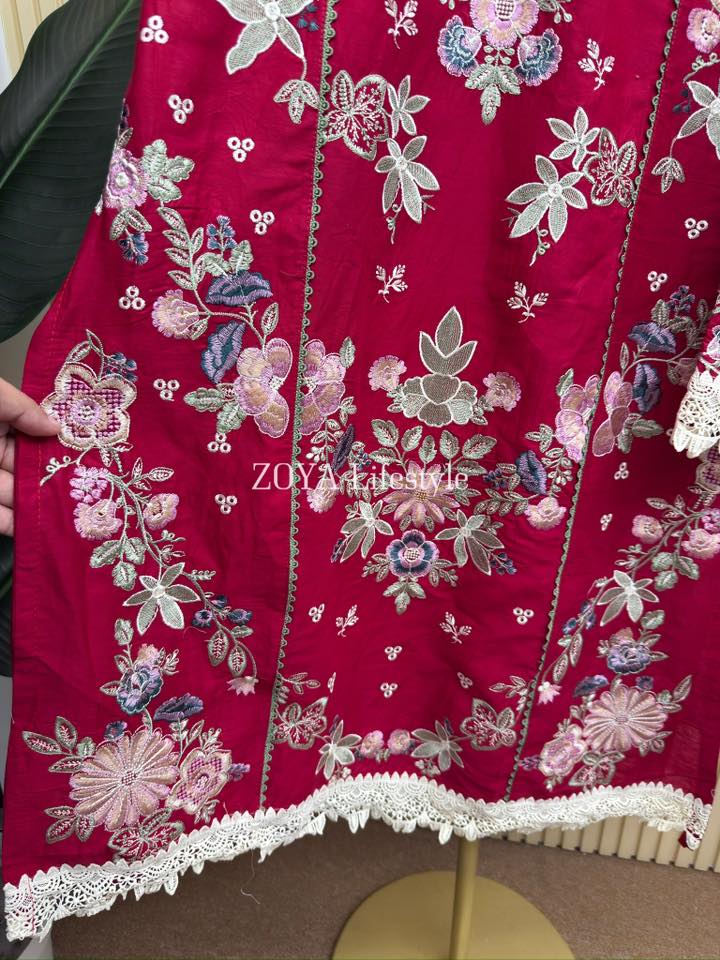 Material: Cotton with embroidery work on full dress. Kota Silk Orna . Cotton pant with embroidery.