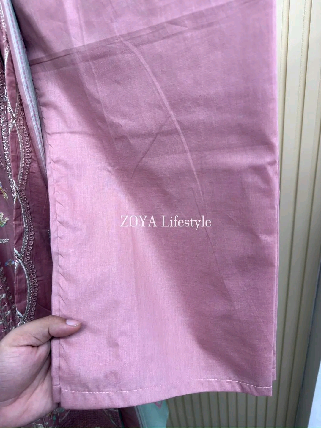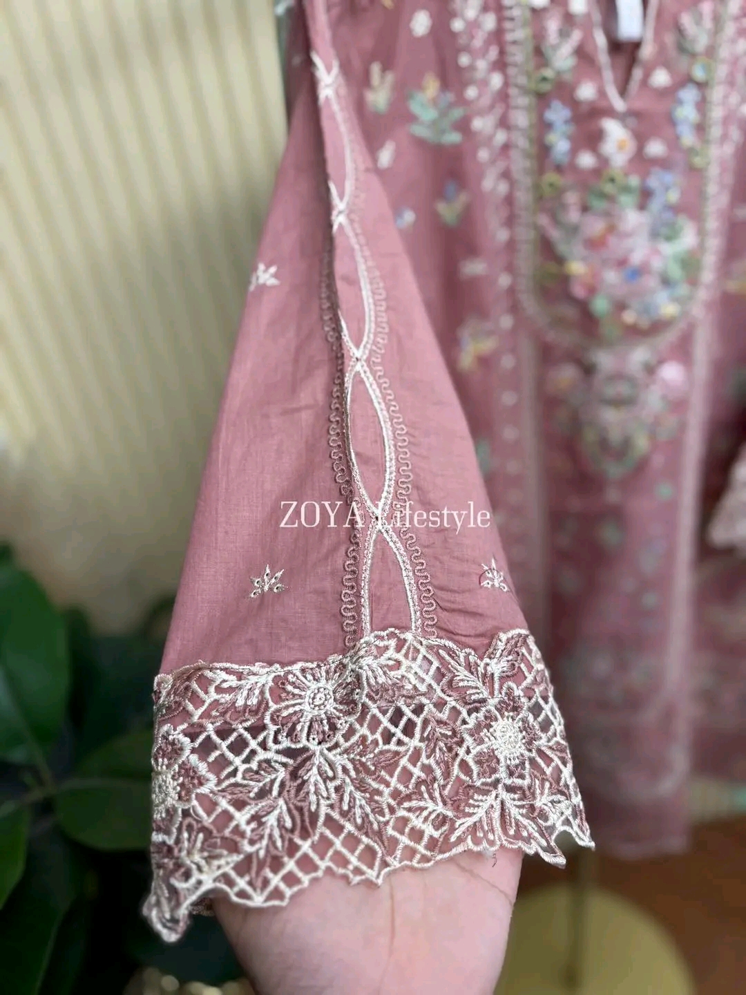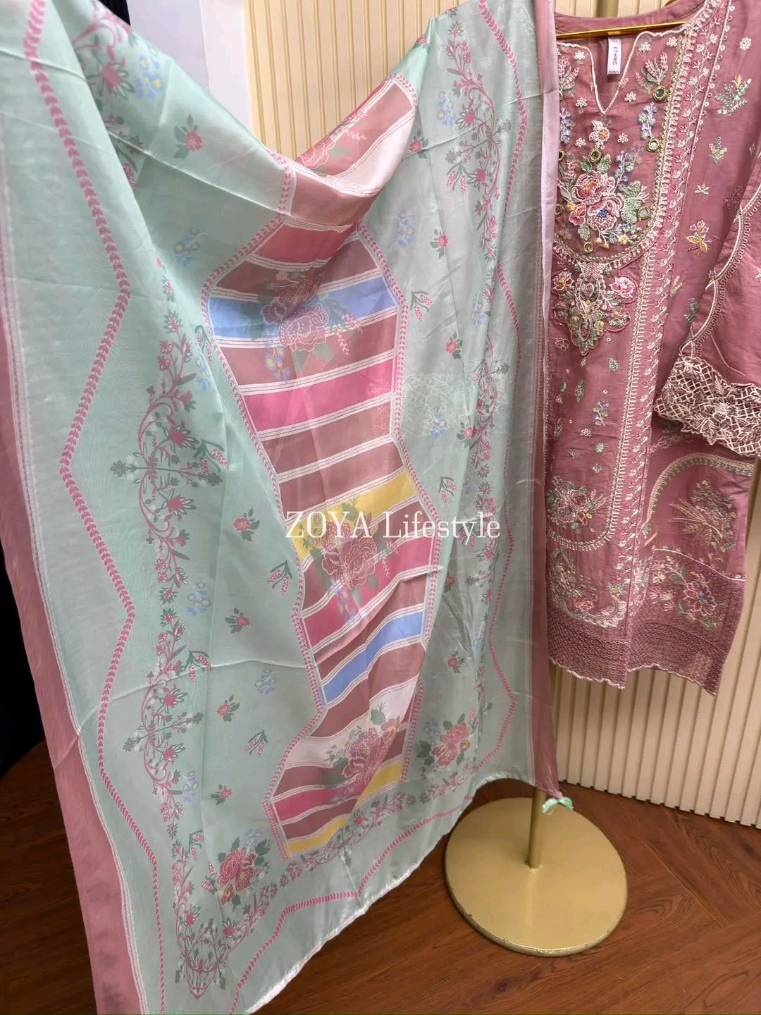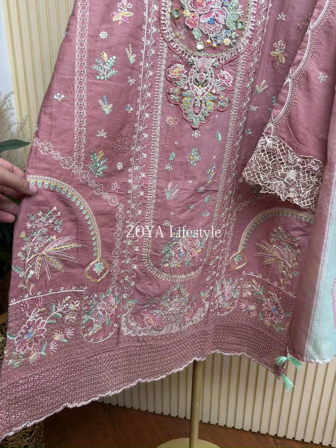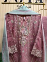 Material: Cotton with mbroidery work on neck to bottom. Mirror work on neck. Cotton pant. Georgette dupatta with Print.