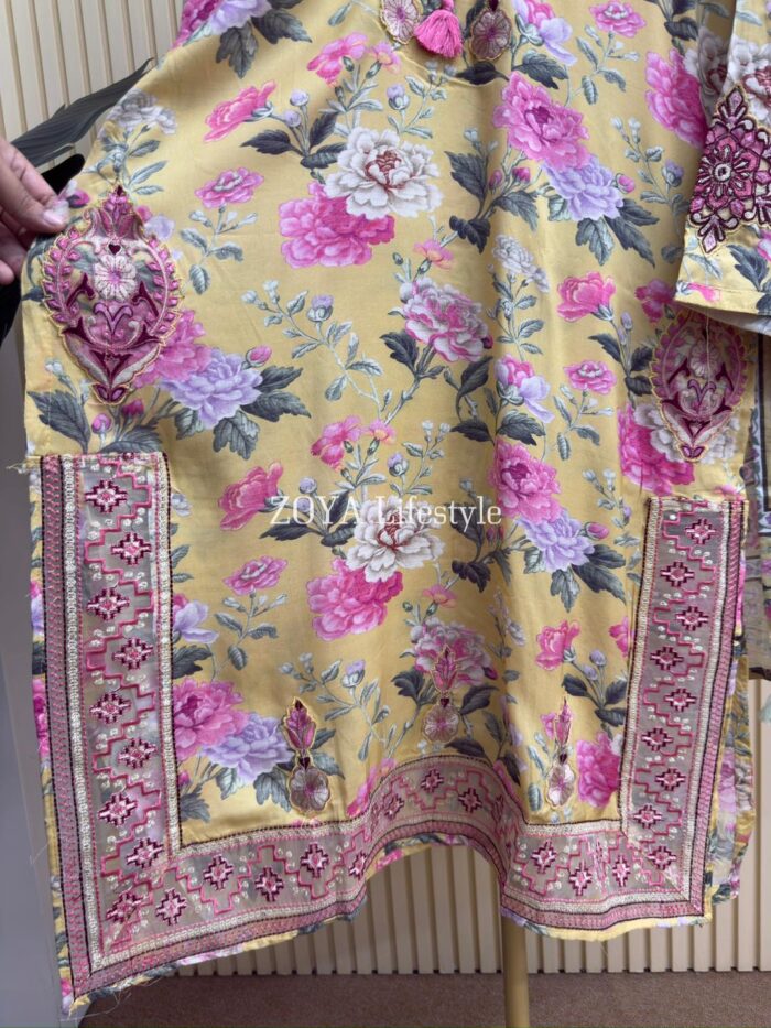 Material: Rayon silk Cotton fabric with embroidered work on sleeves and side border & daamaan. Kota cotton dupatta. Rayon silk Cotton pant.