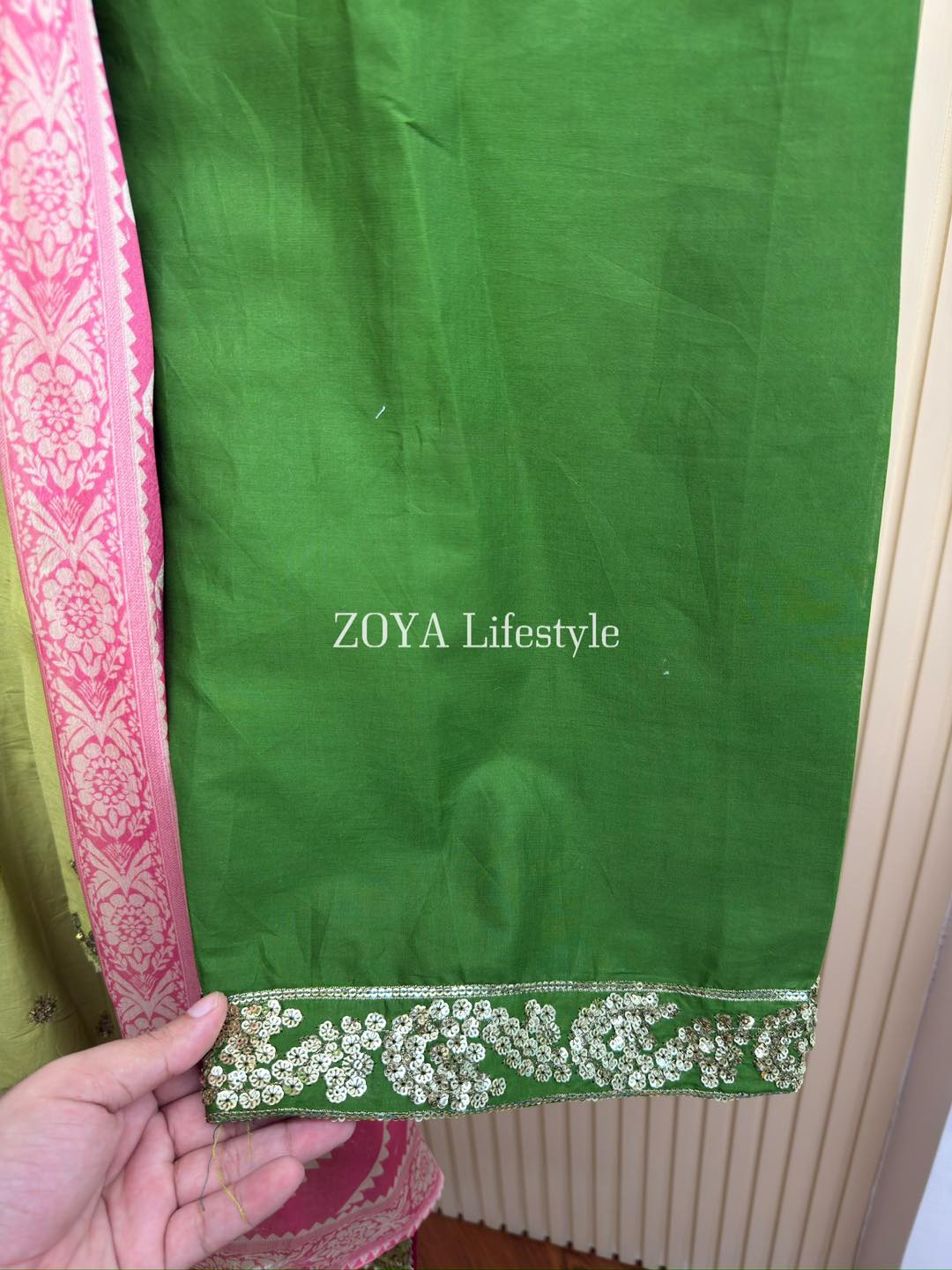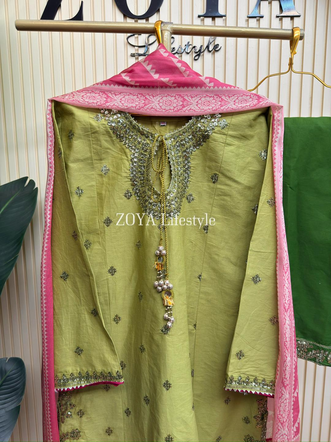Material: Cotton with sequins embroidery work all over. Cotton Farshi pant with sequins embroidered pannel. Printed silk orna.