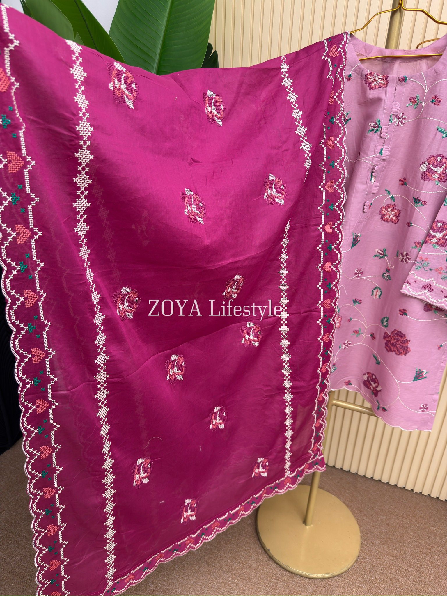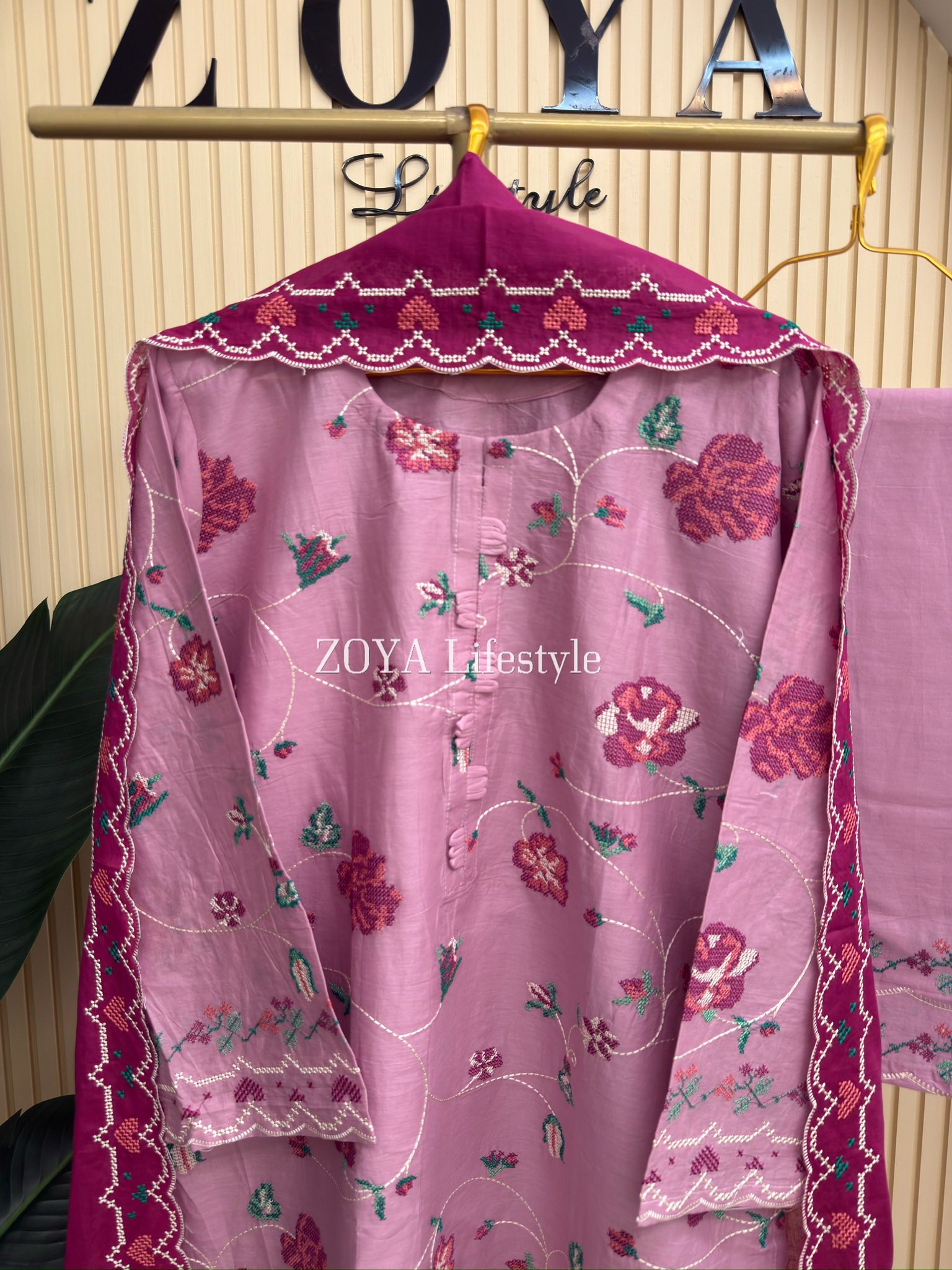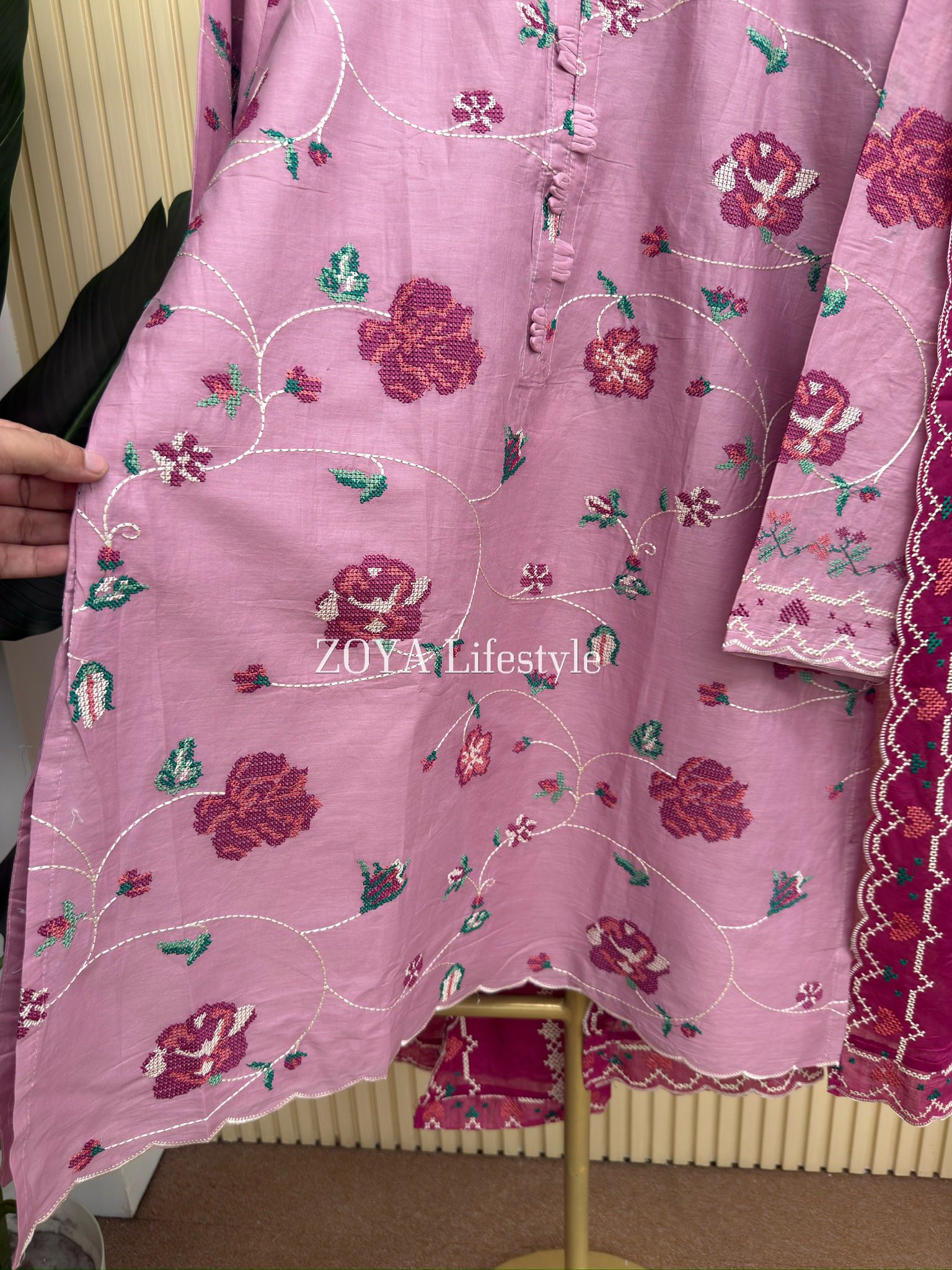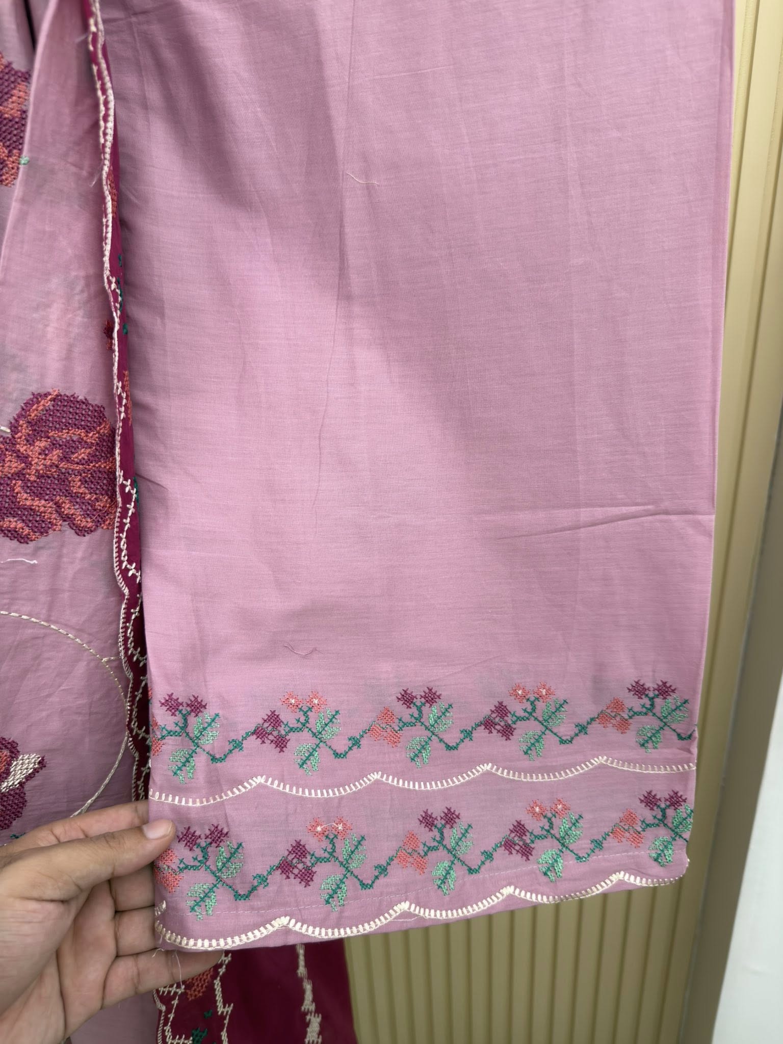 Material: Cotton with cross embroidery work on all over body.. Cotton orna with cross embroidery. cotton Pant with embroidery .