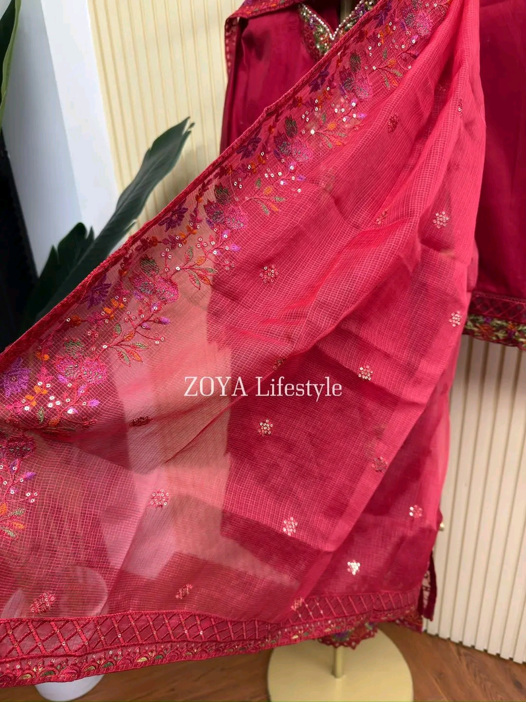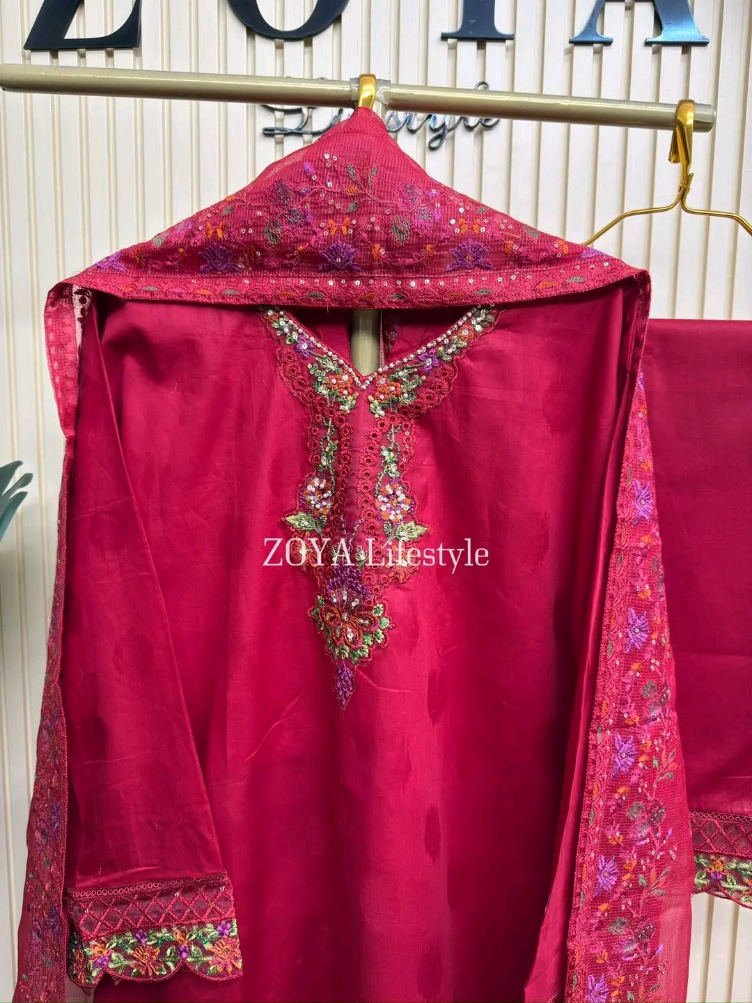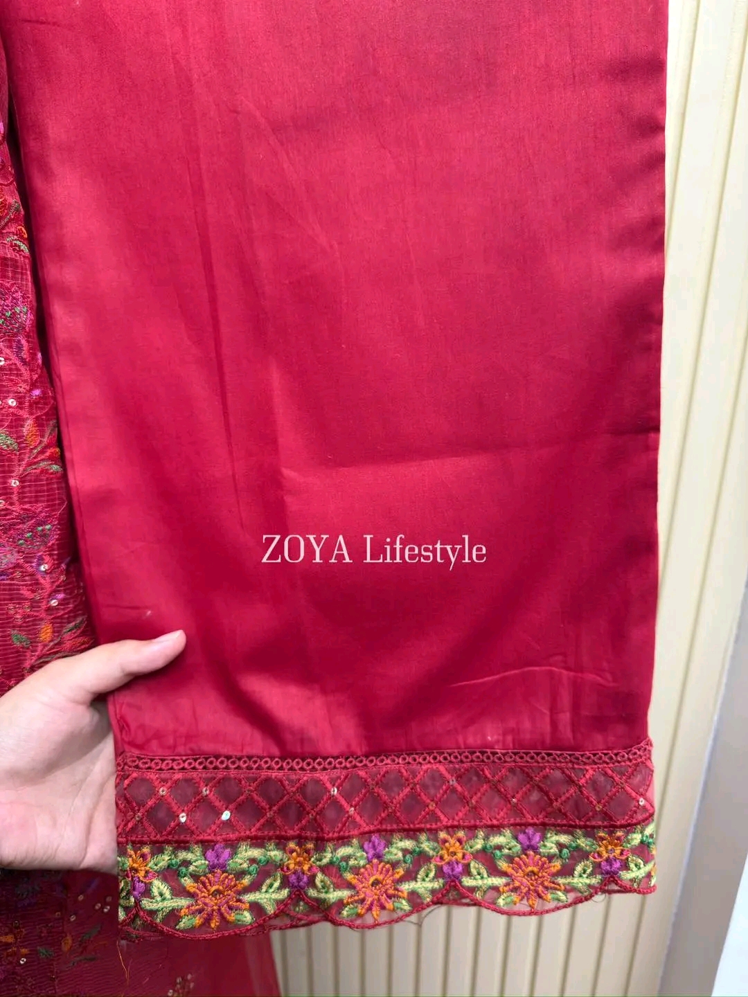 Material: Jaquard Cotton with embroidery work on all over body. Pearl work on neck. Net kota embroidered orna. cotton Pant with embroidery work.