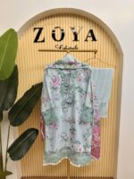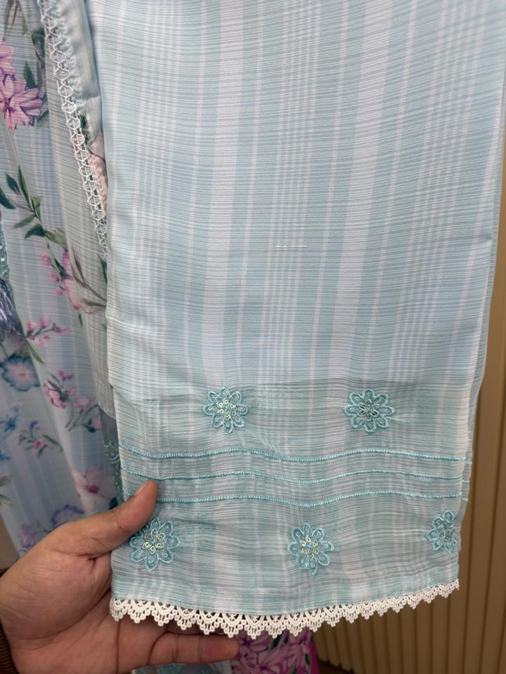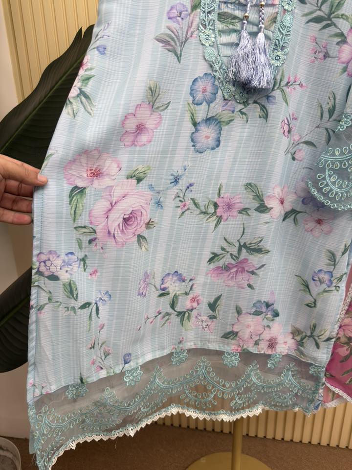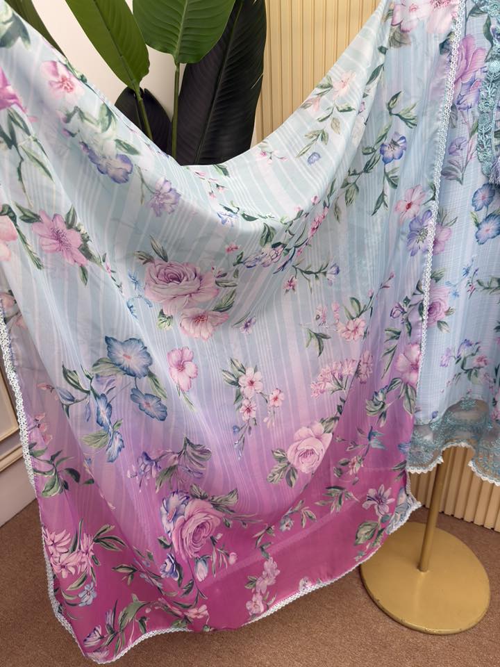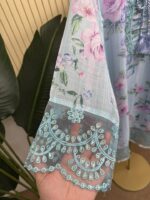 Material: Premium printed Georgette with Embroidery work. Maslin embroidered panel on damaan and sleeves. Inner attached both side on kamiz and pant. Pant georgette. Silk ornament