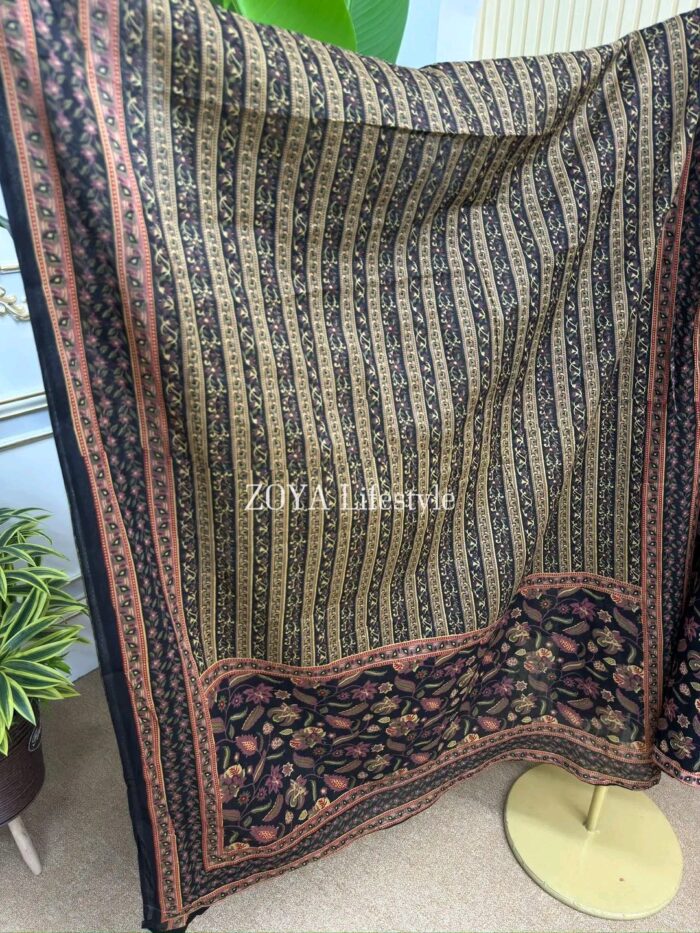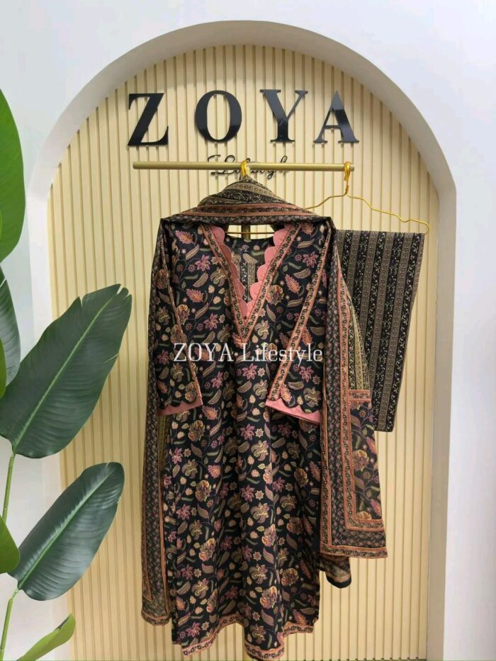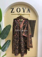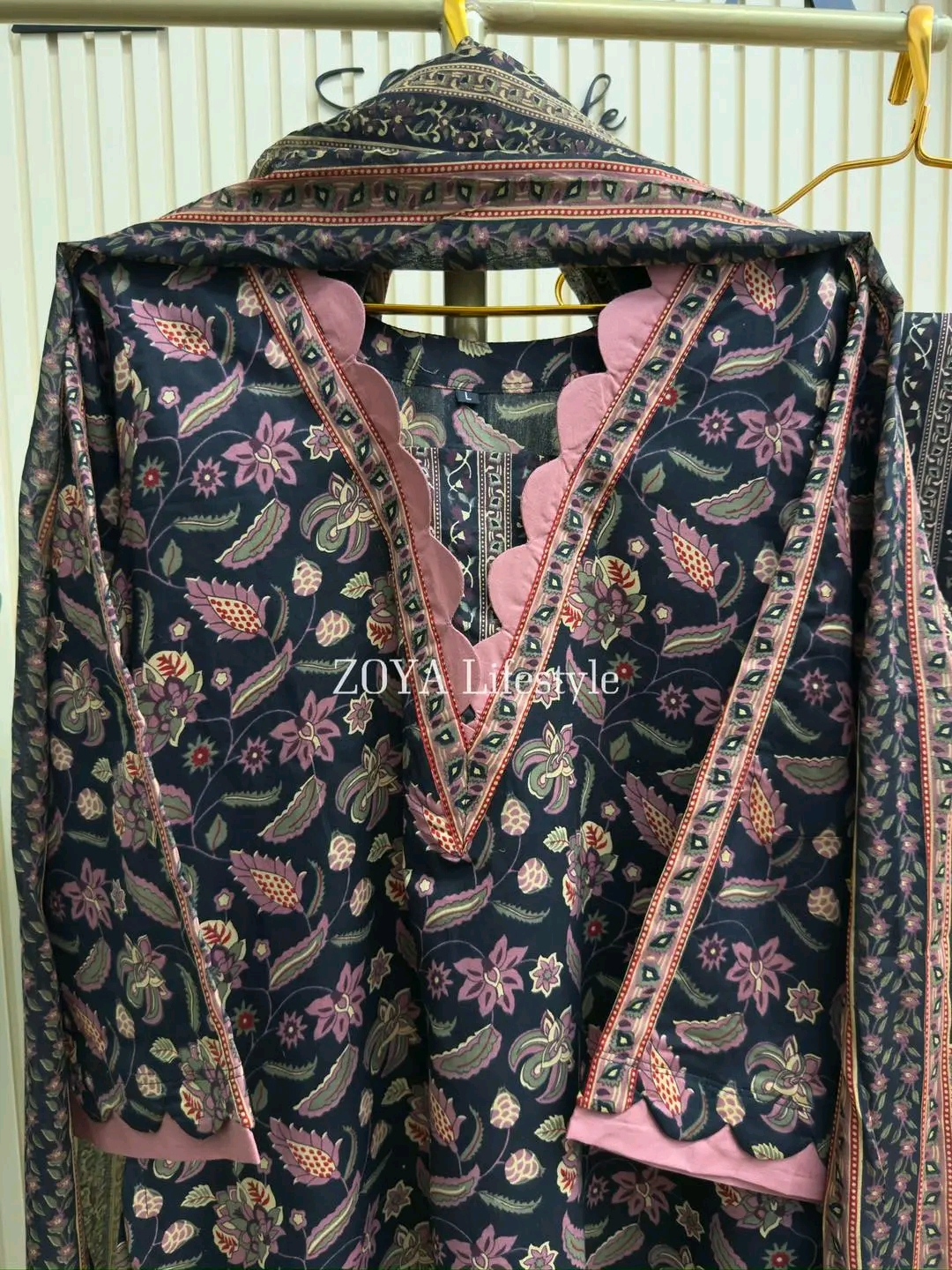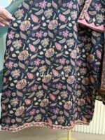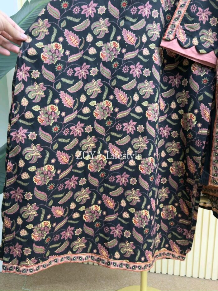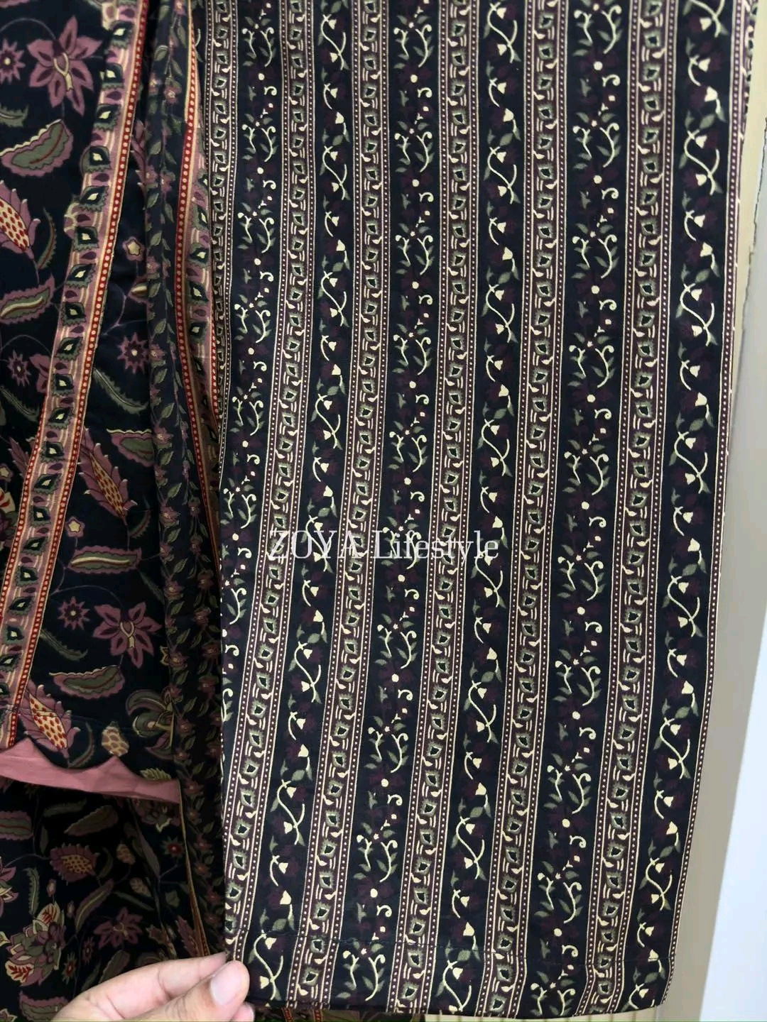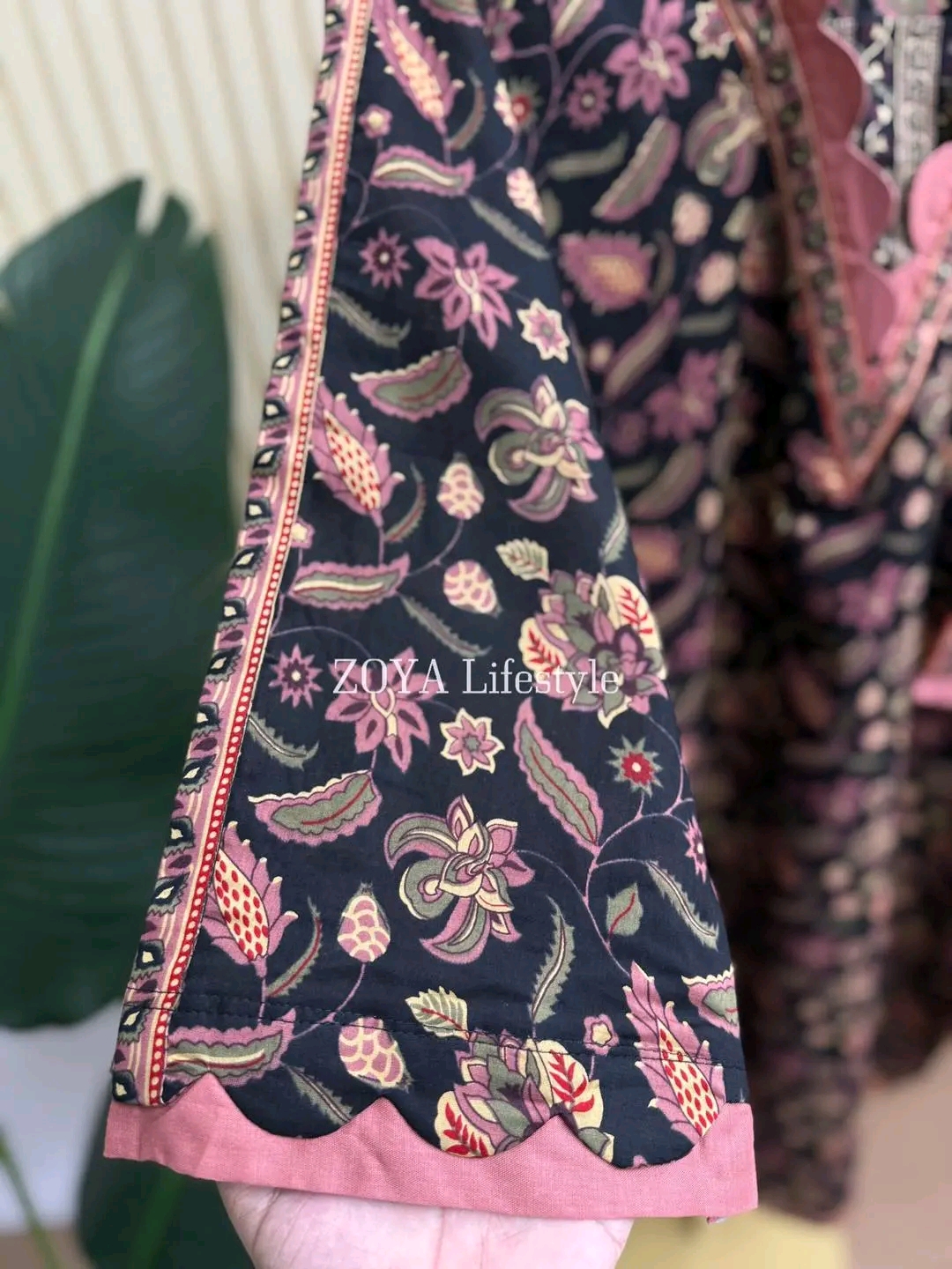 Material: Cotton with all over print. Round design work on neck, sleeves. Cotton pant. cotton orna.