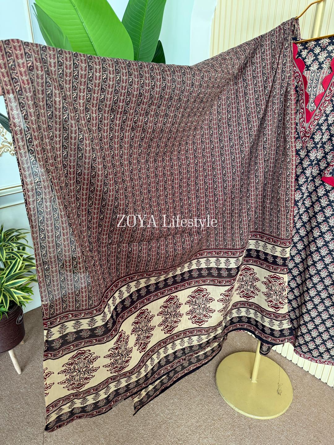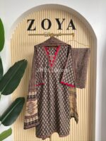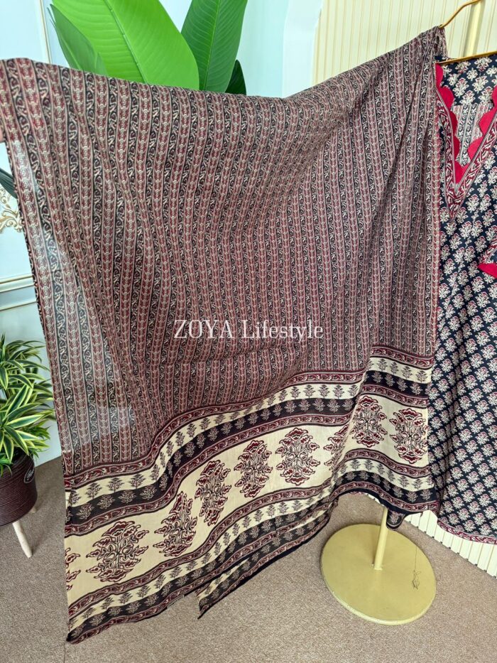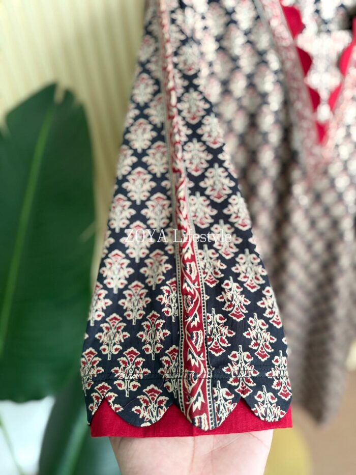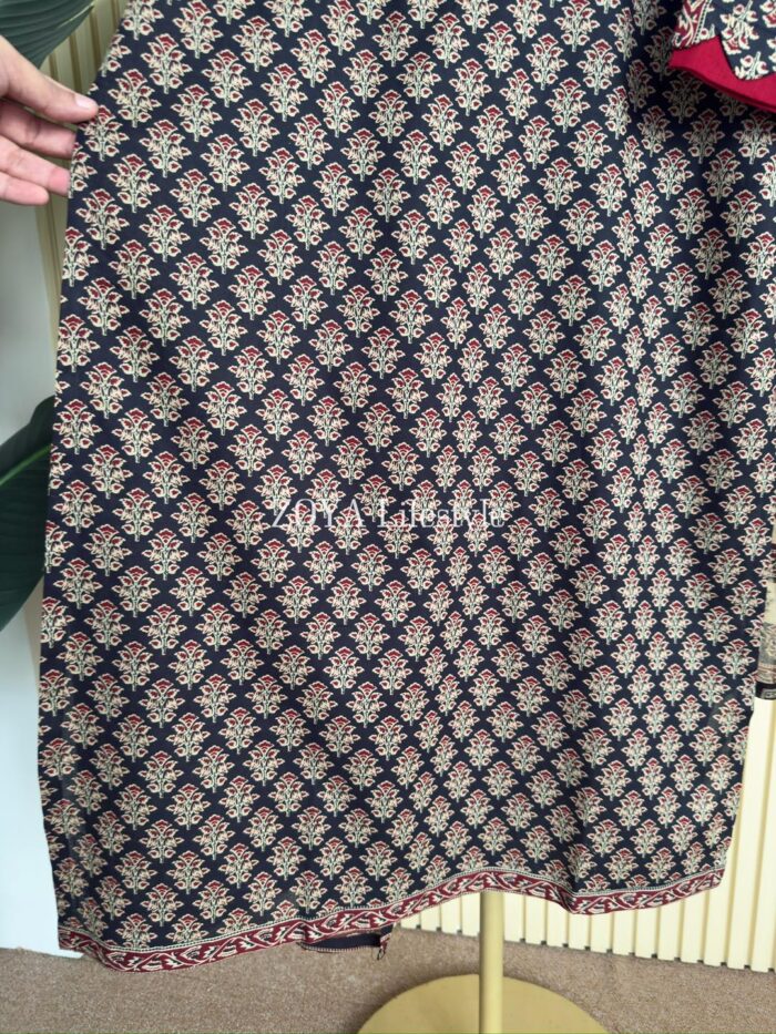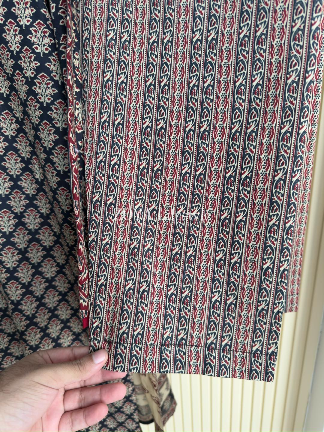Material: Cotton with all over print. Round design work on neck, sleeves. Cotton pant. cotton orna.