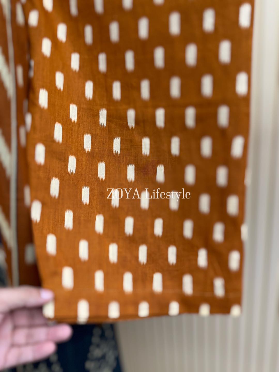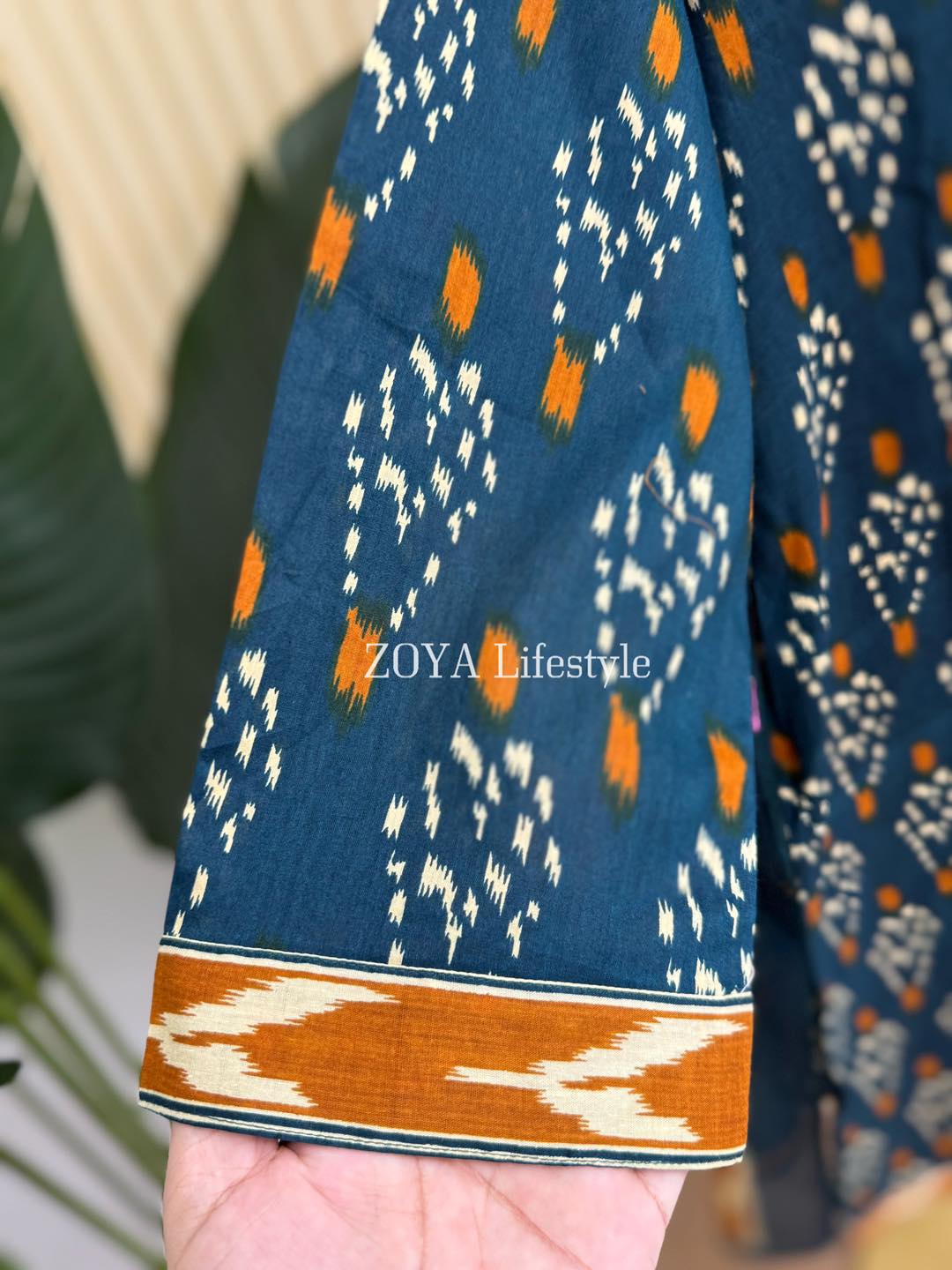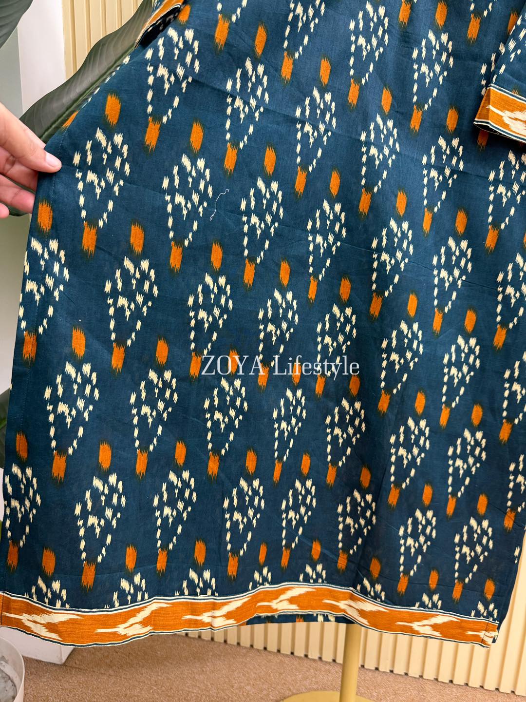 Material: Cotton with all over print. Button design work on neck. cotton orna. Cotton printed pant.