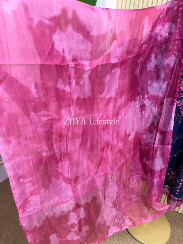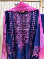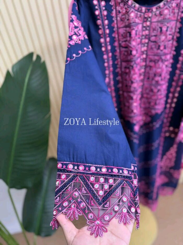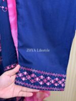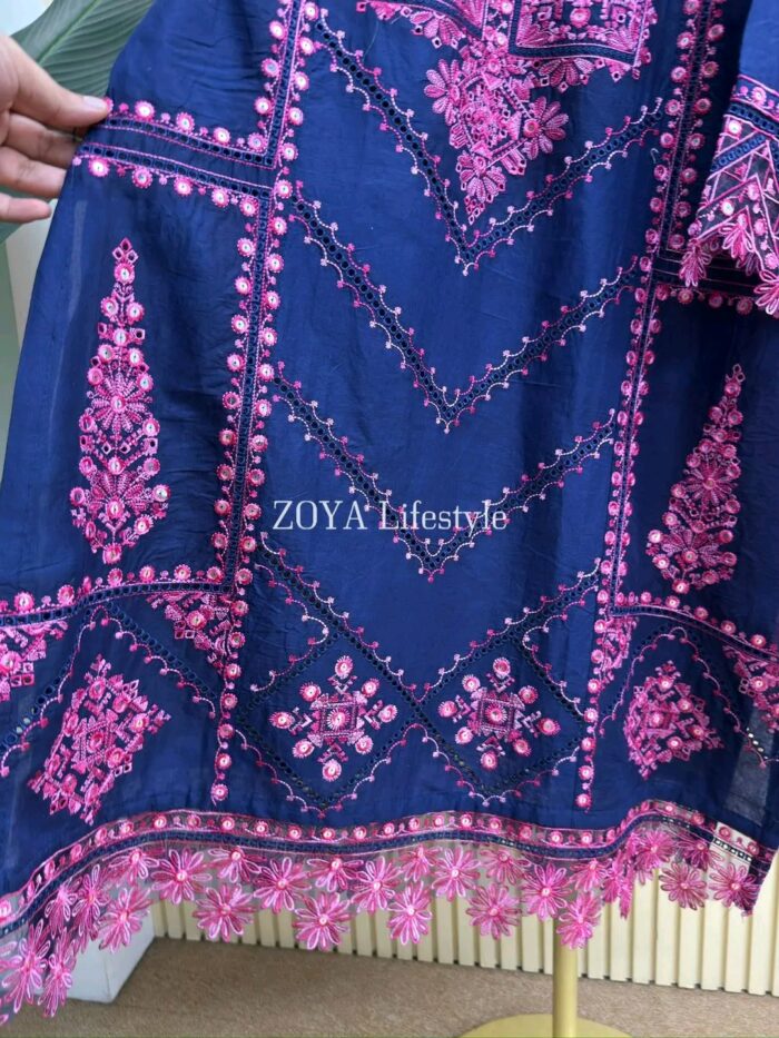 Material: Cotton with chikankari embroidered design on neck to bottom with sitara work. Maslin embroidered pannel work on sleeves & damaan. Kota silk printed orna. Pant cotton with embroidered border.