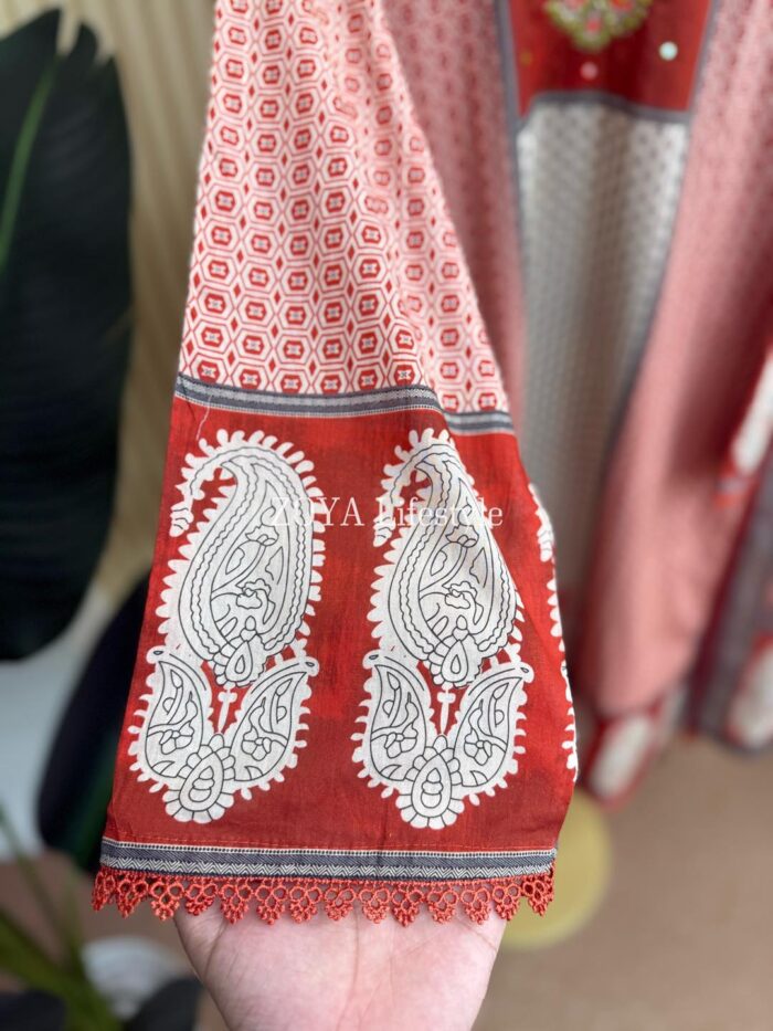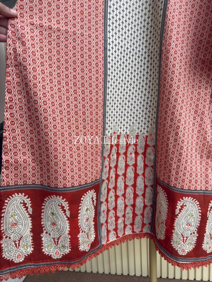 Material: cotton kamiz with hand embroidered on neck amd damaan. Lace work on sleeves and damaan. Kota cotton printed dupatta and cotton pant.