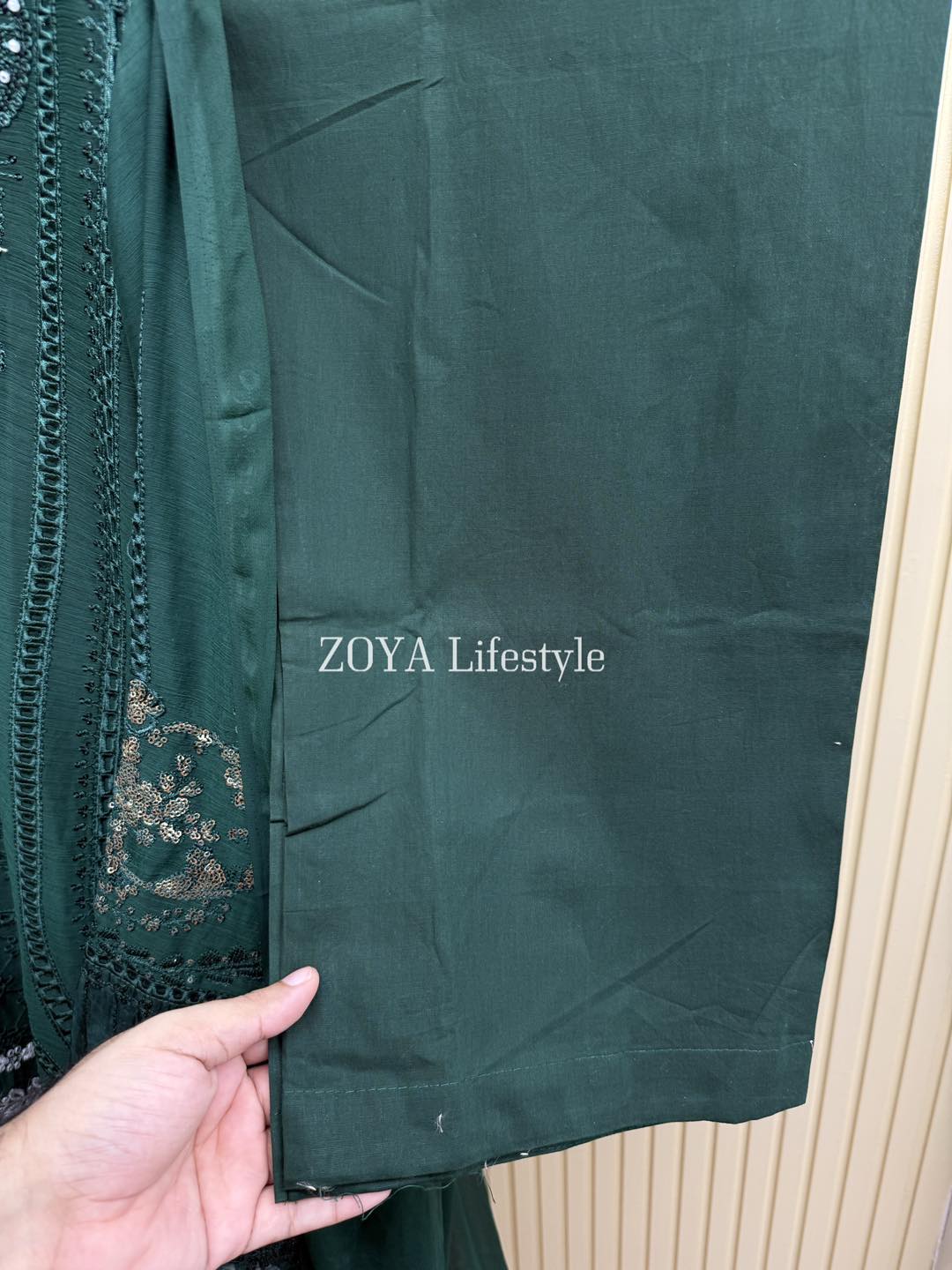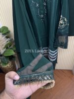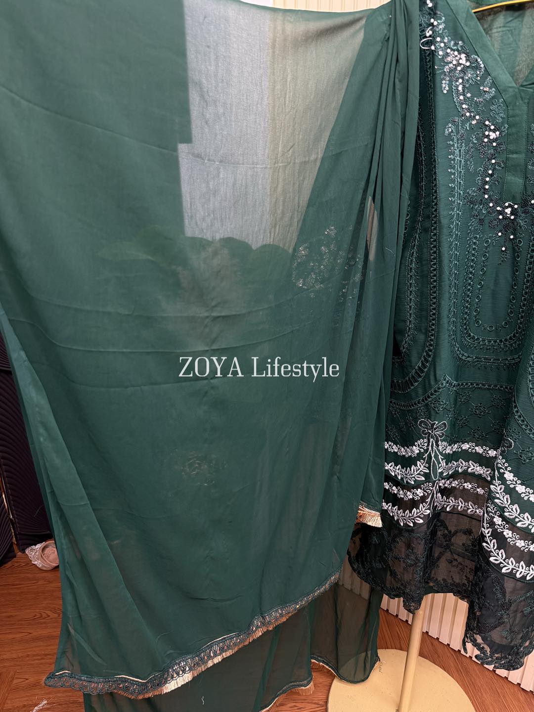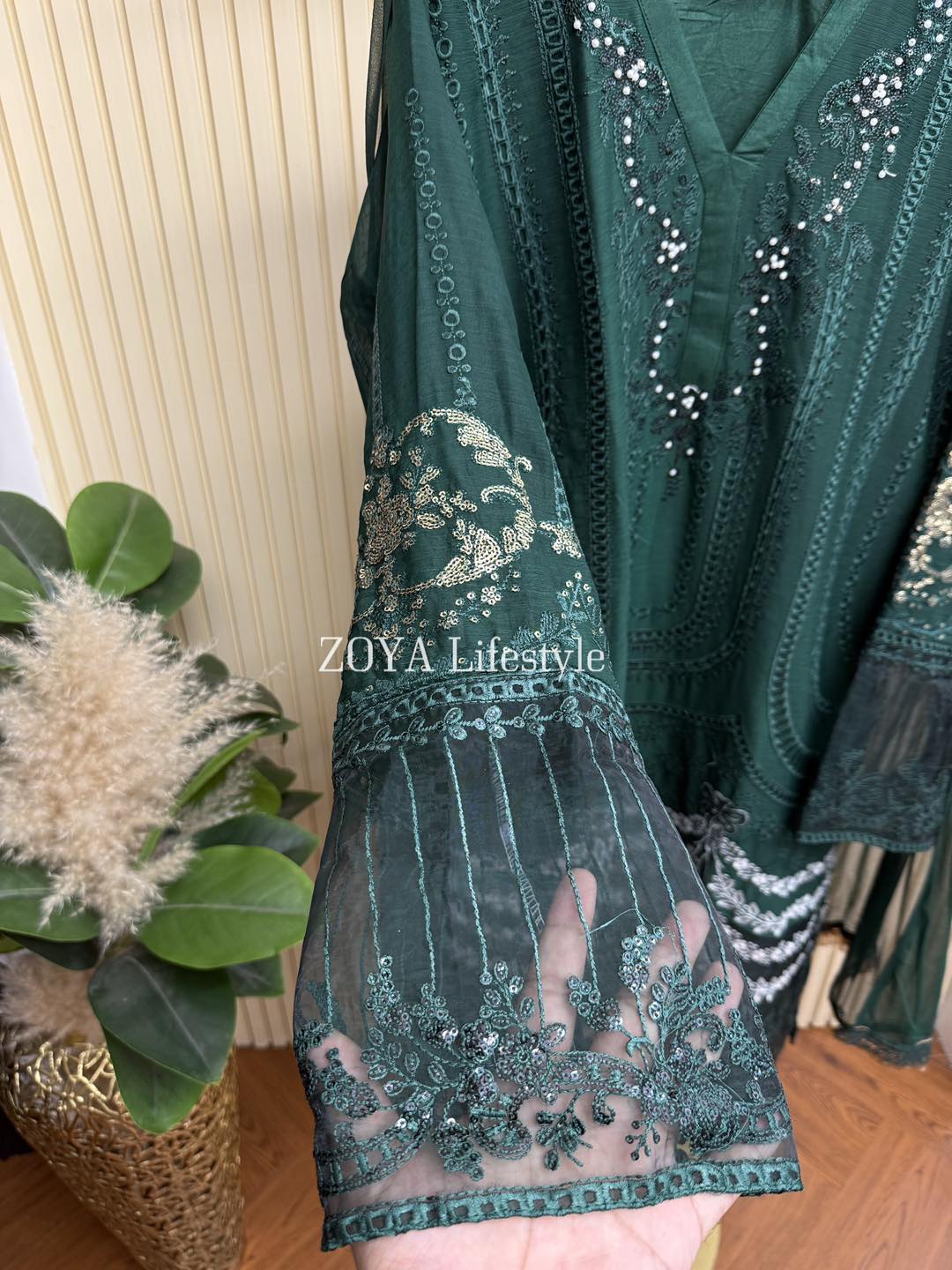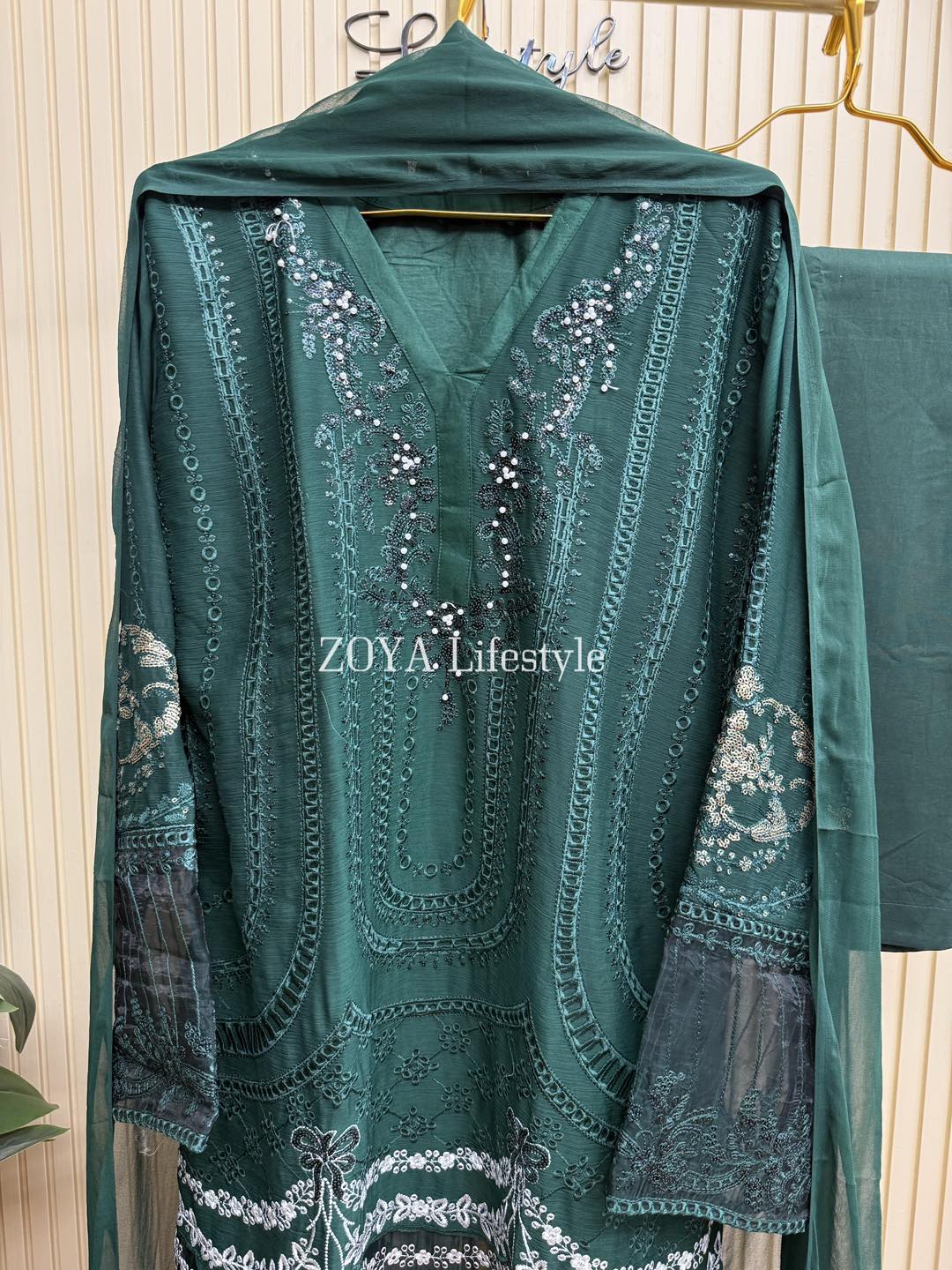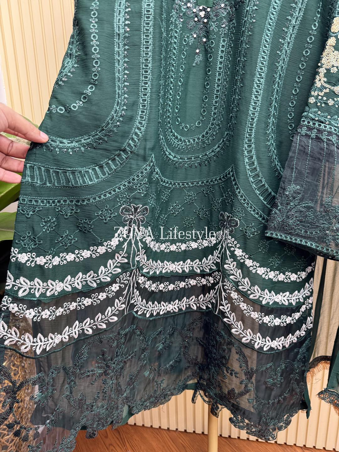 Material: Chiffon with embroidery & sequins work on whole body. Raw Silk inner attached. Chiffon orna. Cotton Pant.