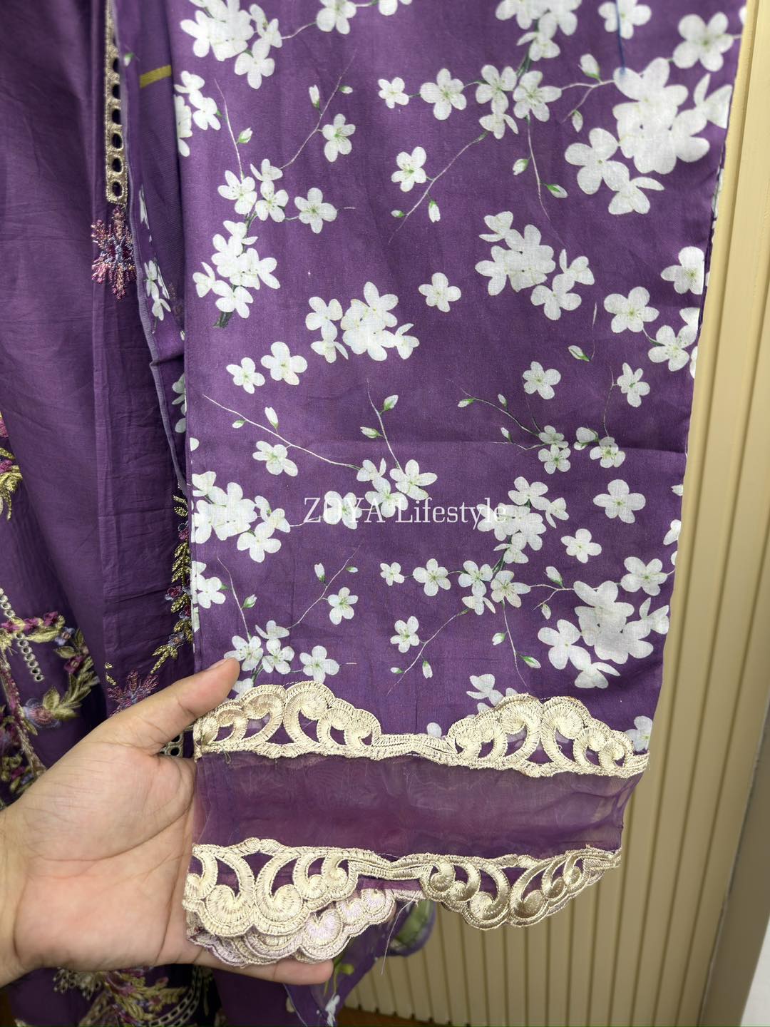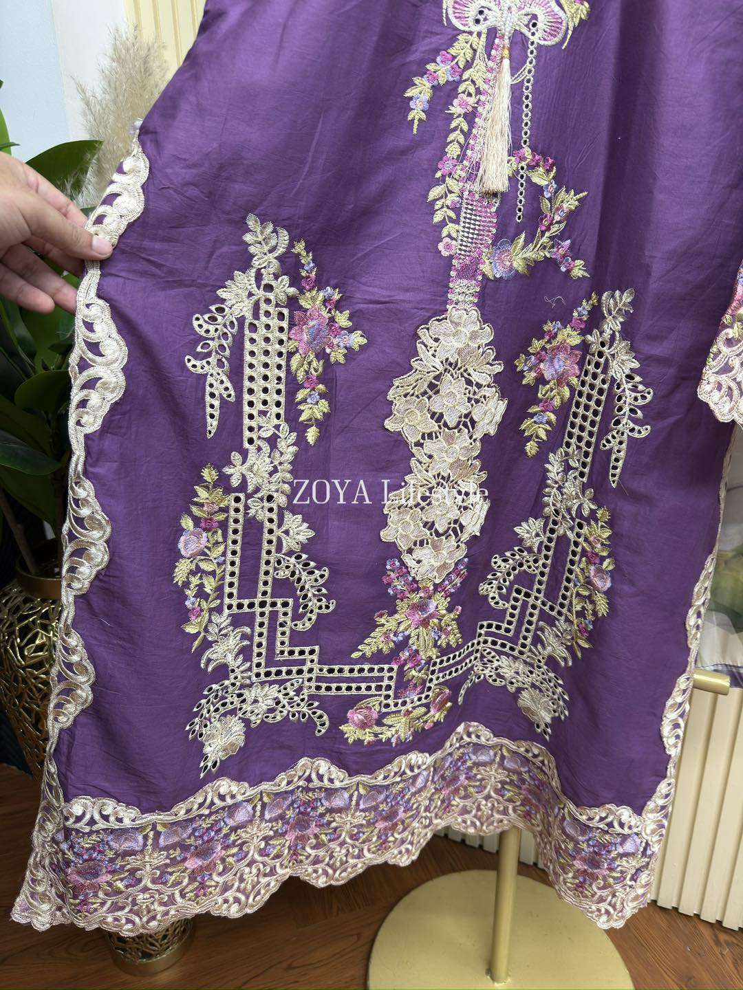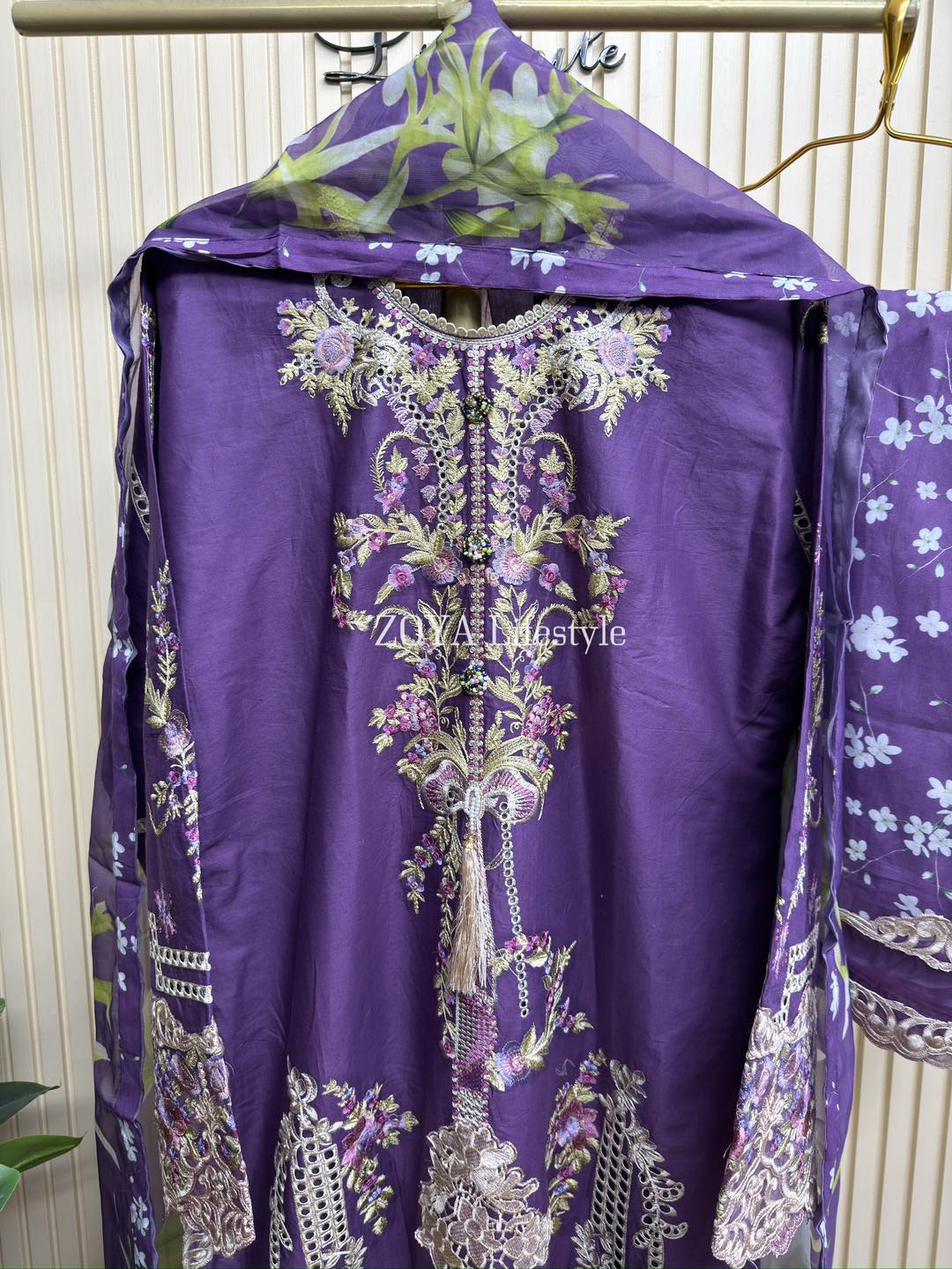 Material: Premium cotton with heavy embroidery and boaring work on all over body. Cotton printed pant with embroidered border. Maslin Georgette printed dupatta.