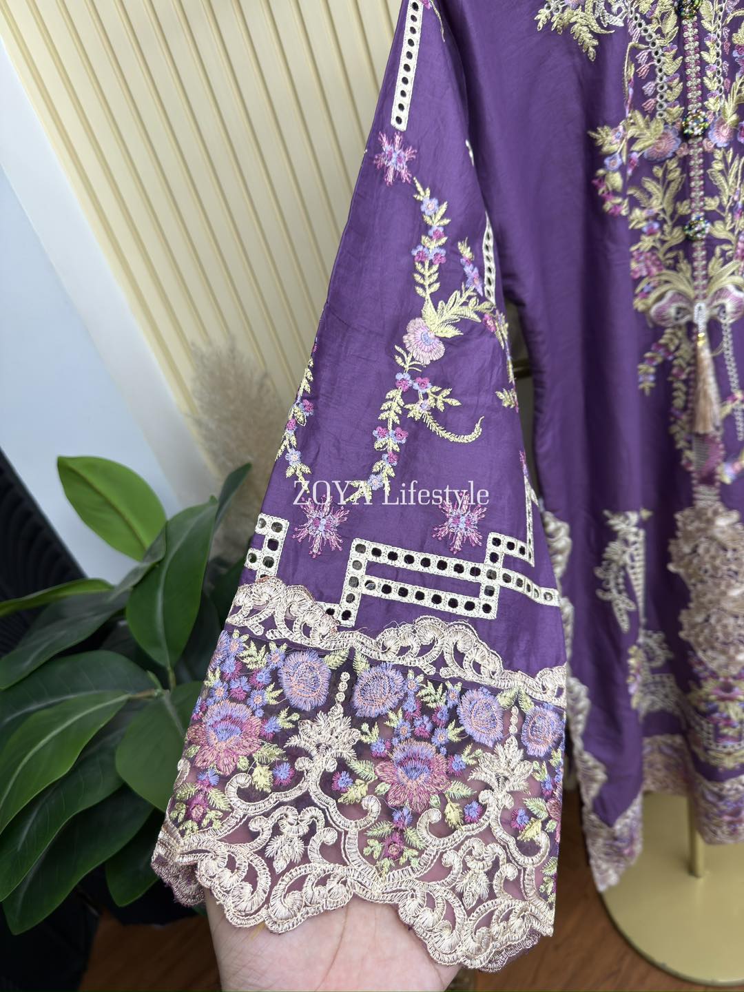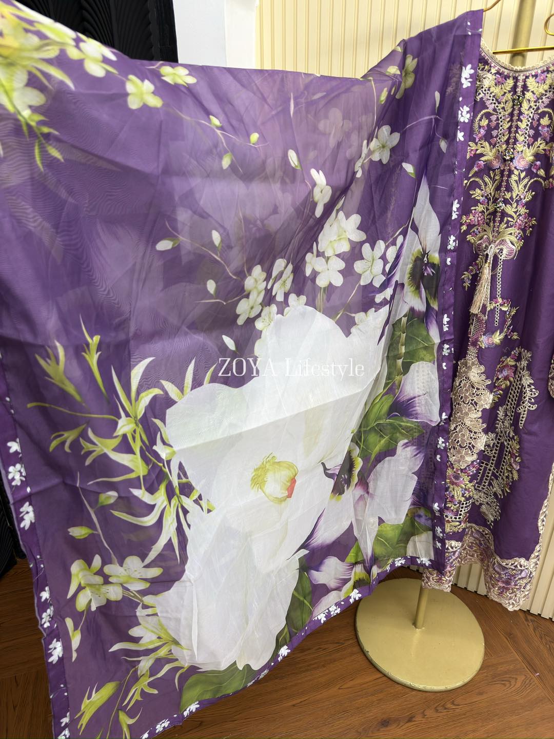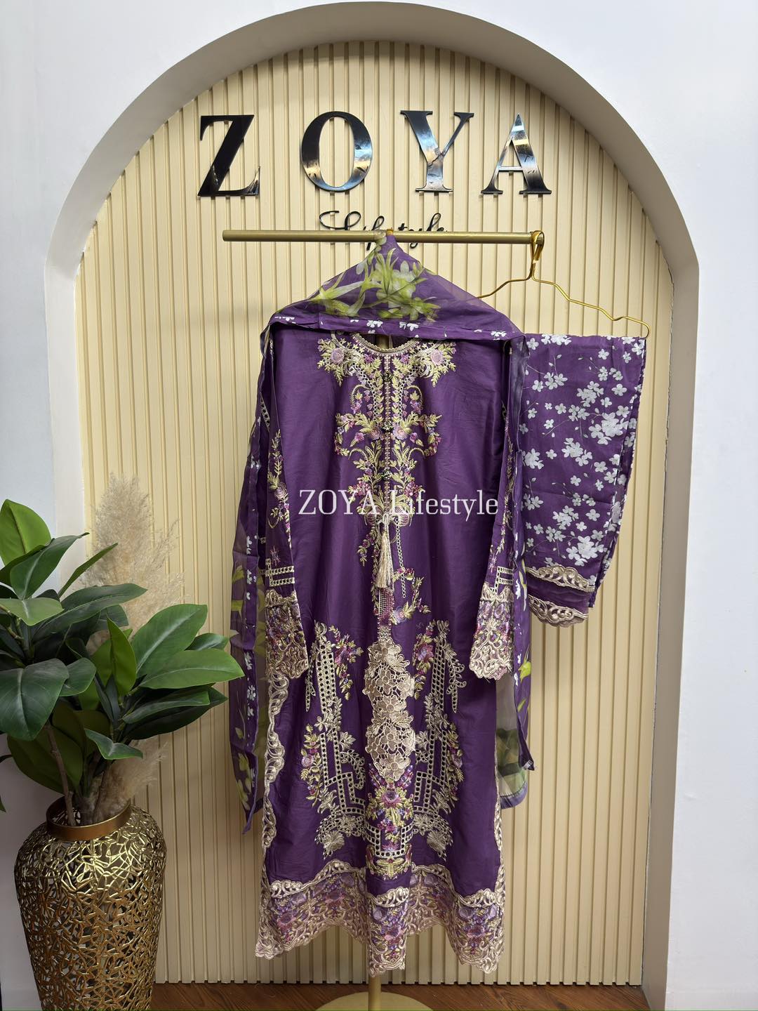 Material: Premium cotton with heavy embroidery and boaring work on all over body. Cotton printed pant with embroidered border. Maslin Georgette printed dupatta.