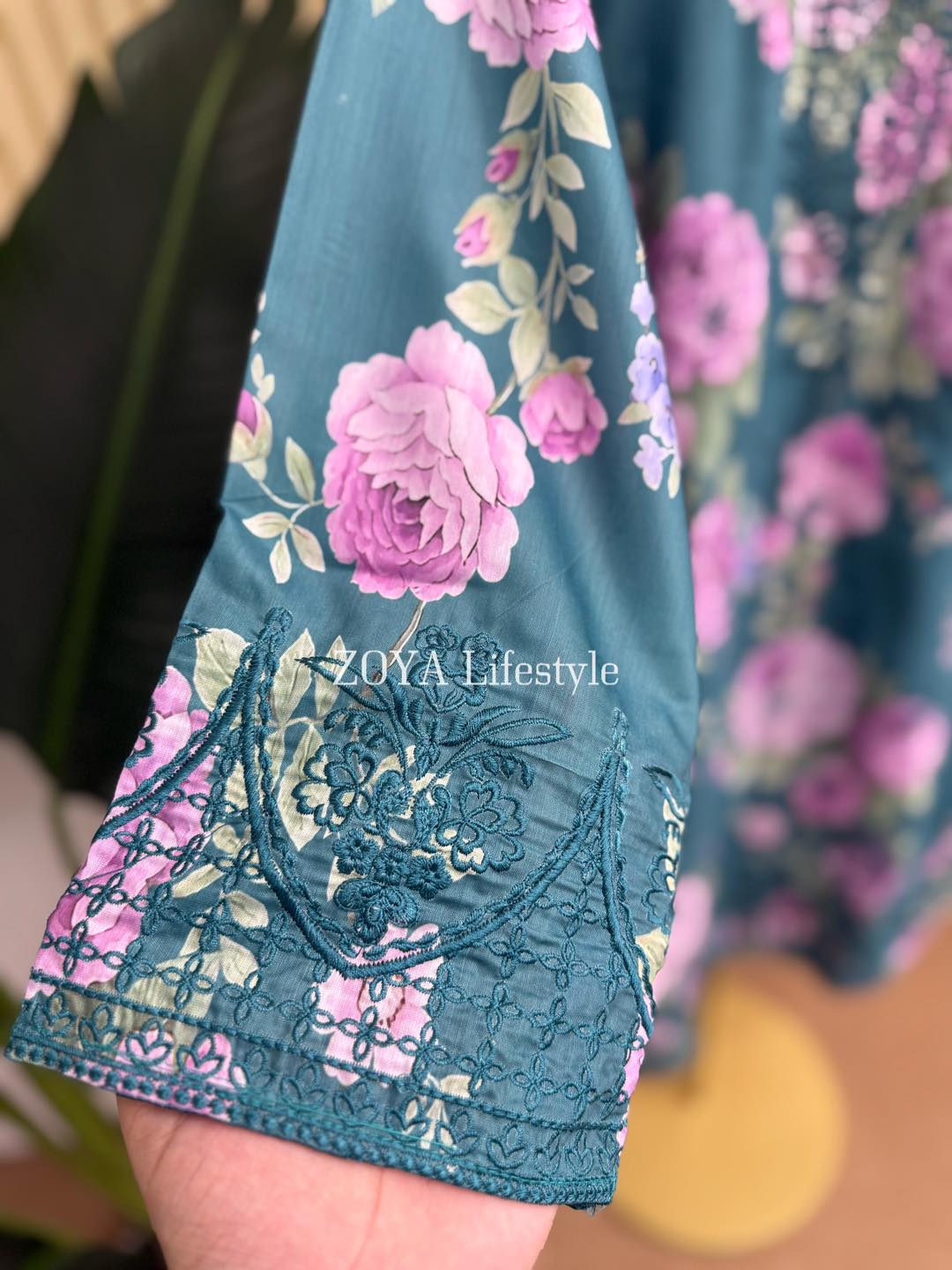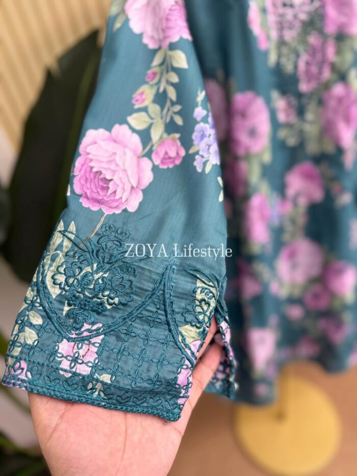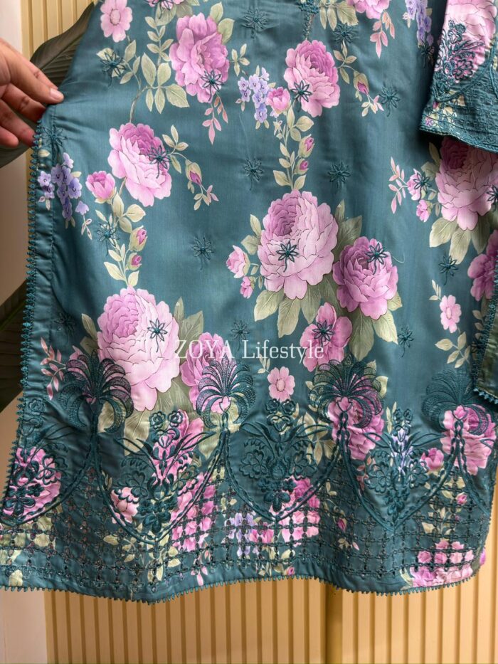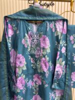 Material: Cotton Silk kamiz with all over digital prints. Embroidery work on neck to bottom. Silk printed dupatta with lace border. Cotton silk pant.
