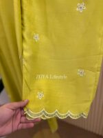 Material: jacquard Rayon silk Cotton kamiz with embroidery work on full front part. Embroidered boarding on sleevs. Must need to wear inner.