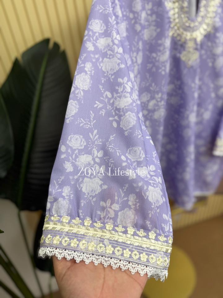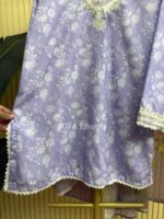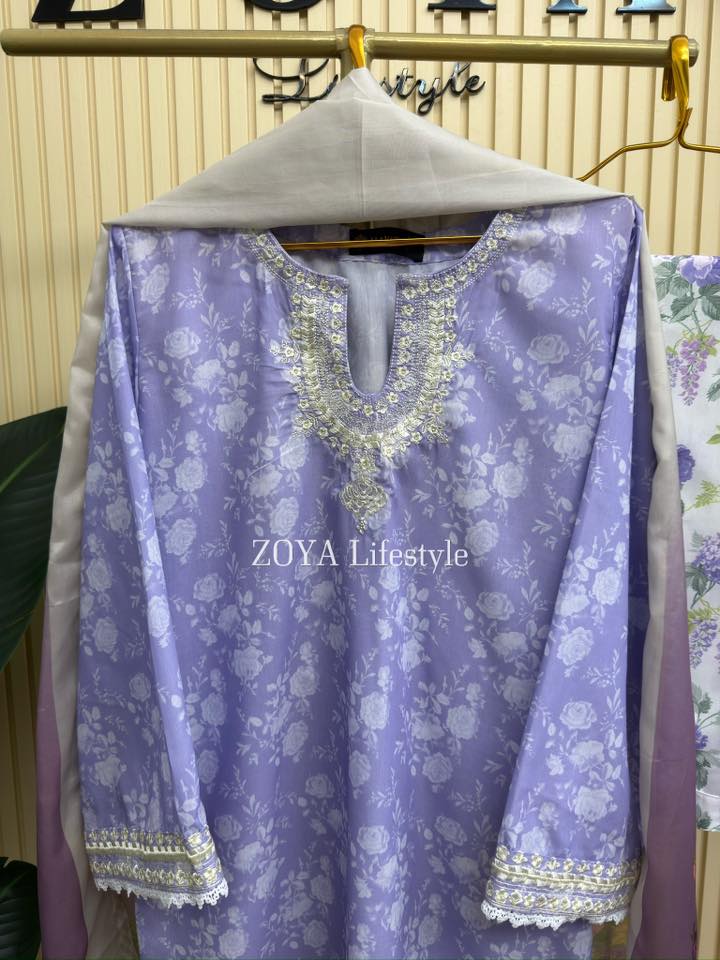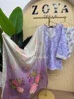 Material: Cotton Silk kamiz with all over digital prints. Embroidered work on neck and sleevs. Lace border on sleeves and damaam.Cotton silk printed pant. Silk Dupatta printed.