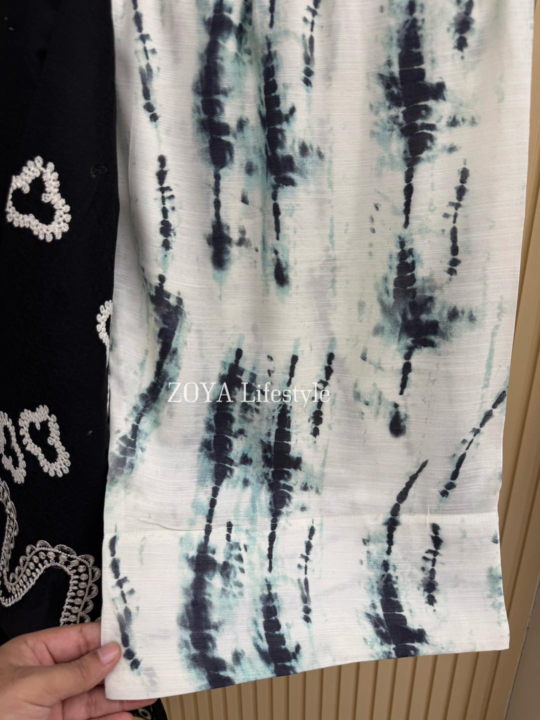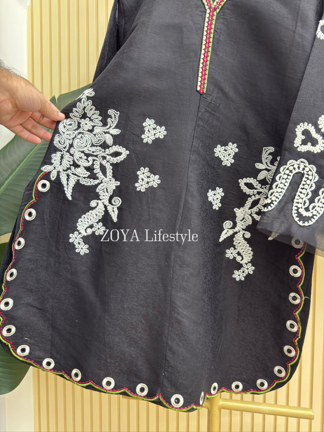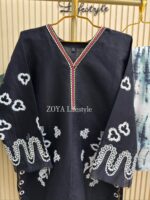 Material: Jaquard Cotton kamiz with embroidery work on neck, sleeves, front side borders and front side Damaan. Loose Pant Rayon Silk Cotton.