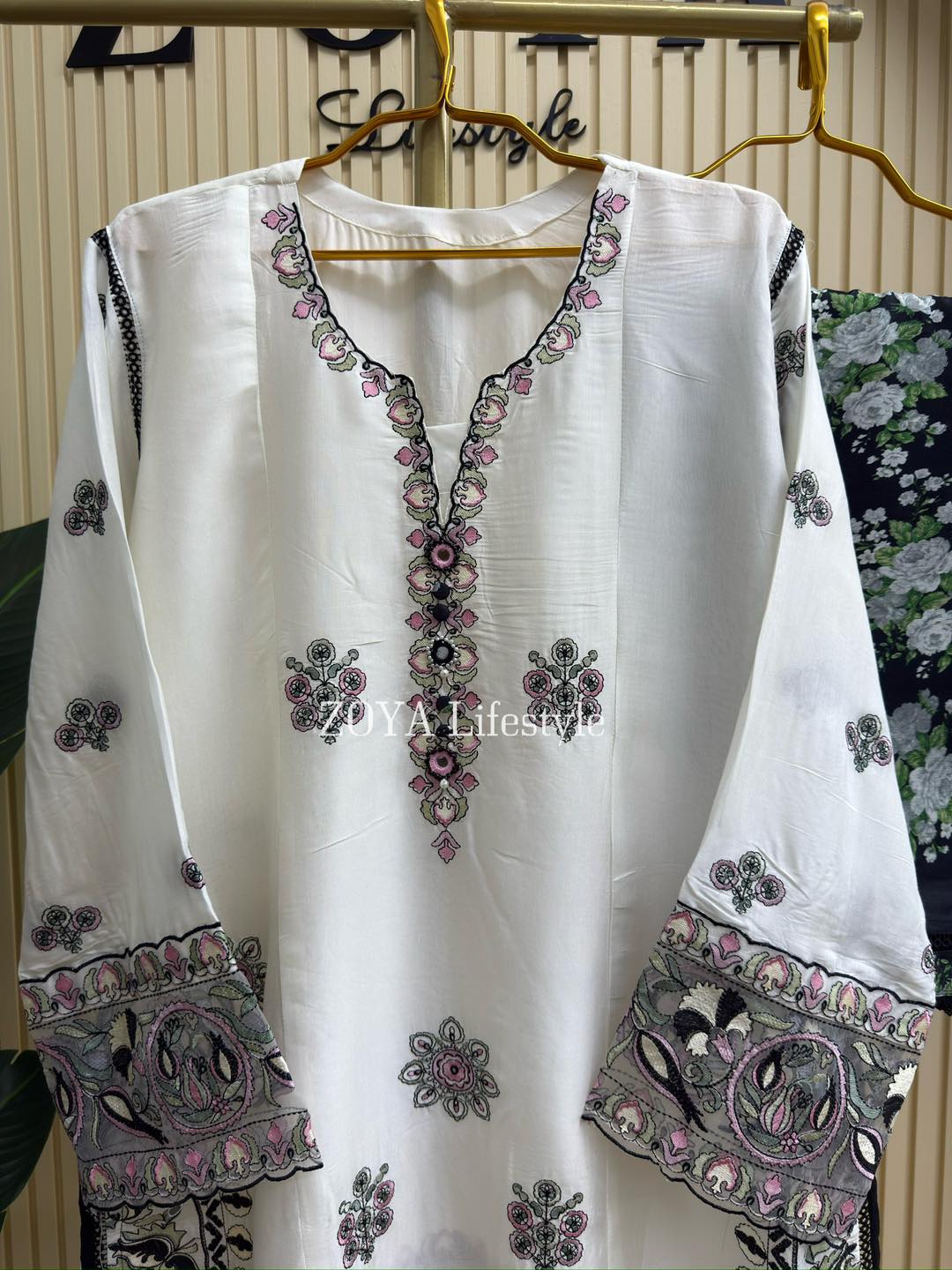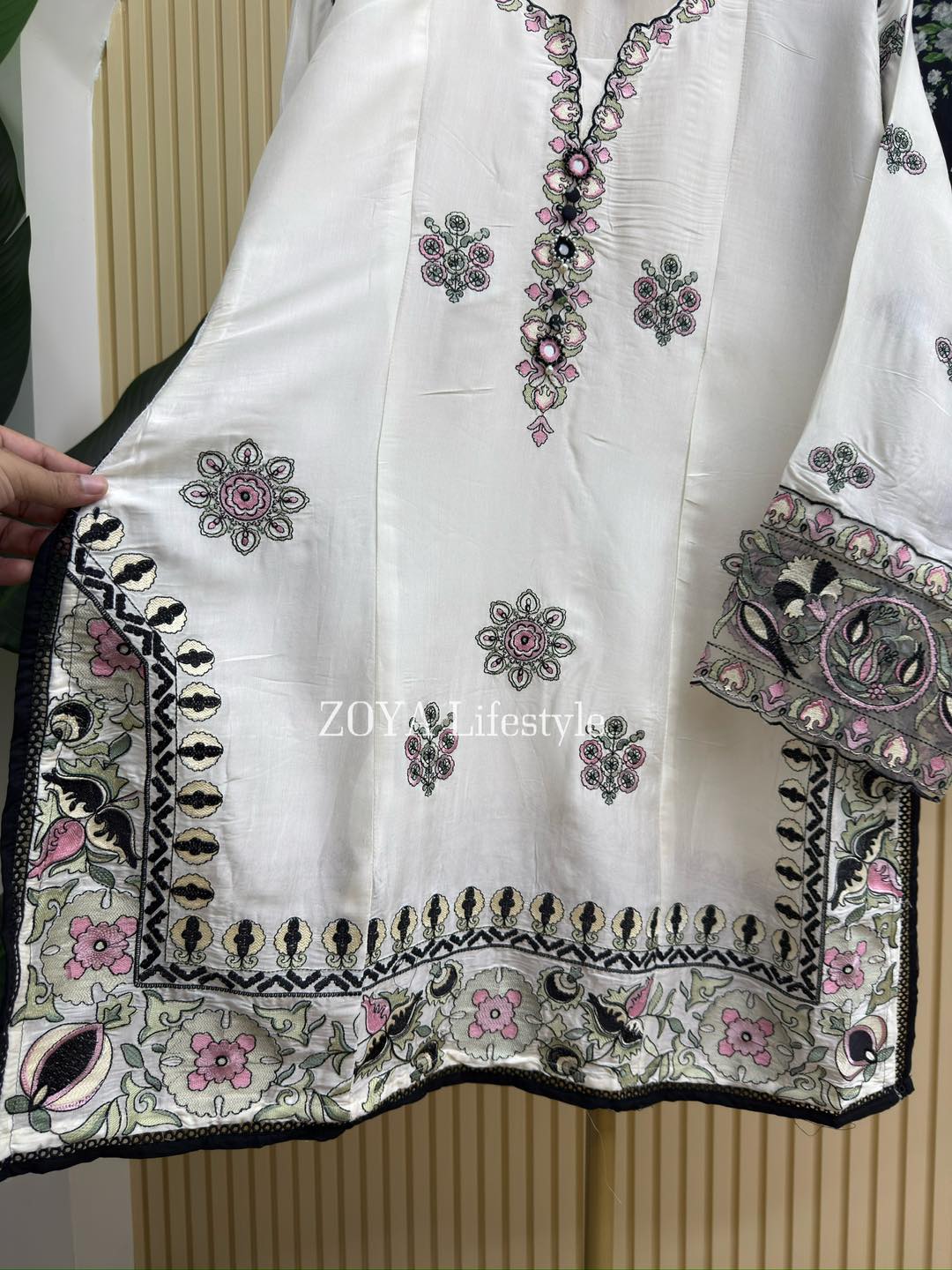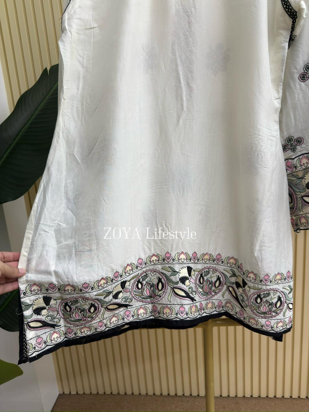 Material: Rayon silk Cotton kamiz with embroidery work on full front part and back damaan. Must need to wear inner. Farshi Pant Rayon silk Cotton printed with lace border.