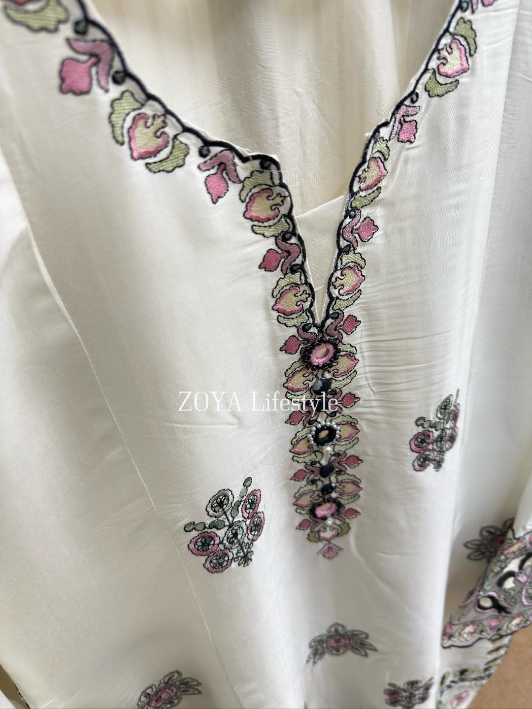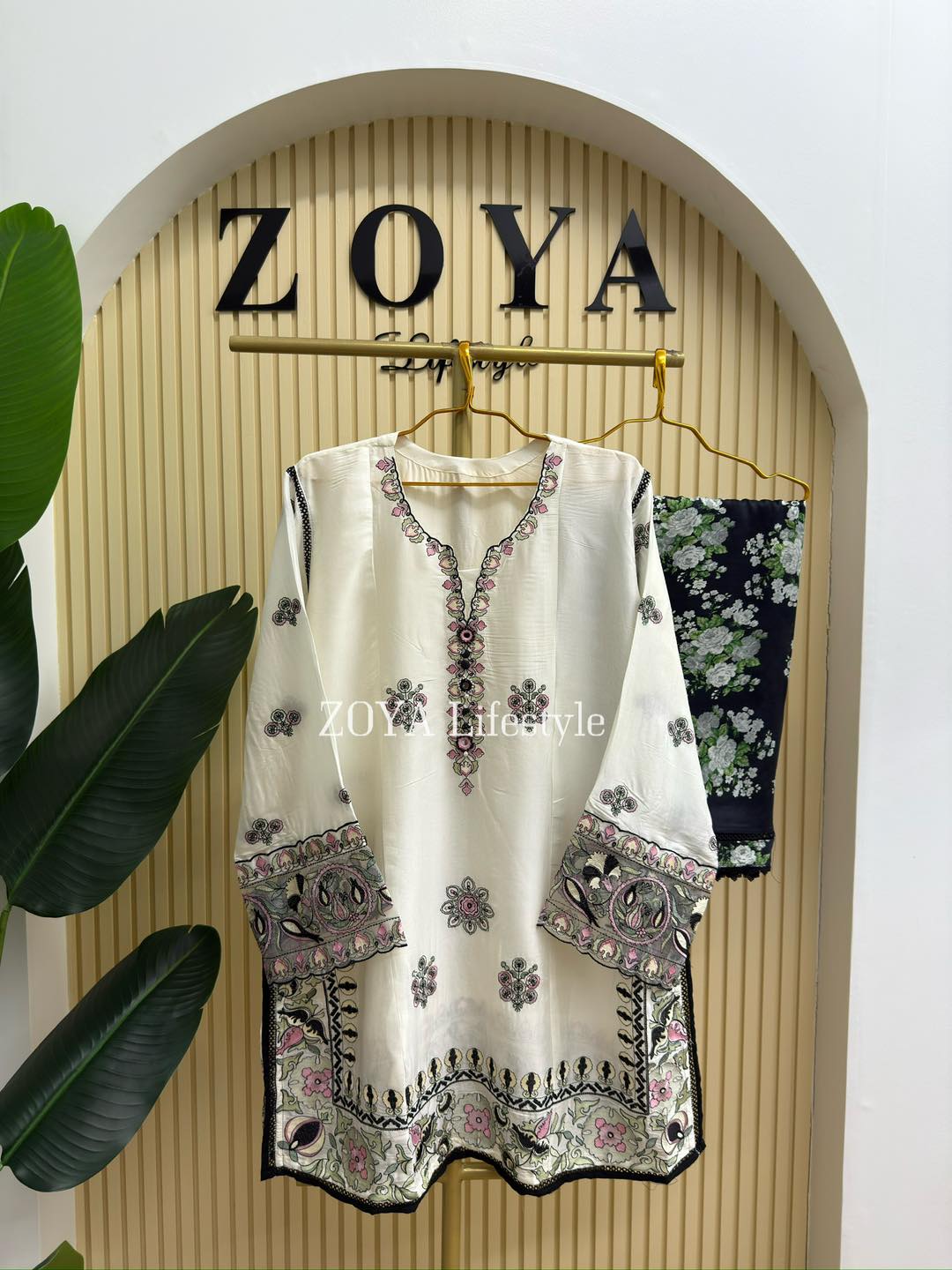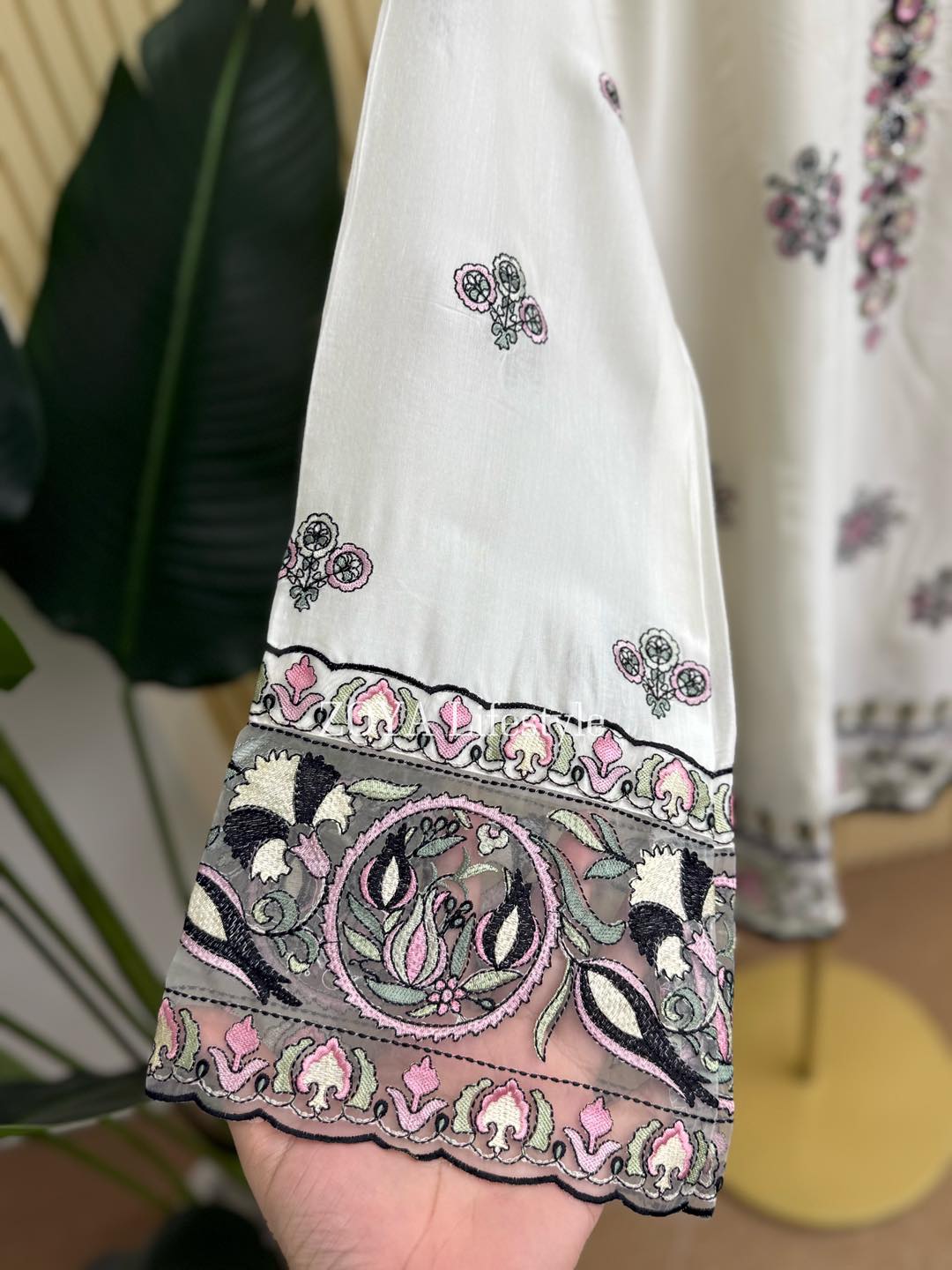Material: Rayon silk Cotton kamiz with embroidery work on full front part and back damaan. Must need to wear inner. Farshi Pant Rayon silk Cotton printed with lace border.