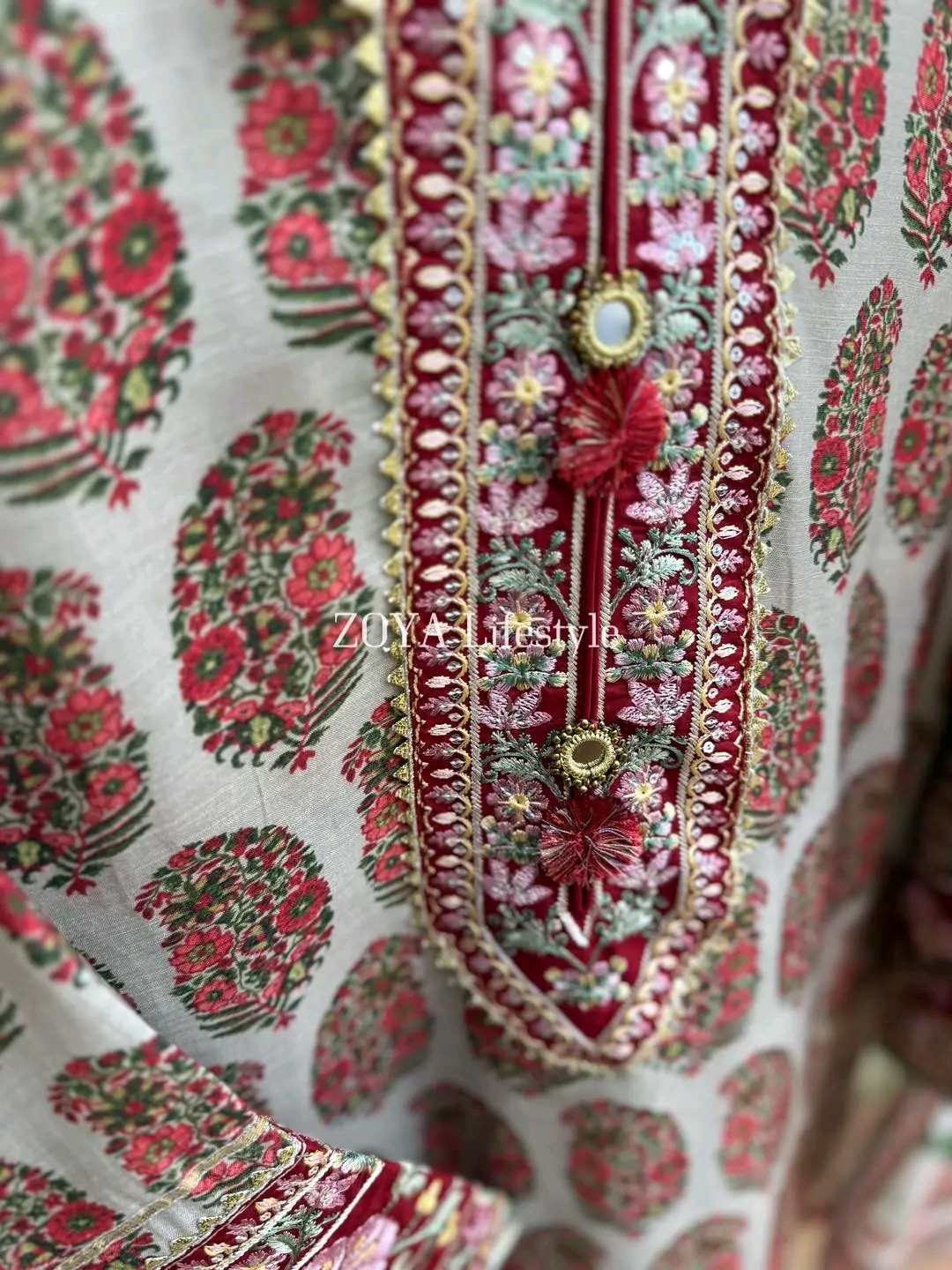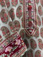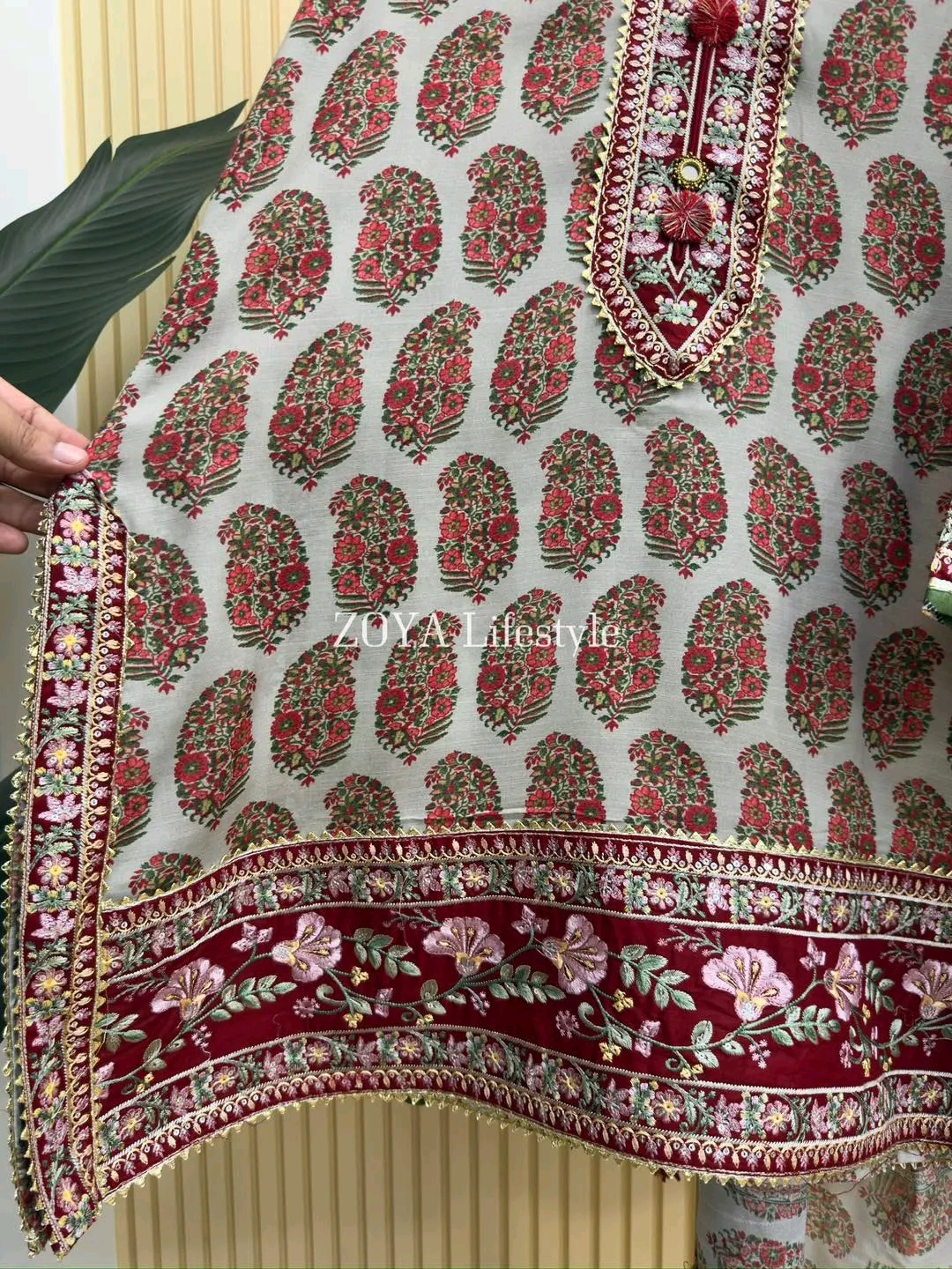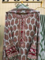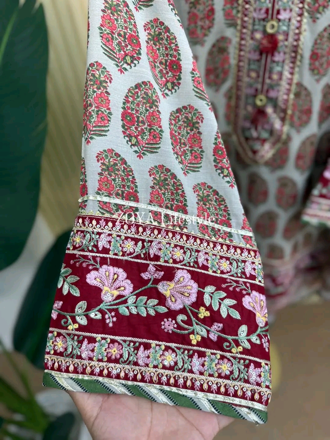 Material: Rayon silk Cotton with sequins embroidery work on neck, sleevee and damaan. Rayon silk Cotton pant with embroidered border. Kota cotton printed orna.