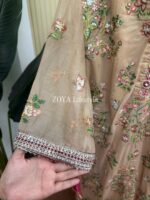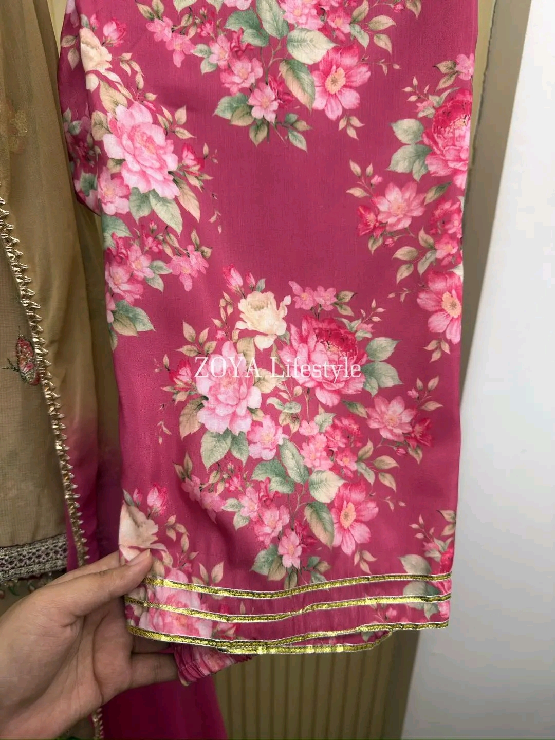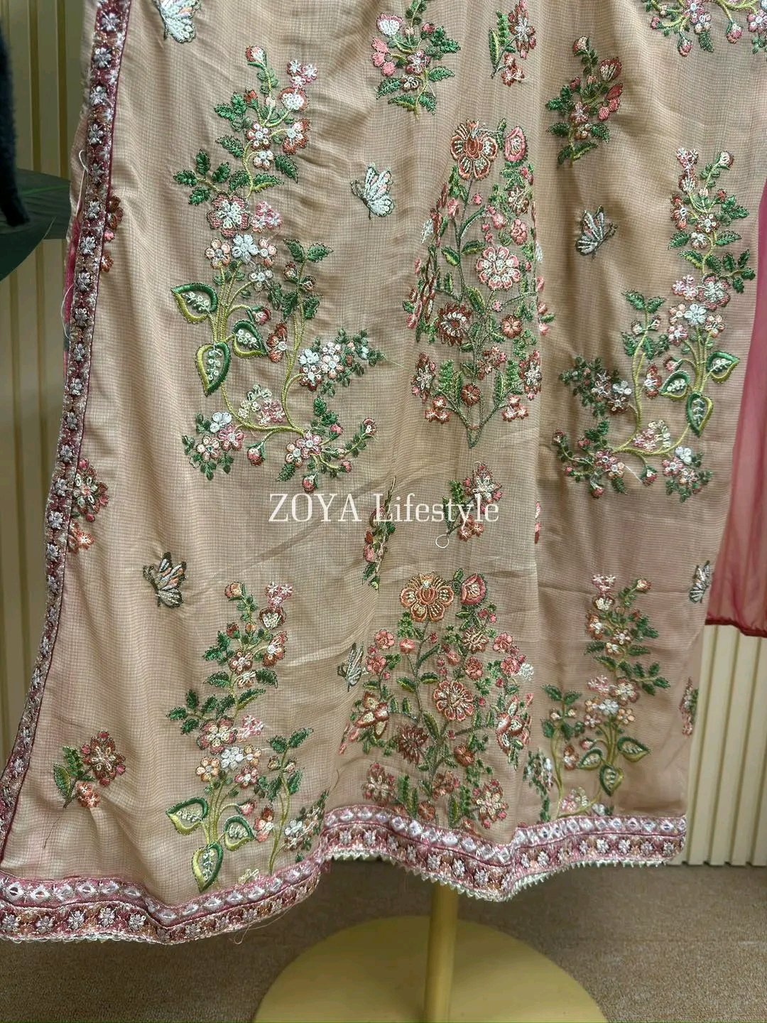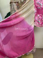 Material: Chiffon with embroidery and sequins work on all over body front. Cotton inner separate. Silk printed skirt pant. Chiffon shaded dupatta with jori lace.